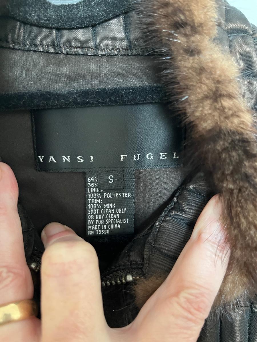 A very chic vest made with quilted brown fabric and dark brown mink and suede trim by Yansi Fugel in a S/M with an adjustable waist.