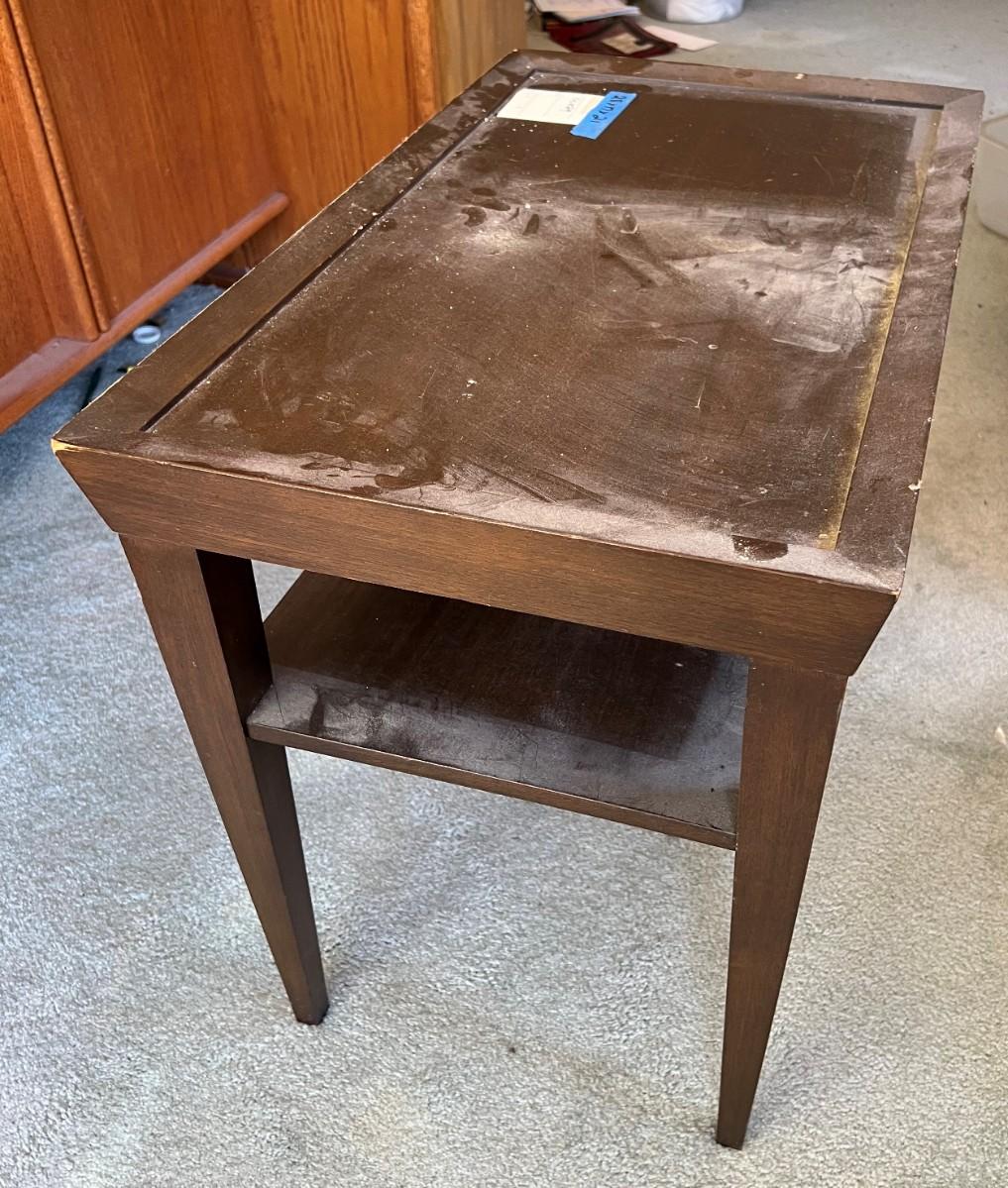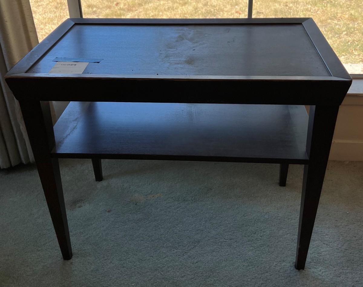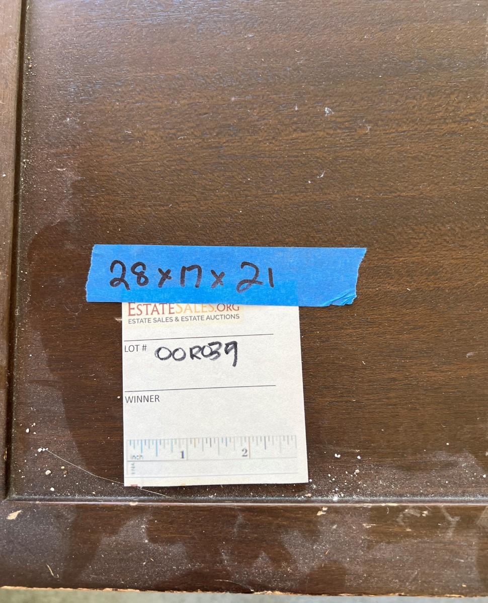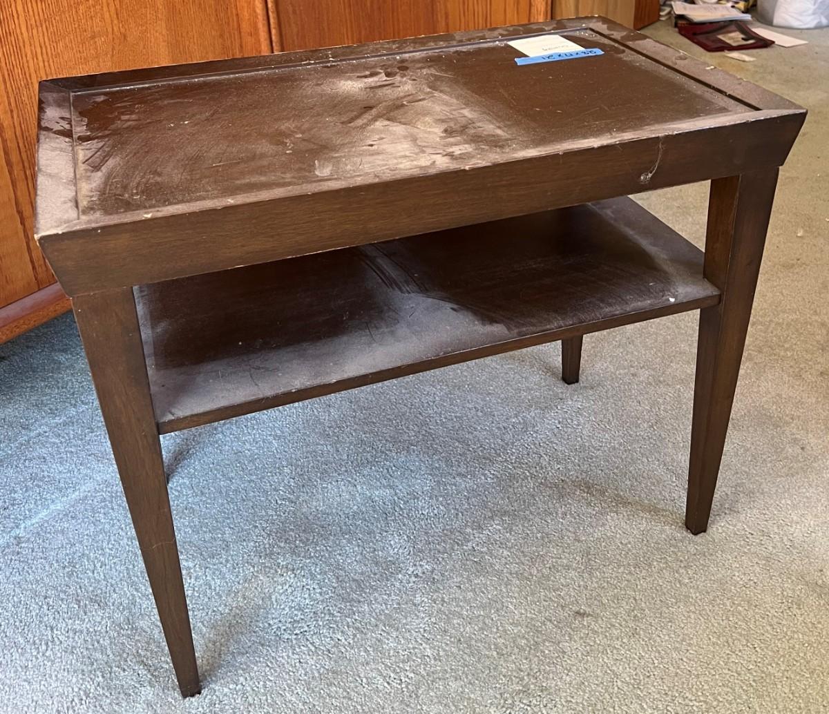 Dark brown wooden tray table, measuring 28 x 17 x 21, needs some dusting