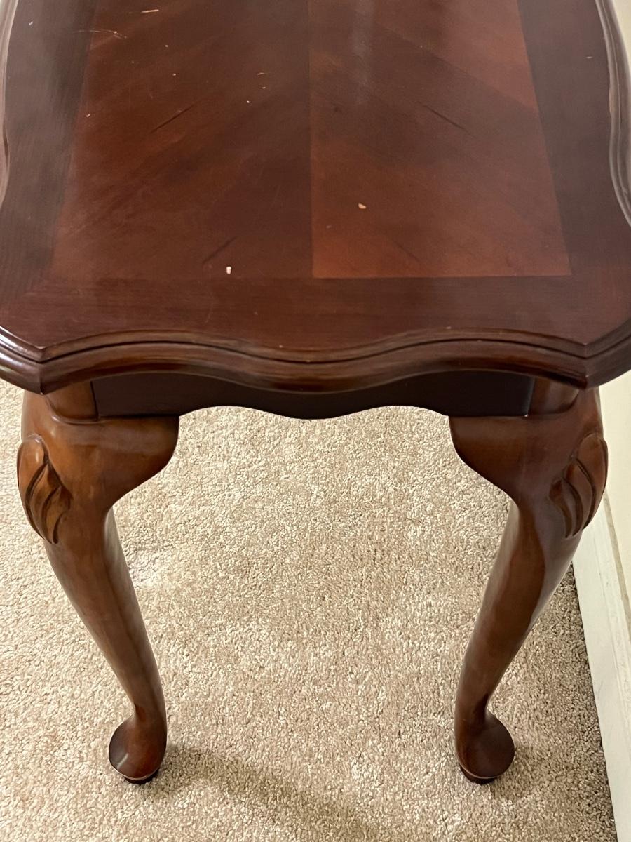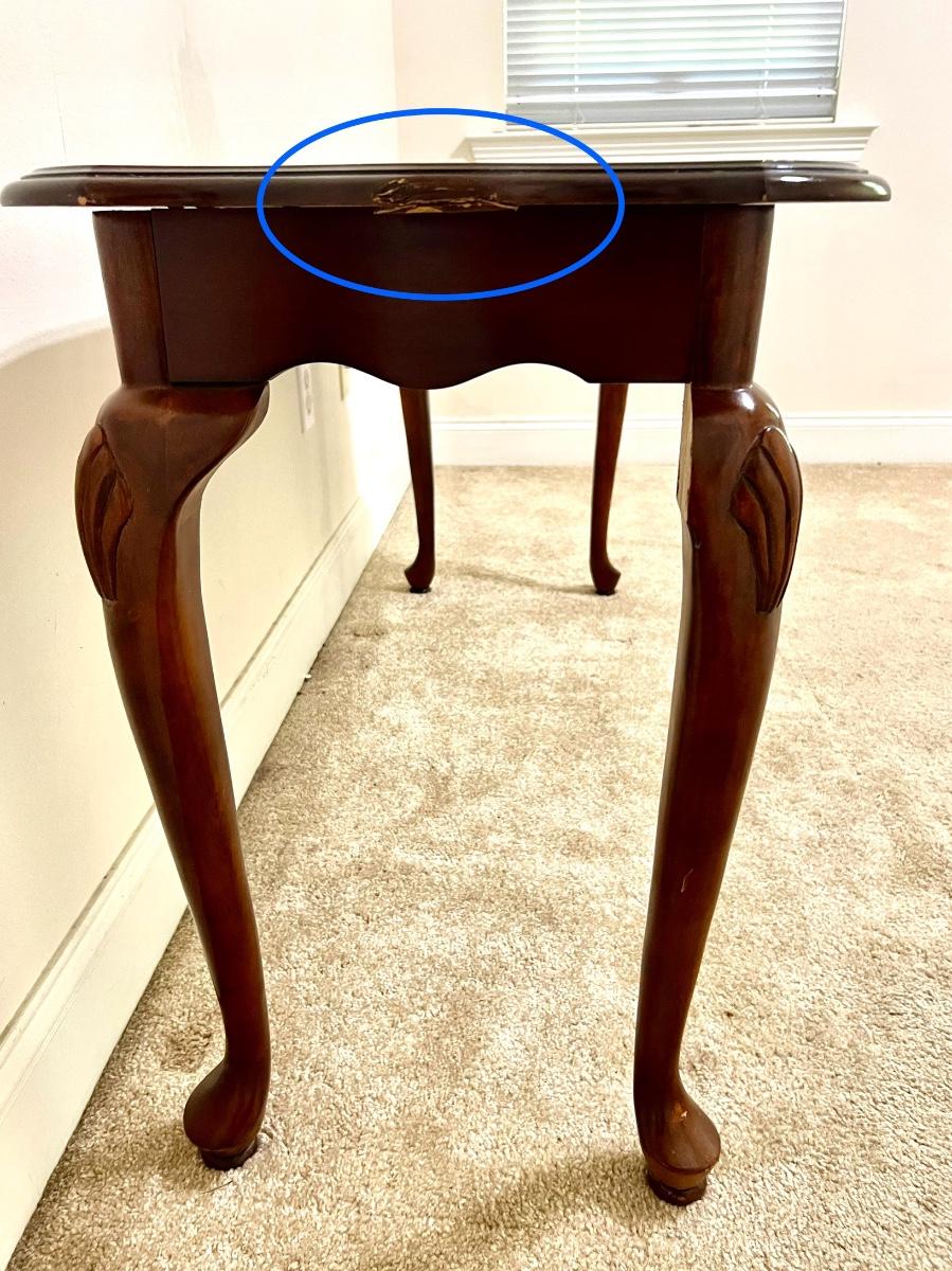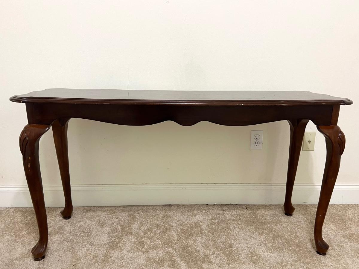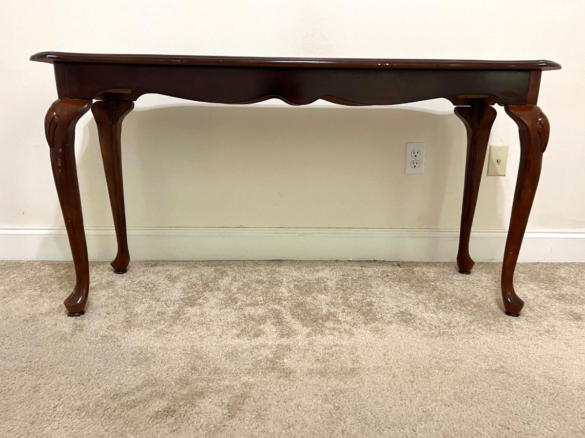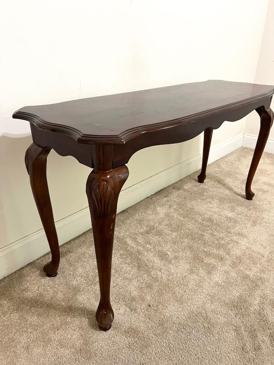 Dark Cherry Sofa Table. Measures 28 inches tall, 18 inches wide and 51 inches long. Table has several knicks and bumps, see pictures. This is being sold as a project piece.