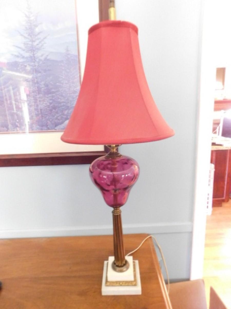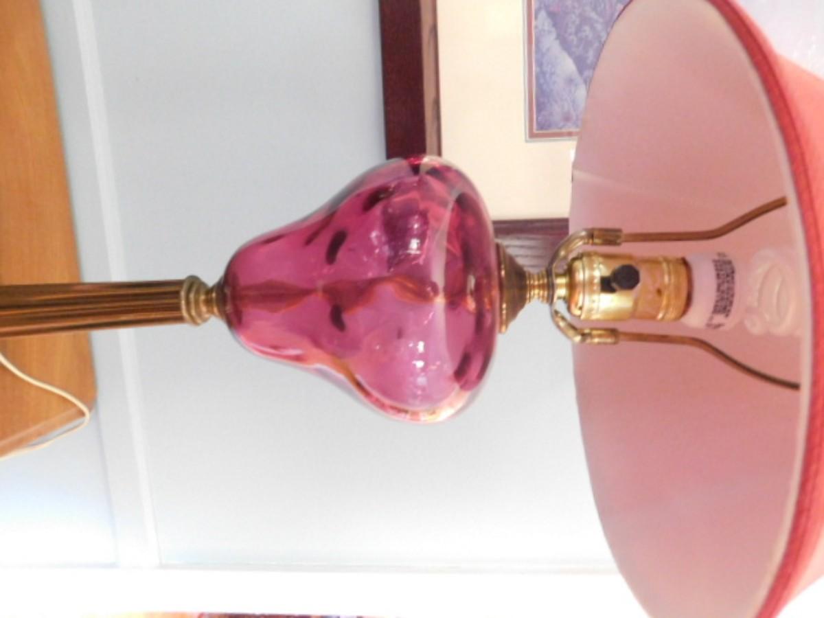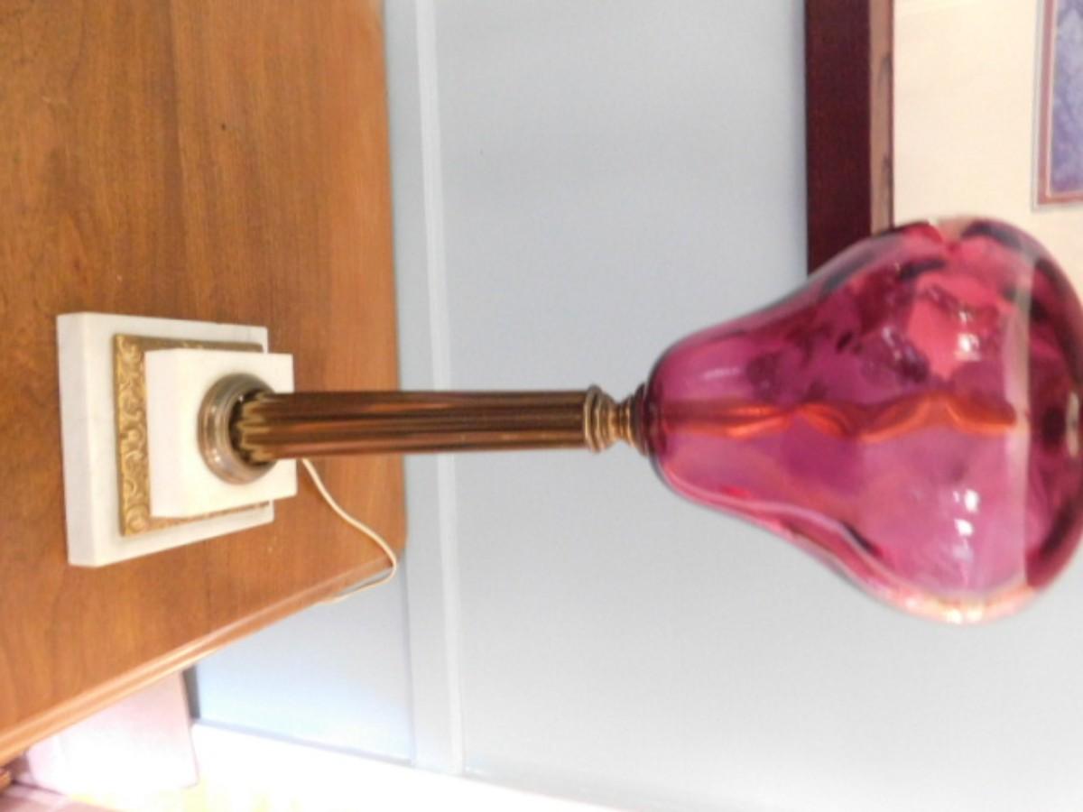 Dark Cranberry Pear-Shaped Glass Post Table Lamp with Brass Finish Fluted Pedestal  (L15)