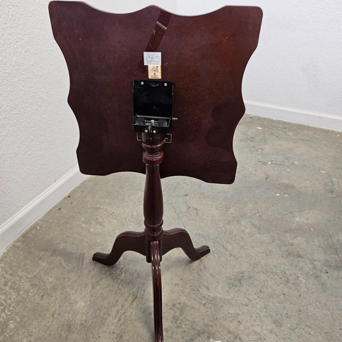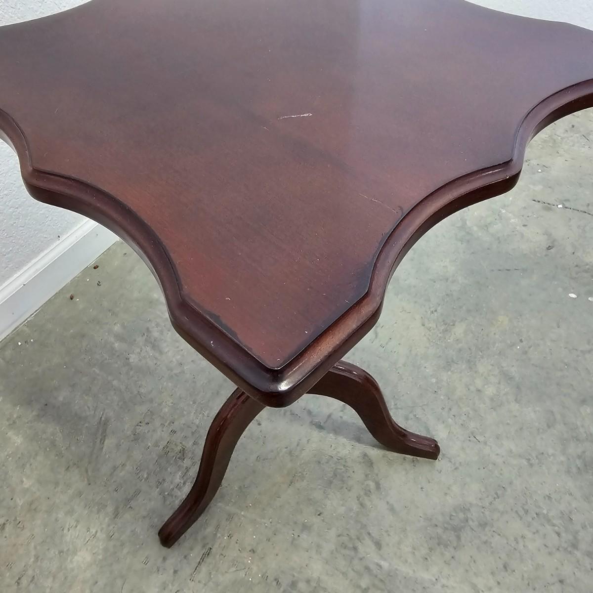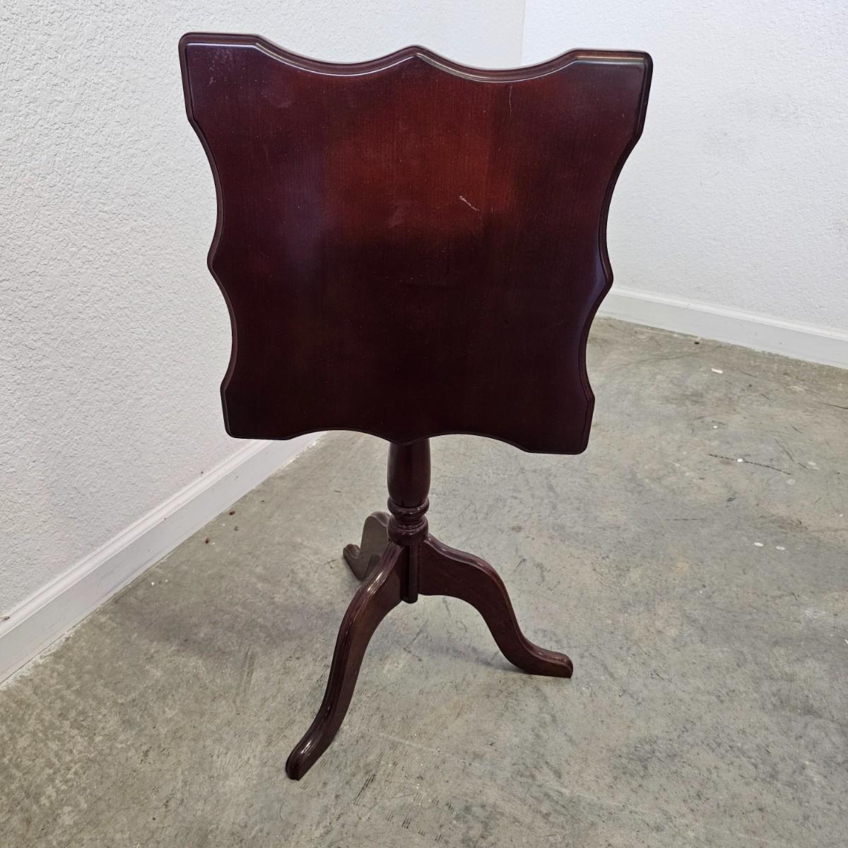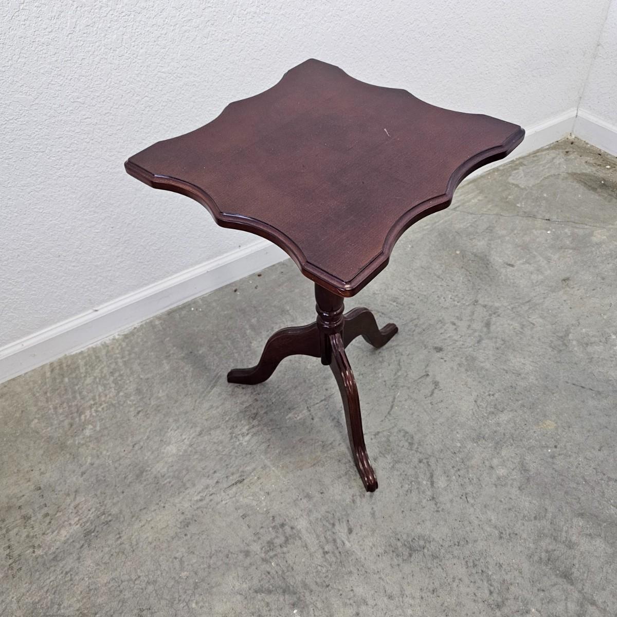 A small scalloped edge tilt top table by the Bombay Company. This elegant tri-leg piece has a dark mahogany color finish, measures 14.5" x 14.5" x 21.5"H. There is a single release tab to turn tabletop vertical. Some small blemishes in top. See photos for details. Local pickup only.