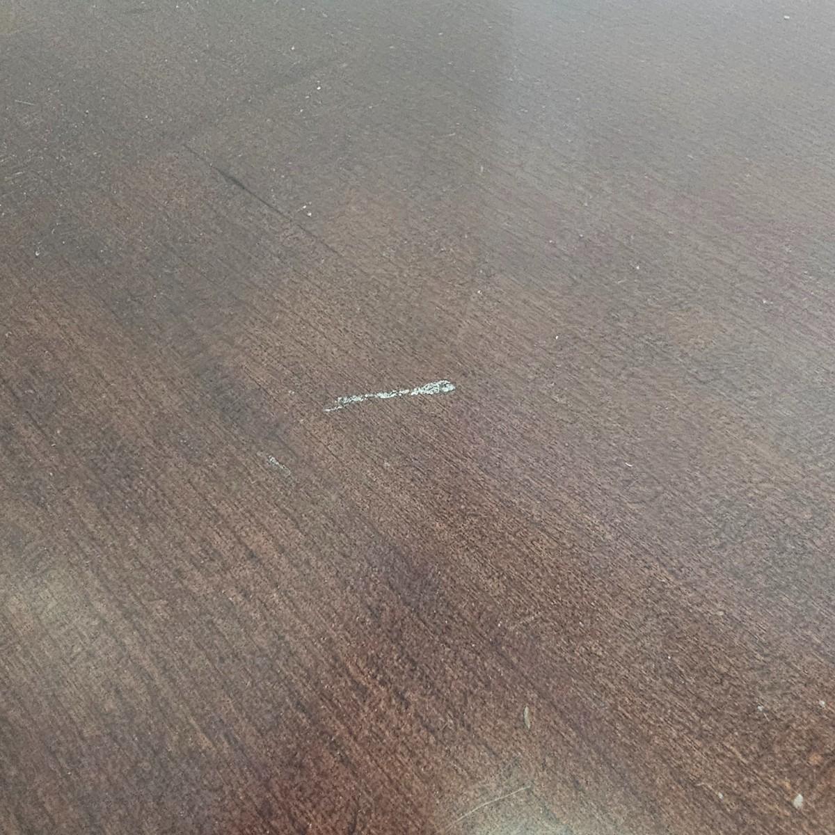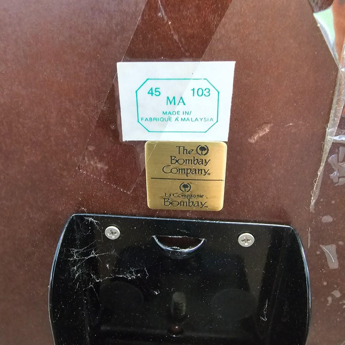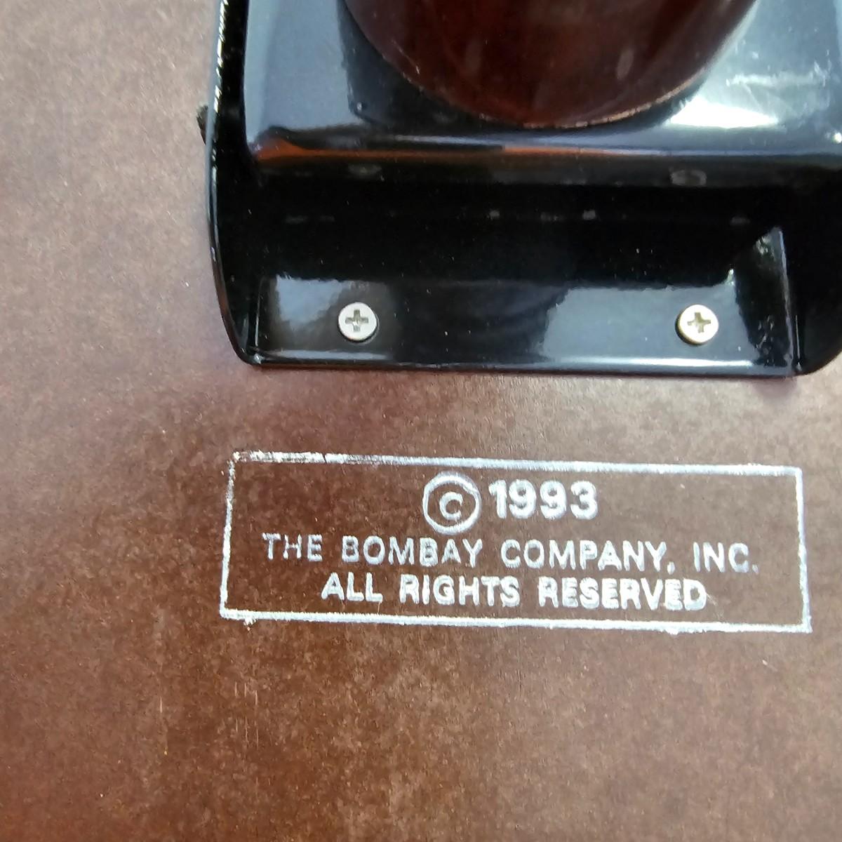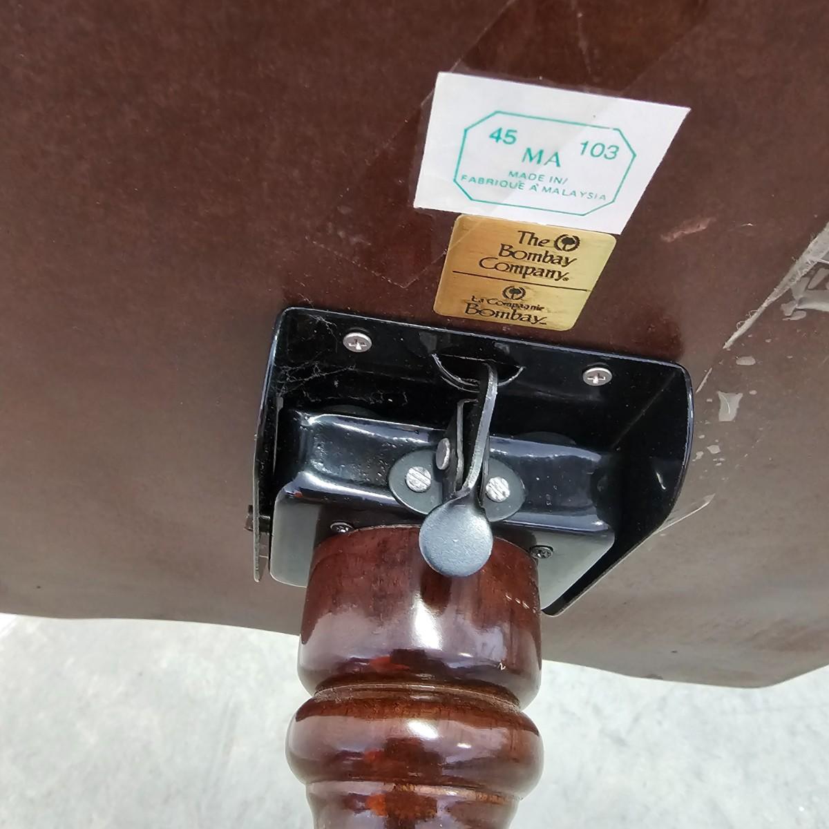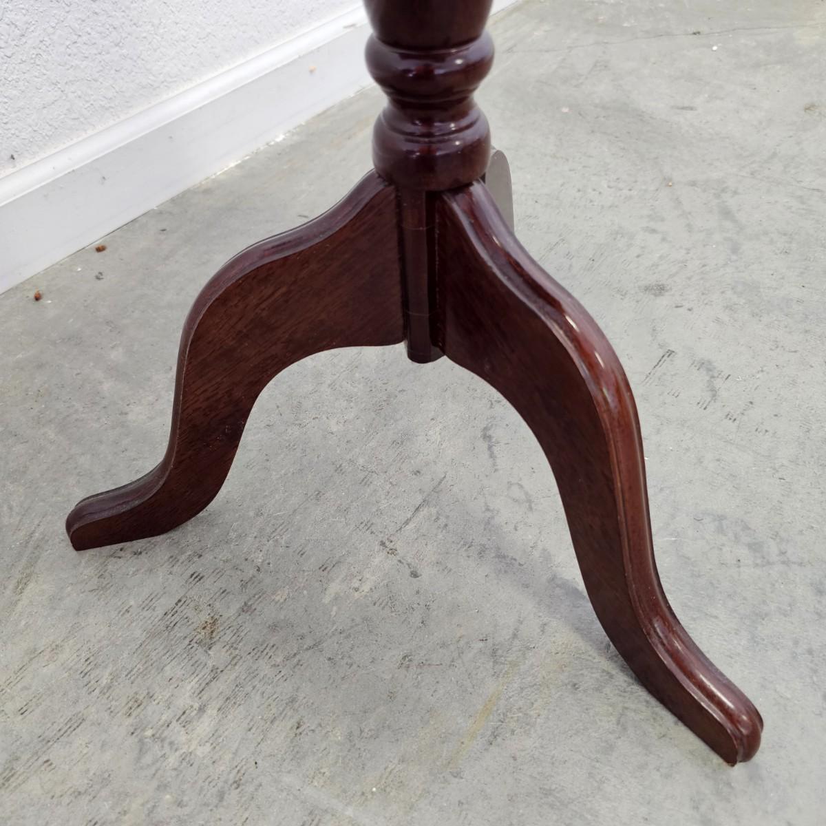 A small scalloped edge tilt top table by the Bombay Company. This elegant tri-leg piece has a dark mahogany color finish, measures 14.5" x 14.5" x 21.5"H. There is a single release tab to turn tabletop vertical. Some small blemishes in top. See photos for details. Local pickup only.