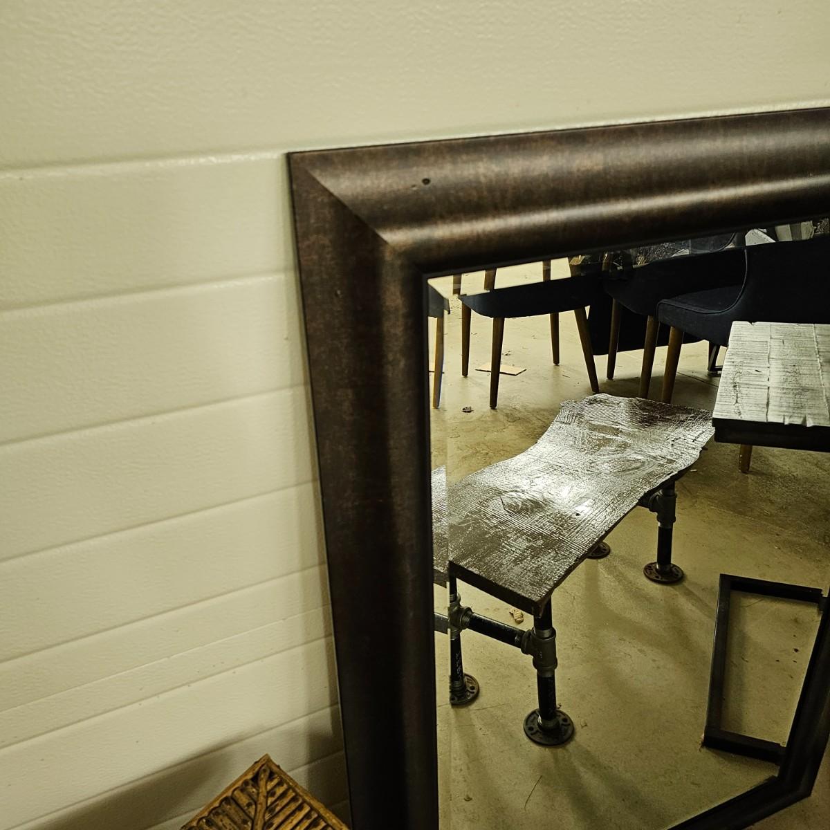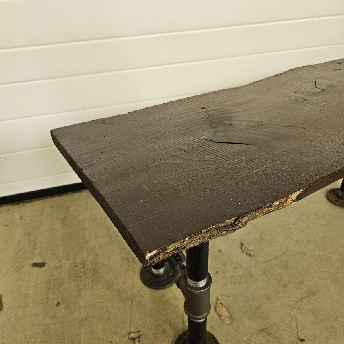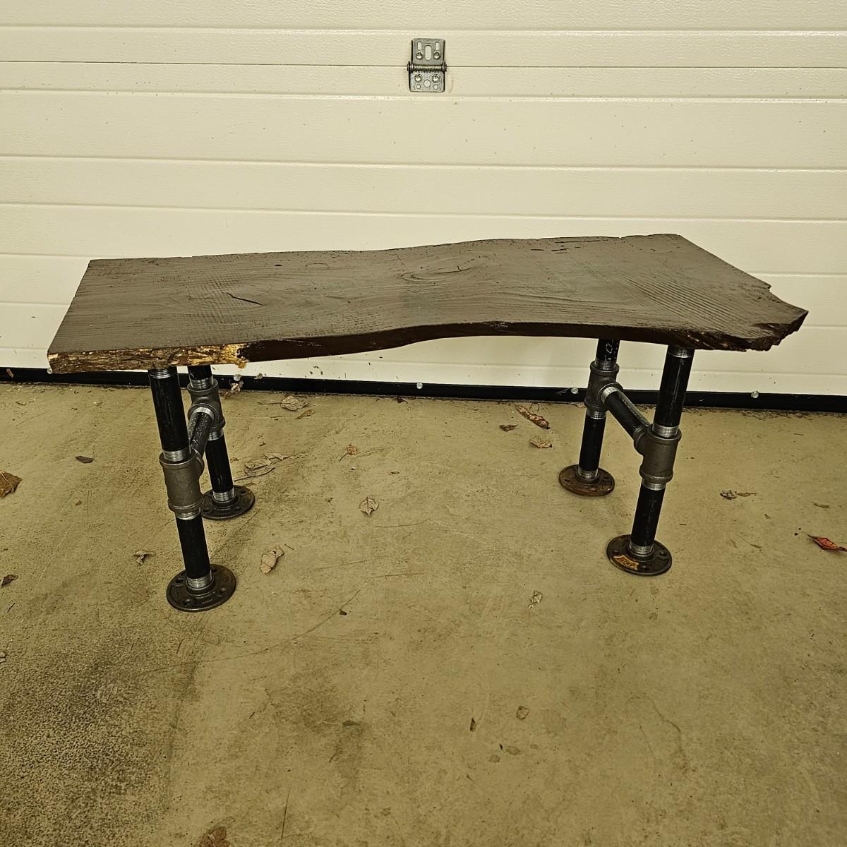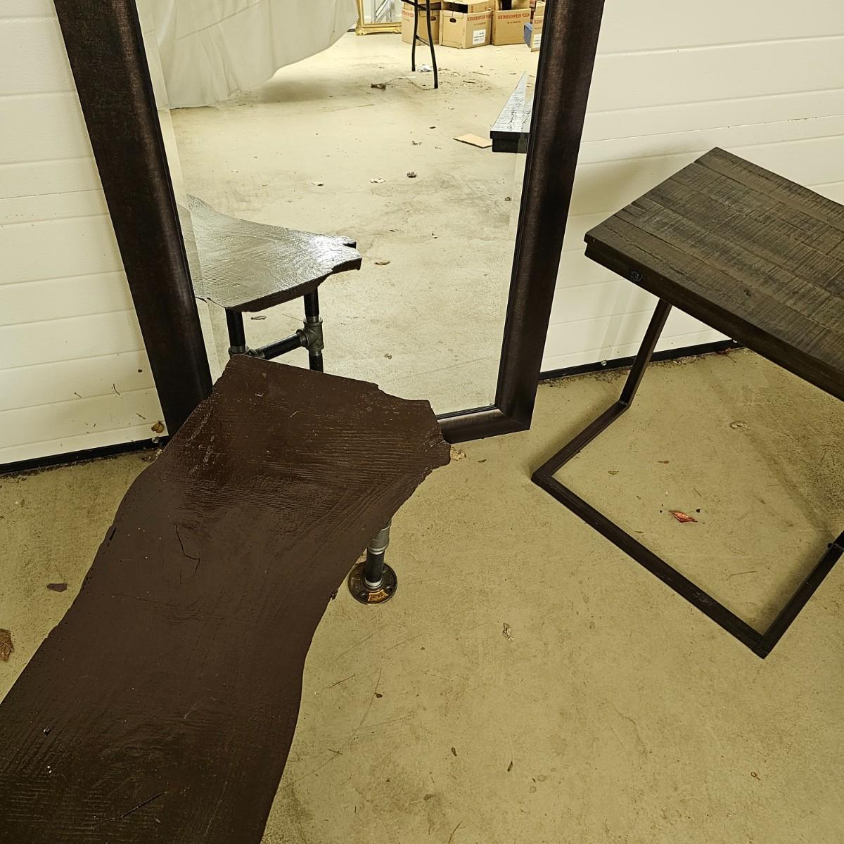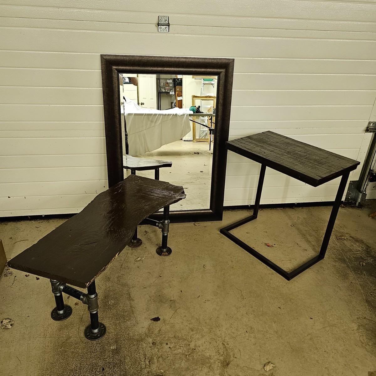 One wall mirror with dark patterned resin frame, a sofa side table made of wood and metal and a rustic made coffee table with pipe legs and a wooden top. Mirror measures 31" x 13", sofa table is 16" x 24" x 25"H and rustic piece is 36" x 16" x 16"H. See photos for details. Local pickup only.