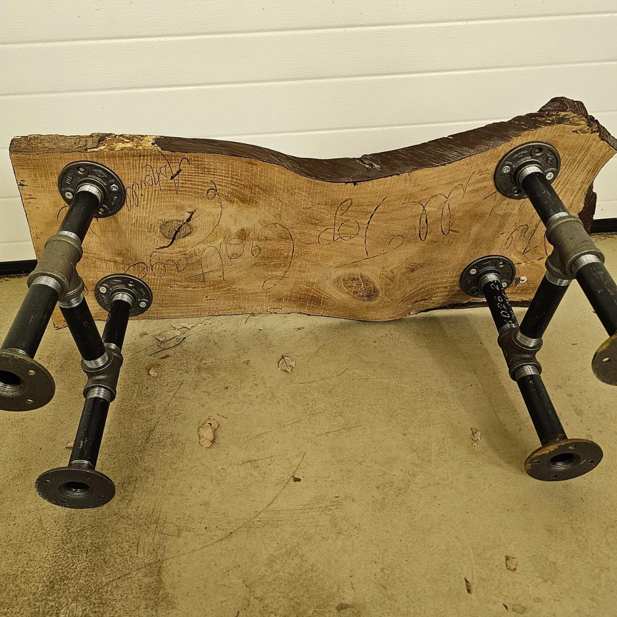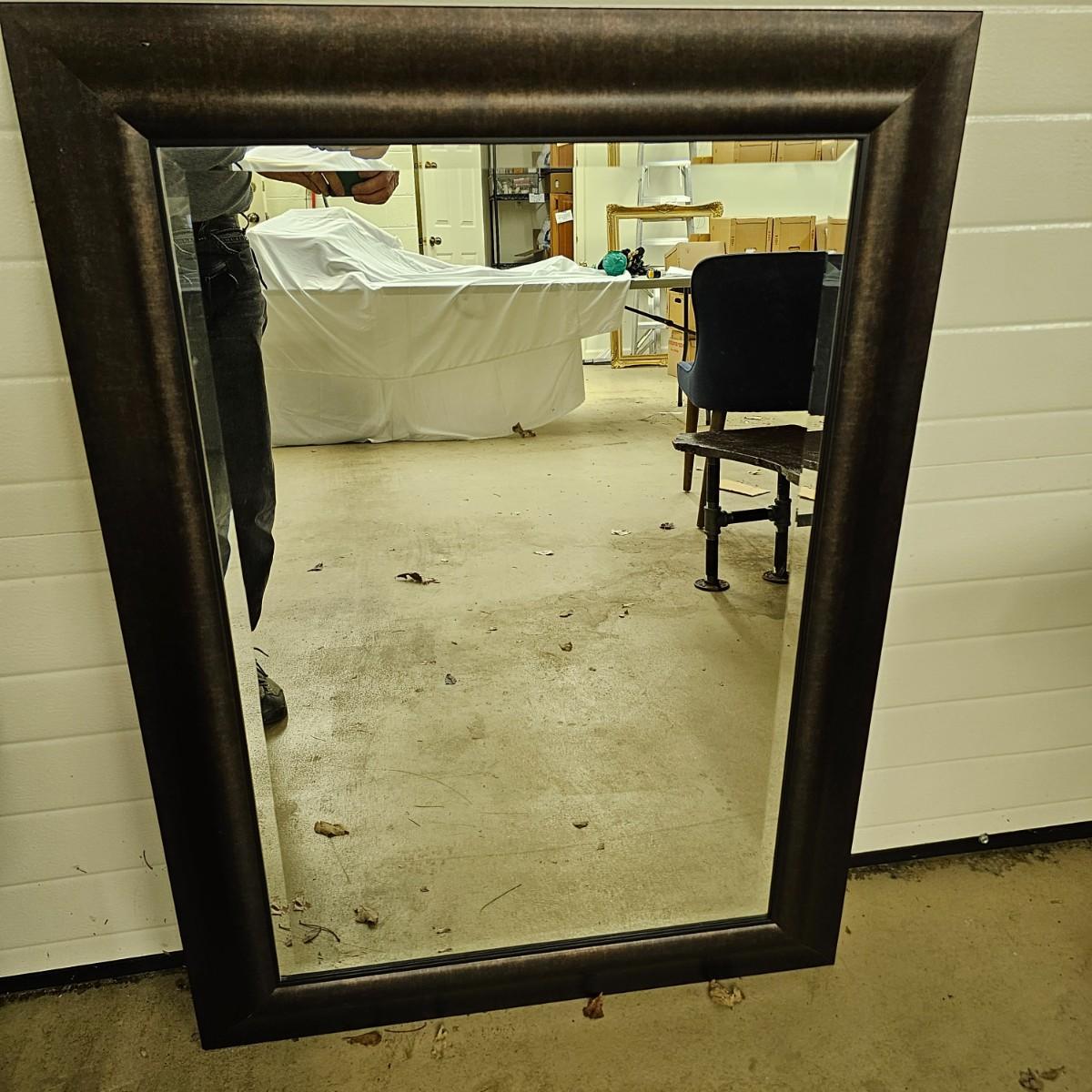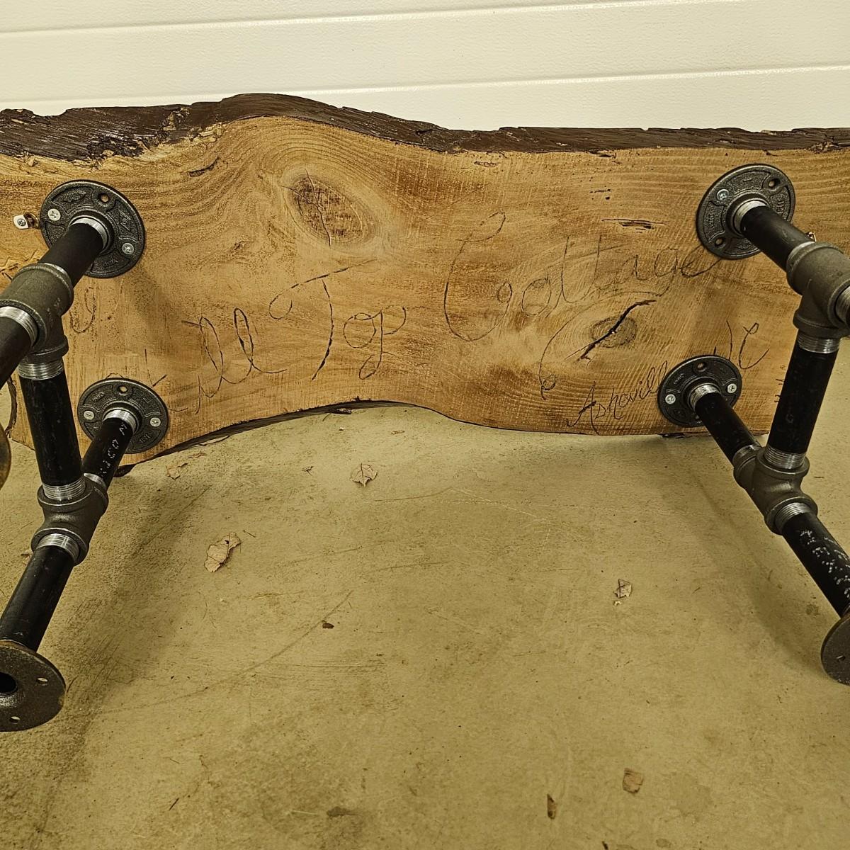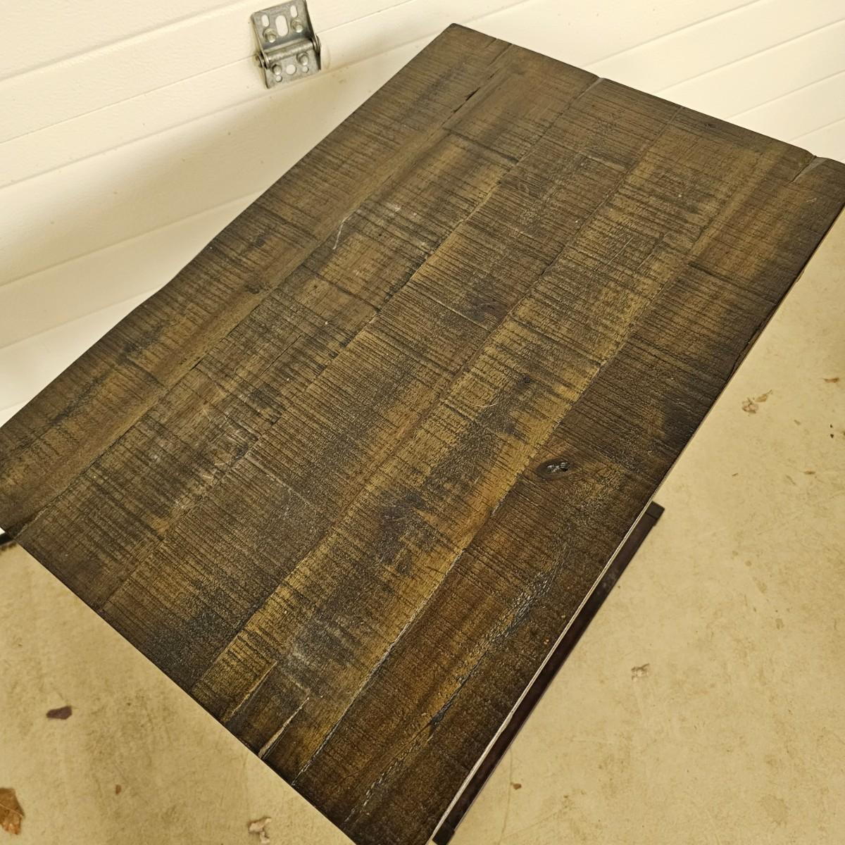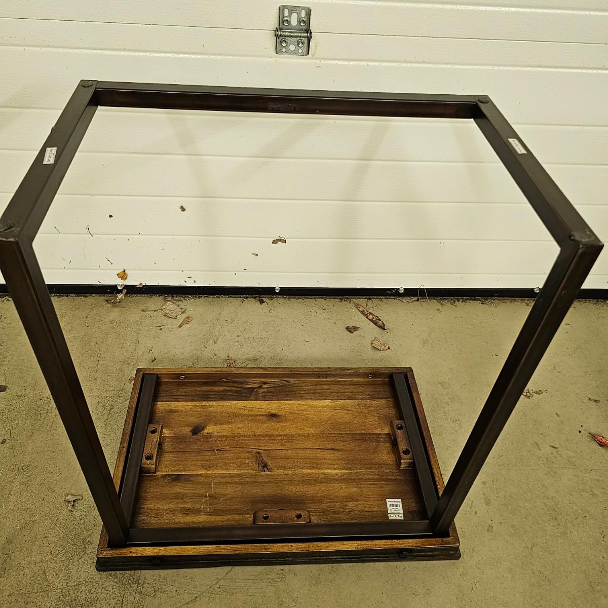 One wall mirror with dark patterned resin frame, a sofa side table made of wood and metal and a rustic made coffee table with pipe legs and a wooden top. Mirror measures 31" x 13", sofa table is 16" x 24" x 25"H and rustic piece is 36" x 16" x 16"H. See photos for details. Local pickup only.