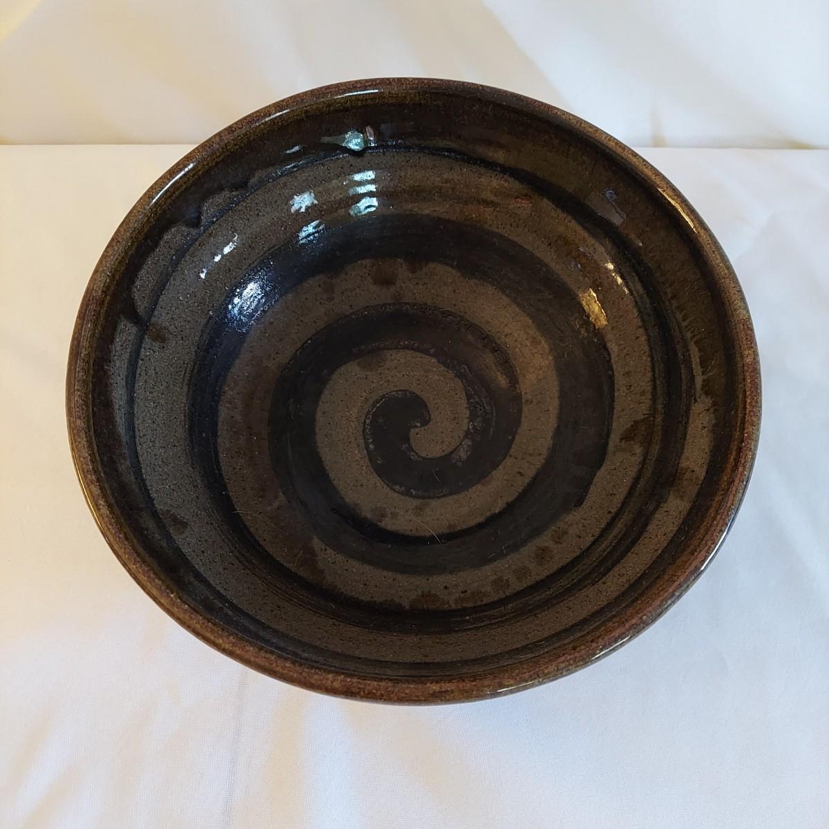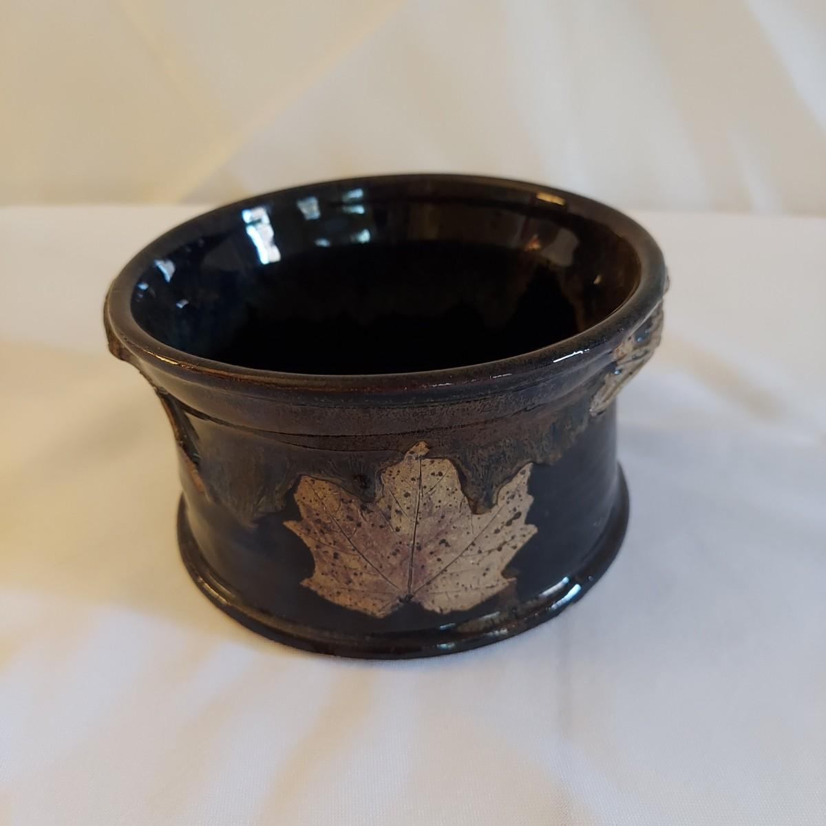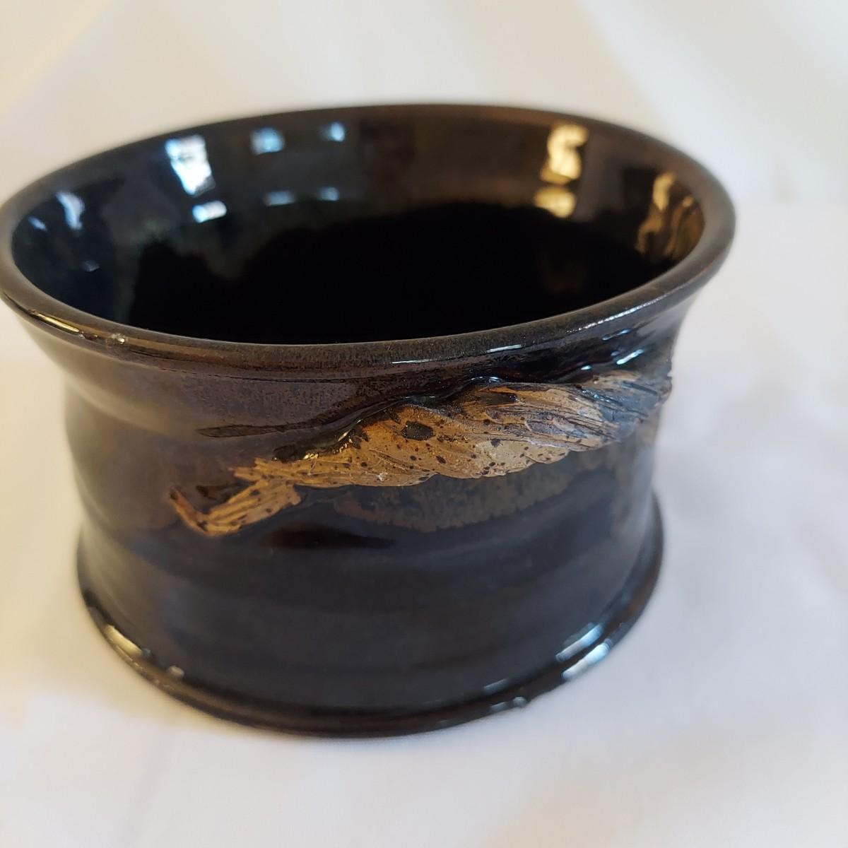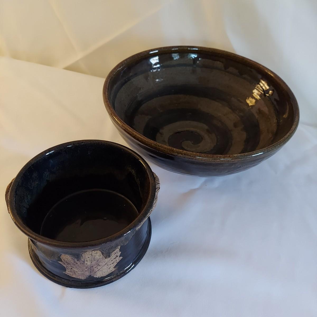 Two ceramic bowls with dark glazes. The small bowl with leaf print has a 5"D. The large bowl with swirl has a 9"D. Both pieces are signed but cannot be identified, though one appears to have been made by a local Asheville artist. Shipping available