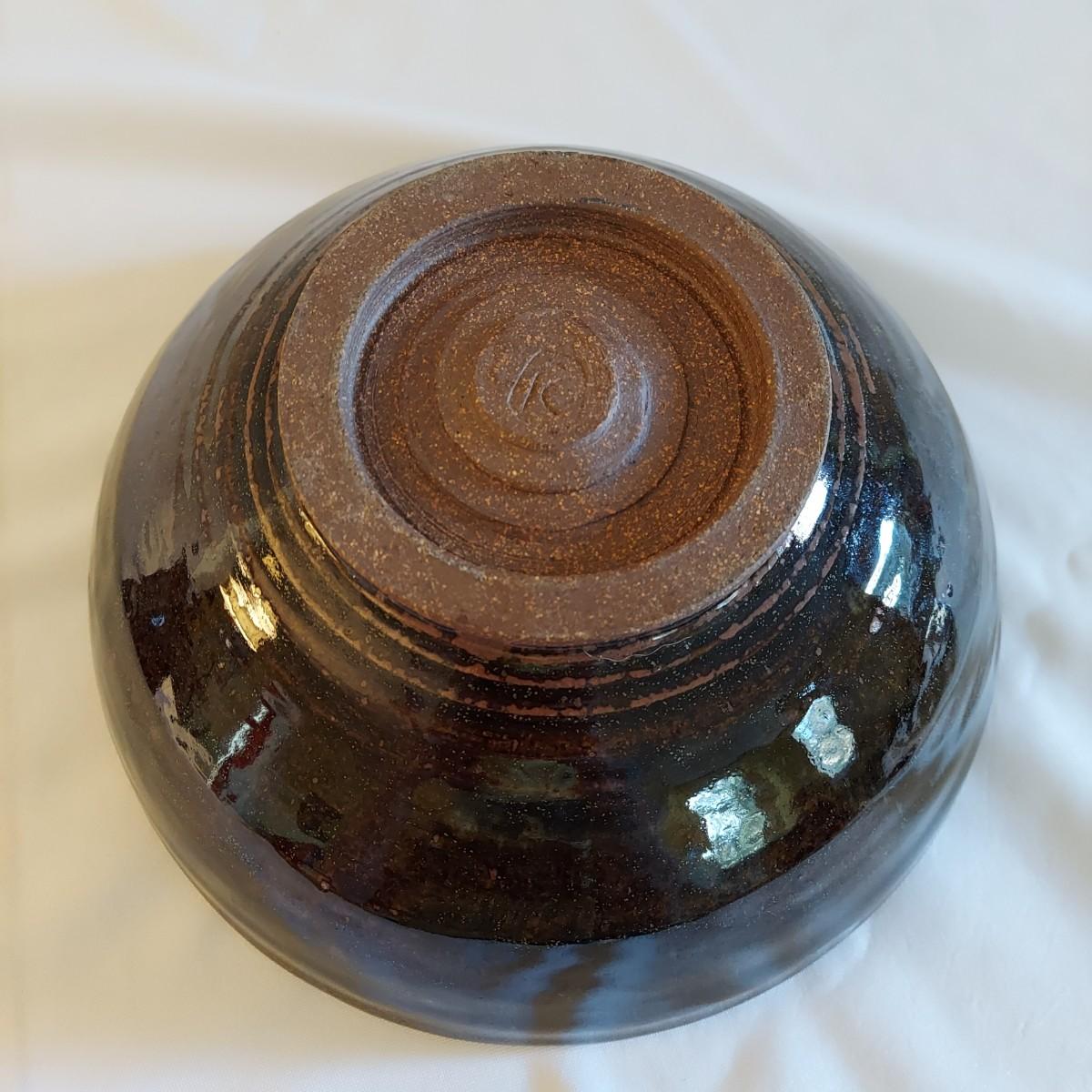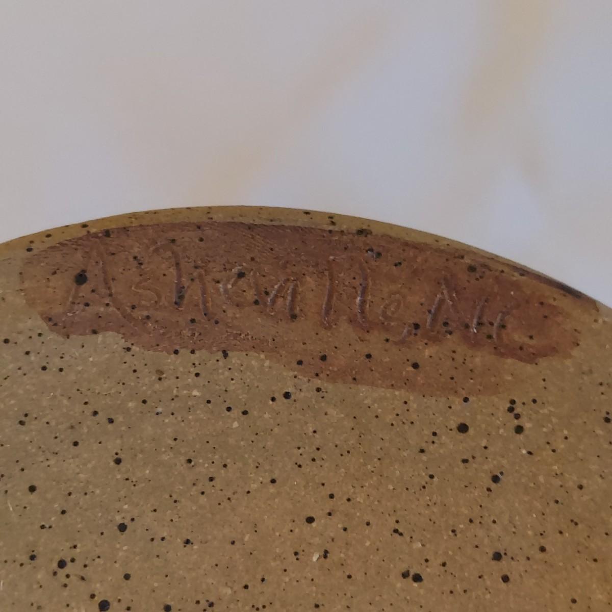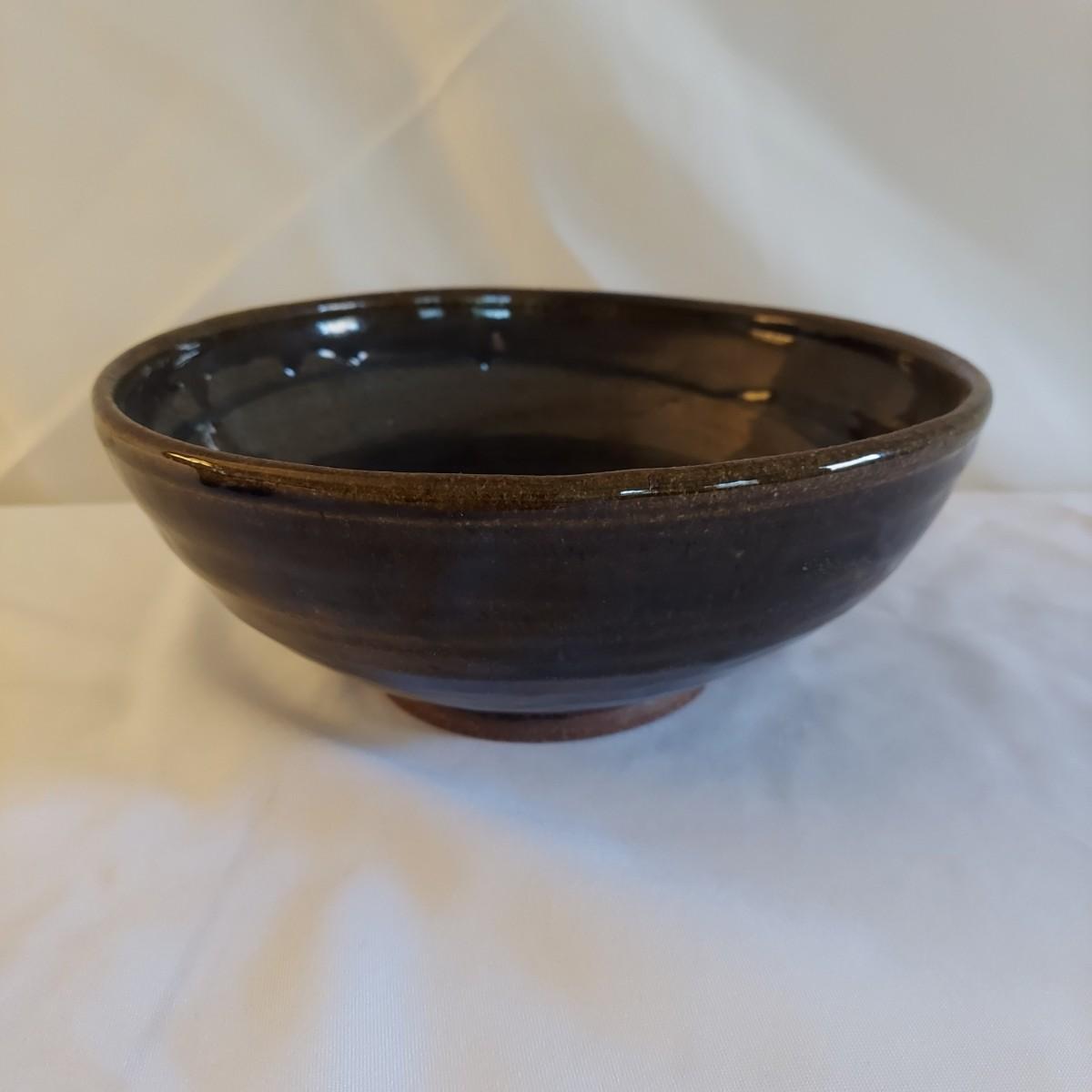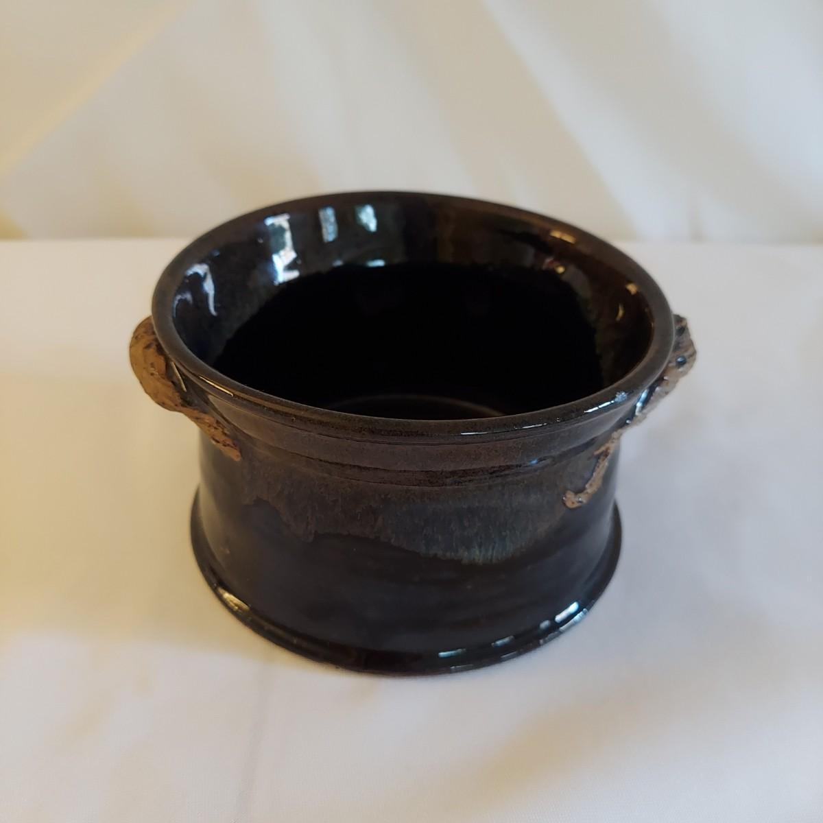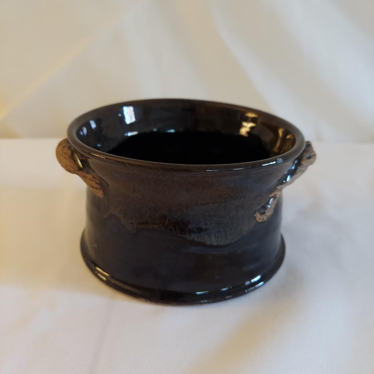 Two ceramic bowls with dark glazes. The small bowl with leaf print has a 5"D. The large bowl with swirl has a 9"D. Both pieces are signed but cannot be identified, though one appears to have been made by a local Asheville artist. Shipping available