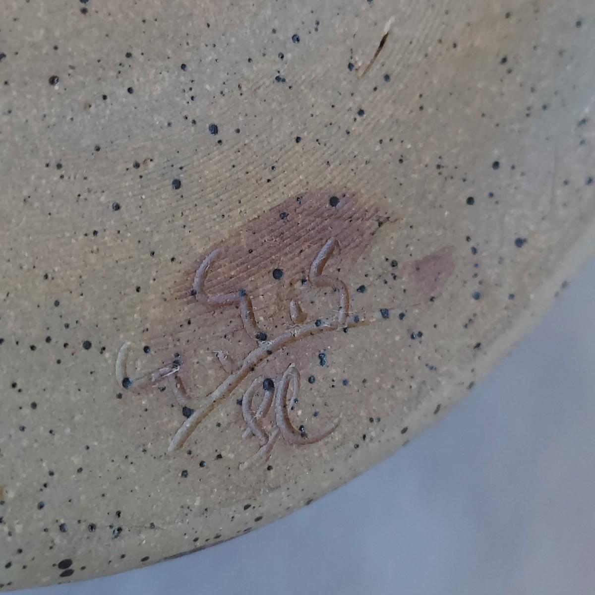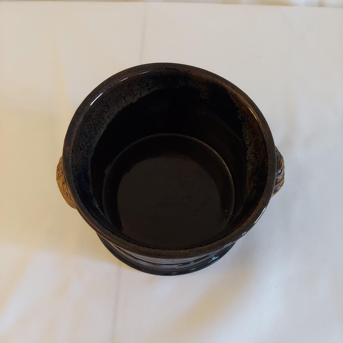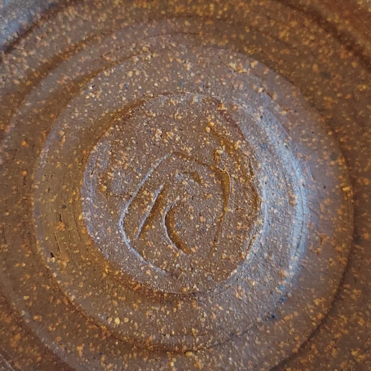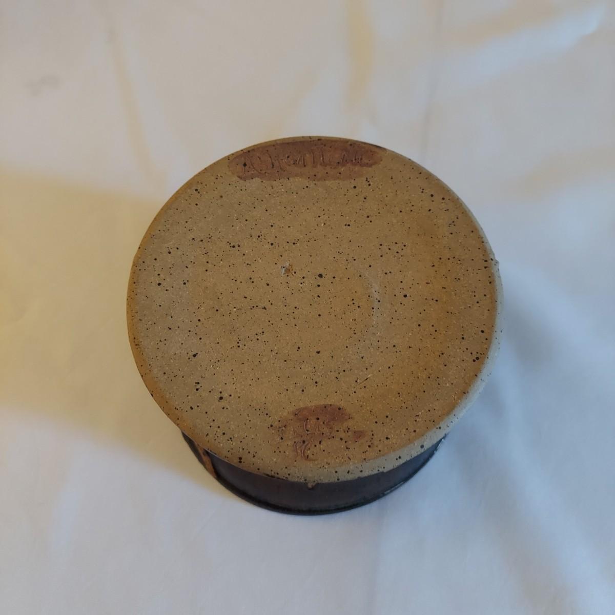 Two ceramic bowls with dark glazes. The small bowl with leaf print has a 5"D. The large bowl with swirl has a 9"D. Both pieces are signed but cannot be identified, though one appears to have been made by a local Asheville artist. Shipping available