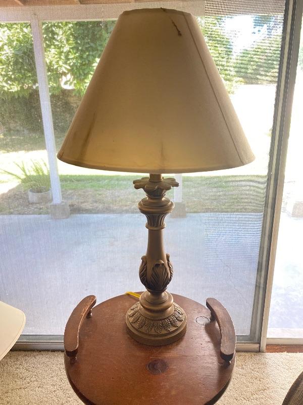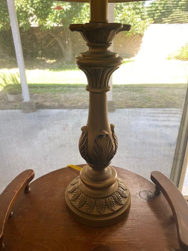 Table Lamp with shade. Dark gold color base. Shade has some discoloration. Stands 24” with shade.