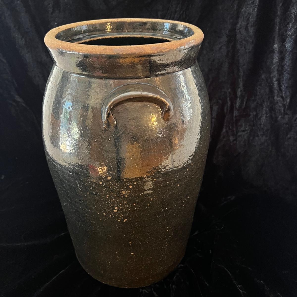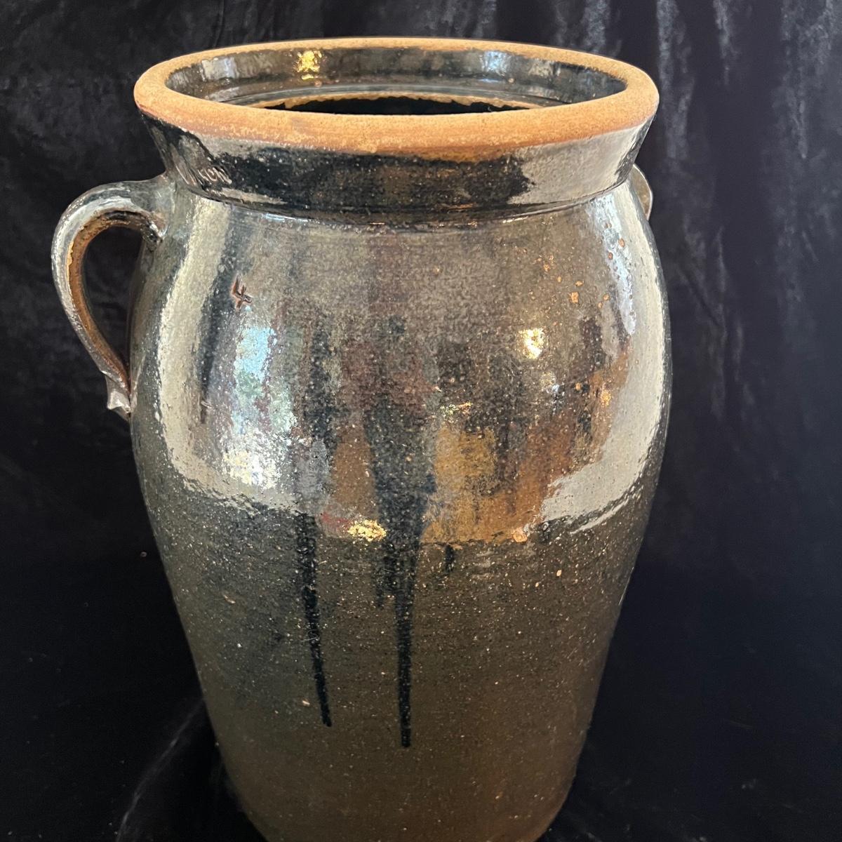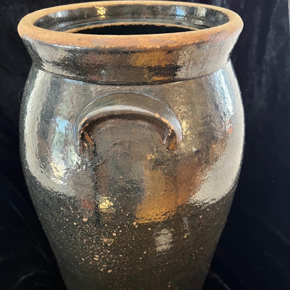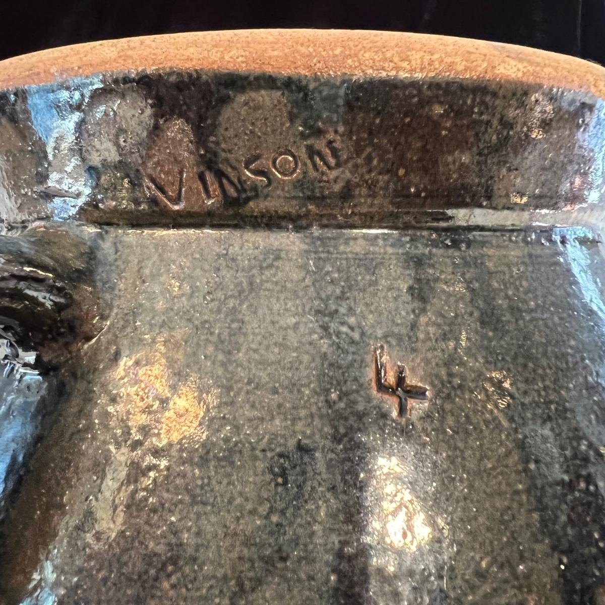 Beautiful traditional urn. Marked “Vinson 4” as shown in the pictures. The main glaze is a dark olive green with a black glaze dripping from the lid down the side as shown in the pictures. Please note the small chip at the bottom of the urn. It measures 15.5”H x 7.5”D. Shipping available. Shipping art can be costly. We suggest calling our local UPS with dimensions and getting an estimate before bidding: (828) 252-6930.