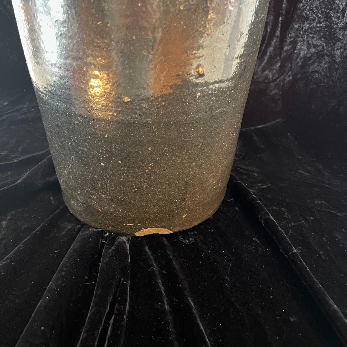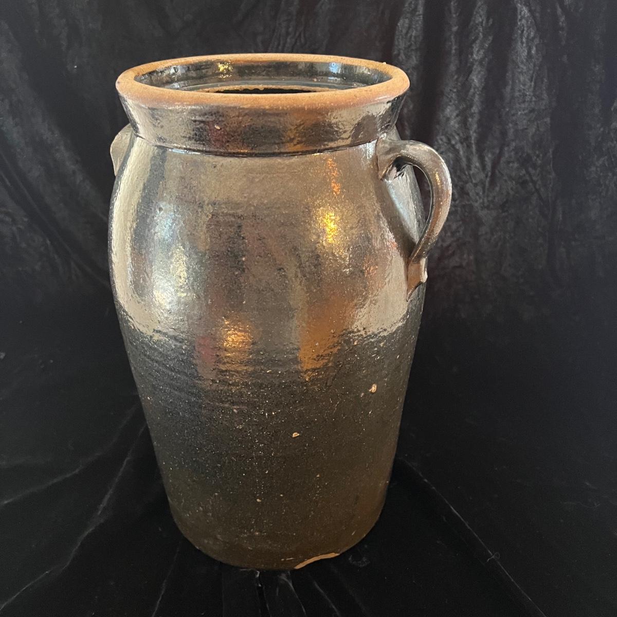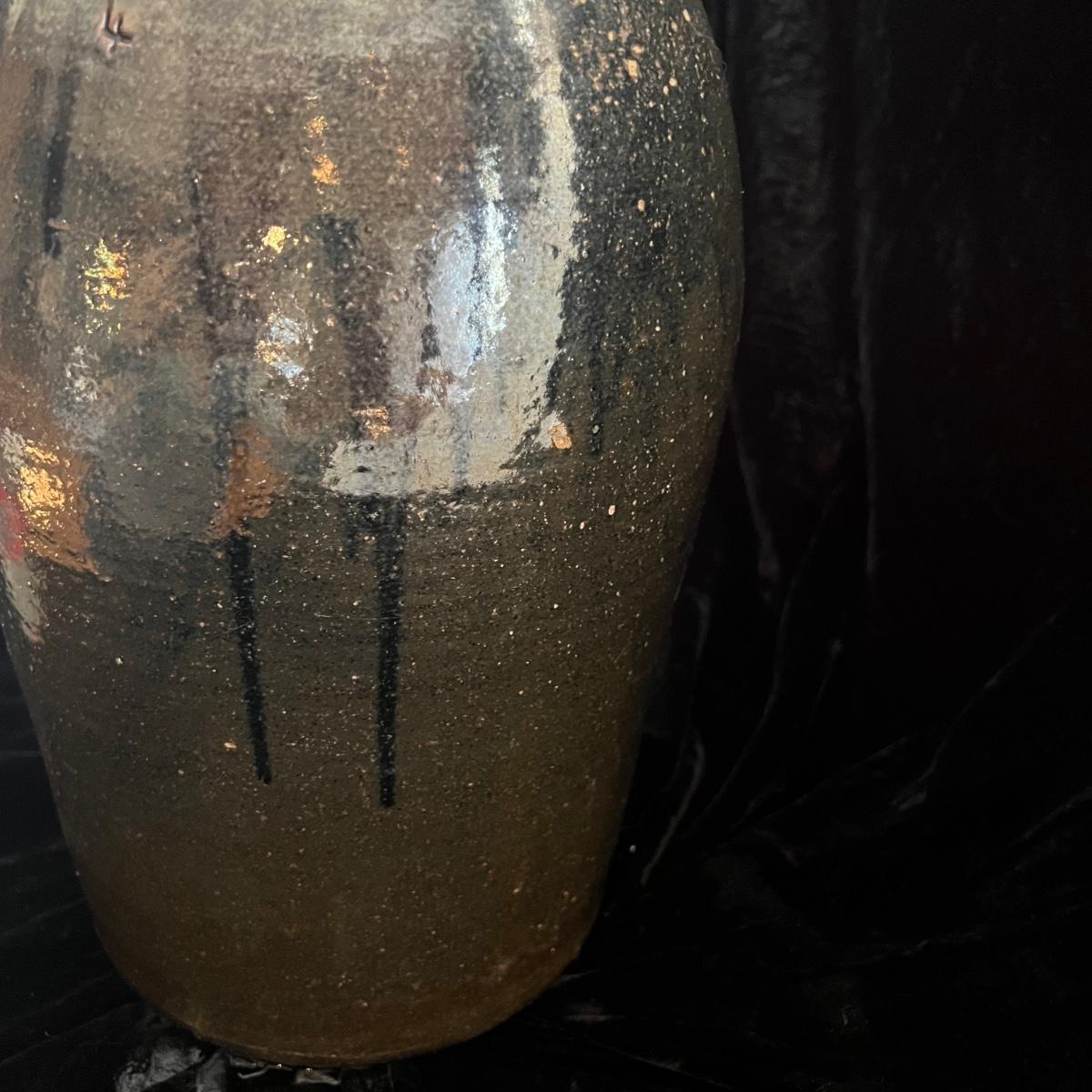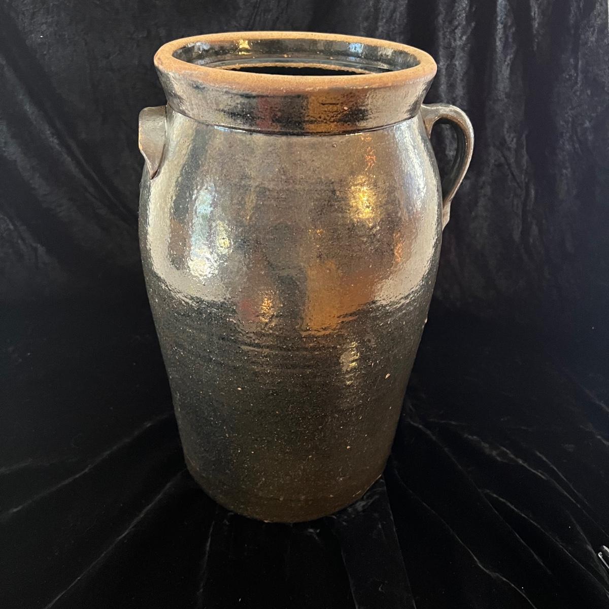 Beautiful traditional urn. Marked “Vinson 4” as shown in the pictures. The main glaze is a dark olive green with a black glaze dripping from the lid down the side as shown in the pictures. Please note the small chip at the bottom of the urn. It measures 15.5”H x 7.5”D. Shipping available. Shipping art can be costly. We suggest calling our local UPS with dimensions and getting an estimate before bidding: (828) 252-6930.