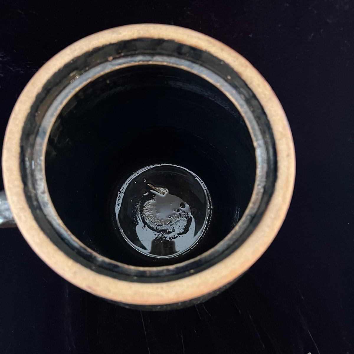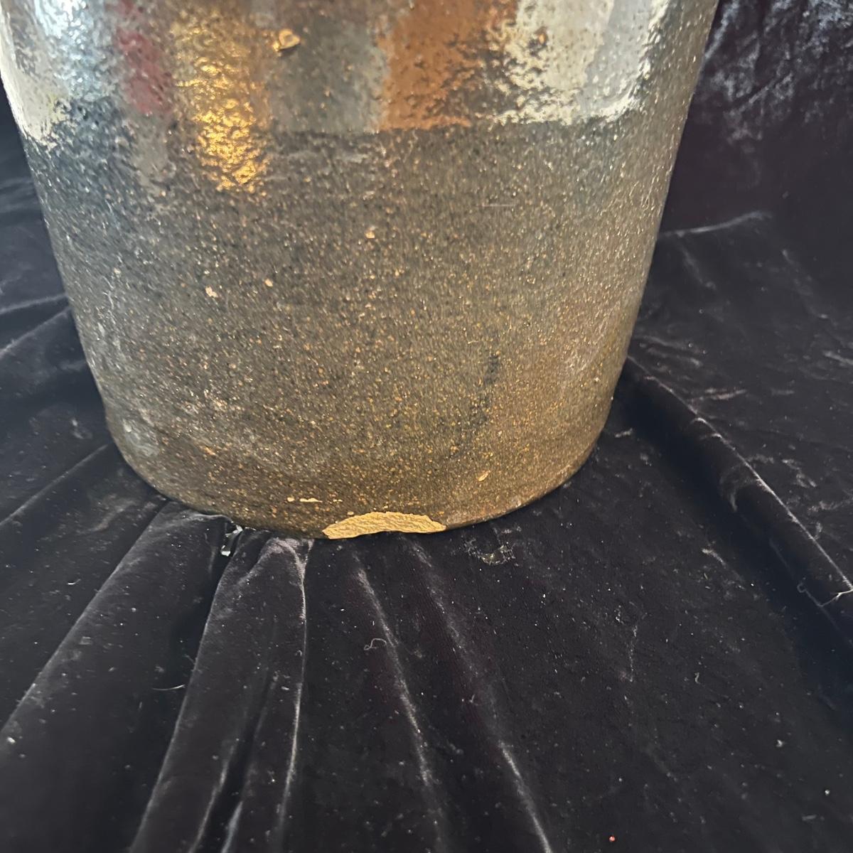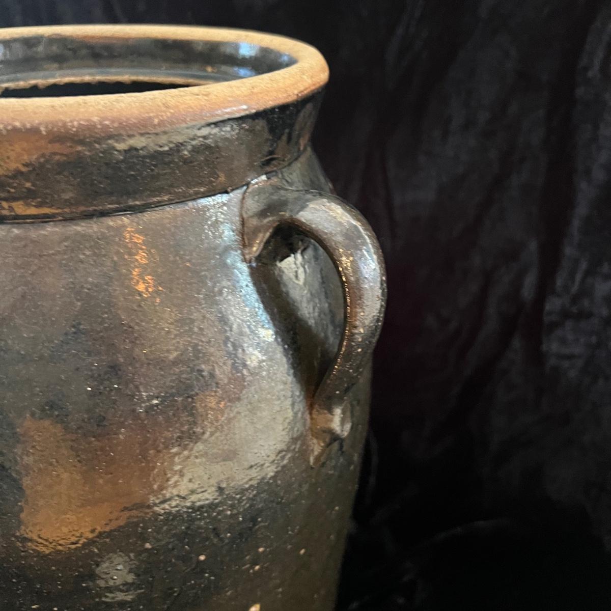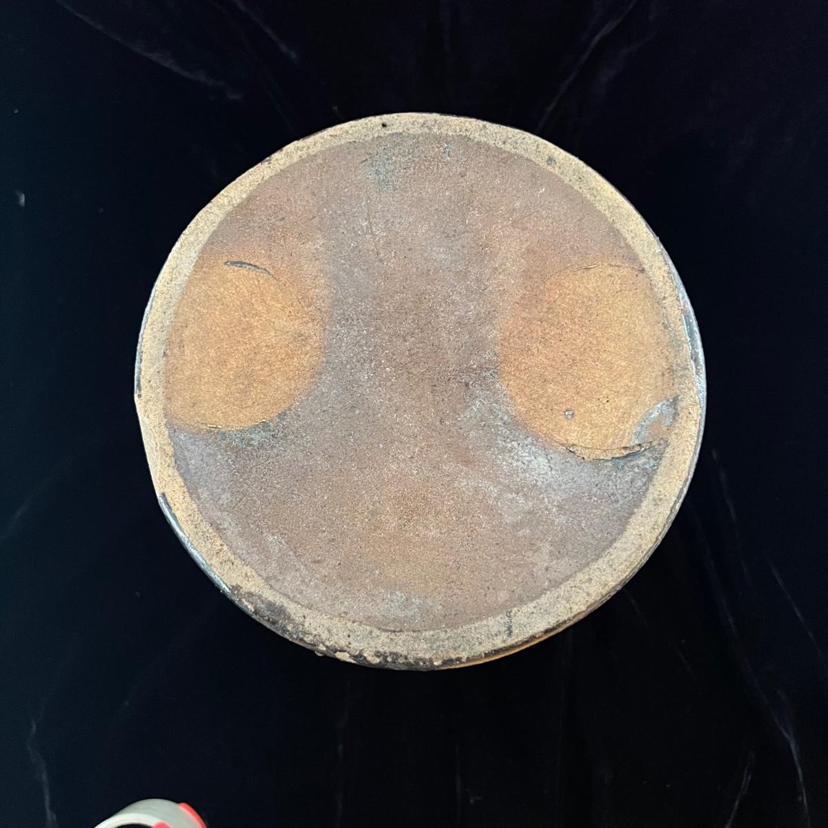 Beautiful traditional urn. Marked “Vinson 4” as shown in the pictures. The main glaze is a dark olive green with a black glaze dripping from the lid down the side as shown in the pictures. Please note the small chip at the bottom of the urn. It measures 15.5”H x 7.5”D. Shipping available. Shipping art can be costly. We suggest calling our local UPS with dimensions and getting an estimate before bidding: (828) 252-6930.