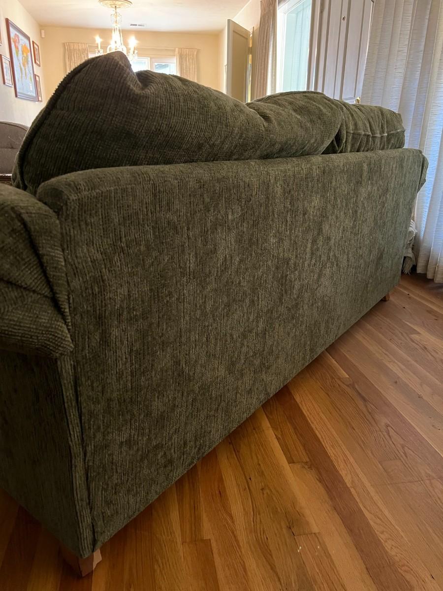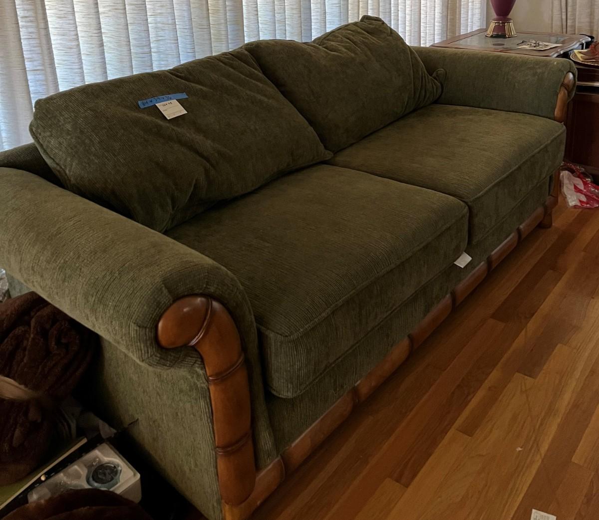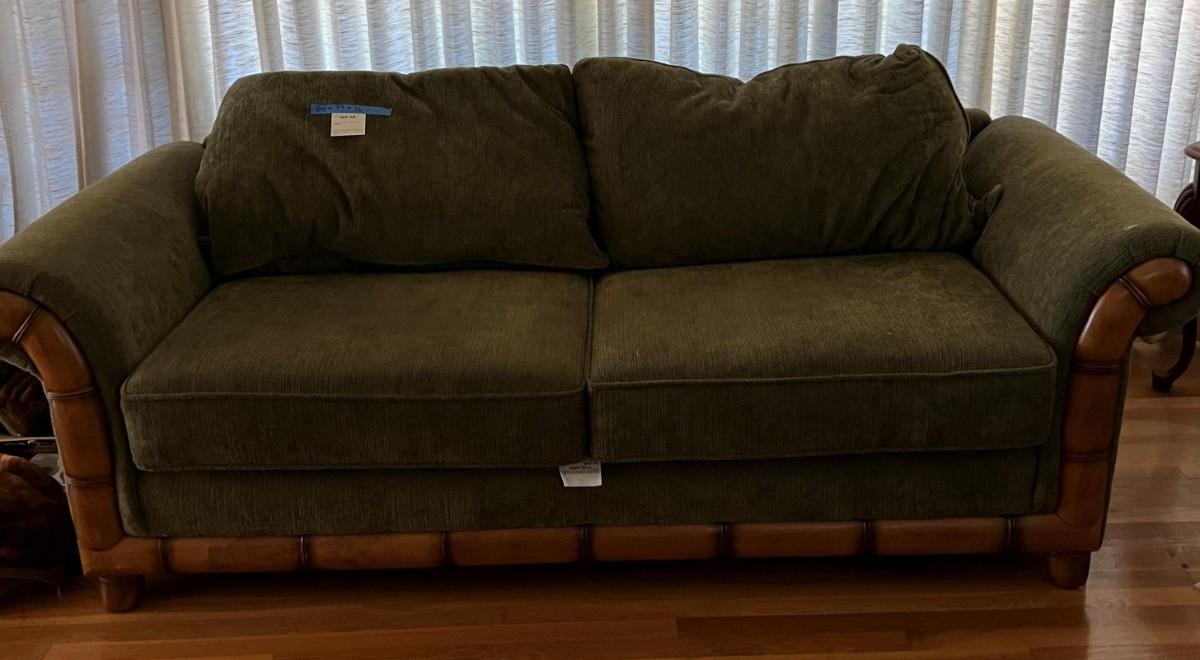 Dark green upholstered loveseat with wooden accents