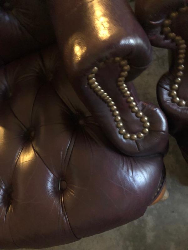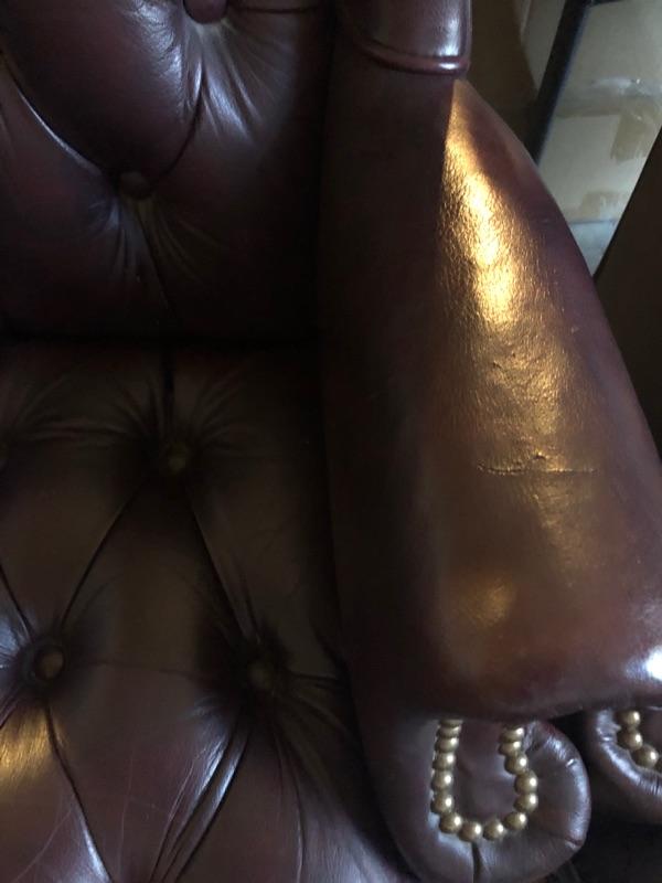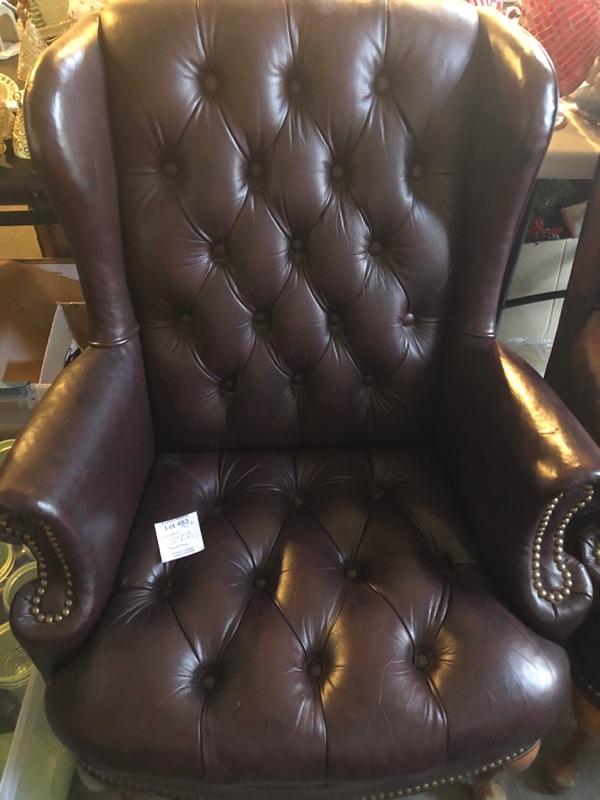 Dark Maroon Leather Wingback Chair with Gold Studs - Chair A - Slight wear-, top of chair has slight smudge (see photo) - Although the chair looks brown, it is a dark maroon, check matching chair B - Lot 483