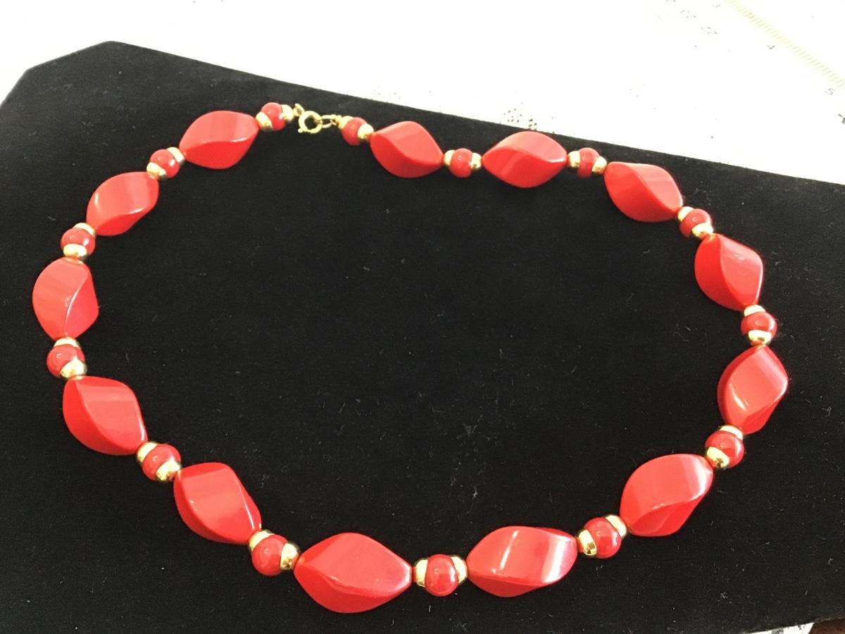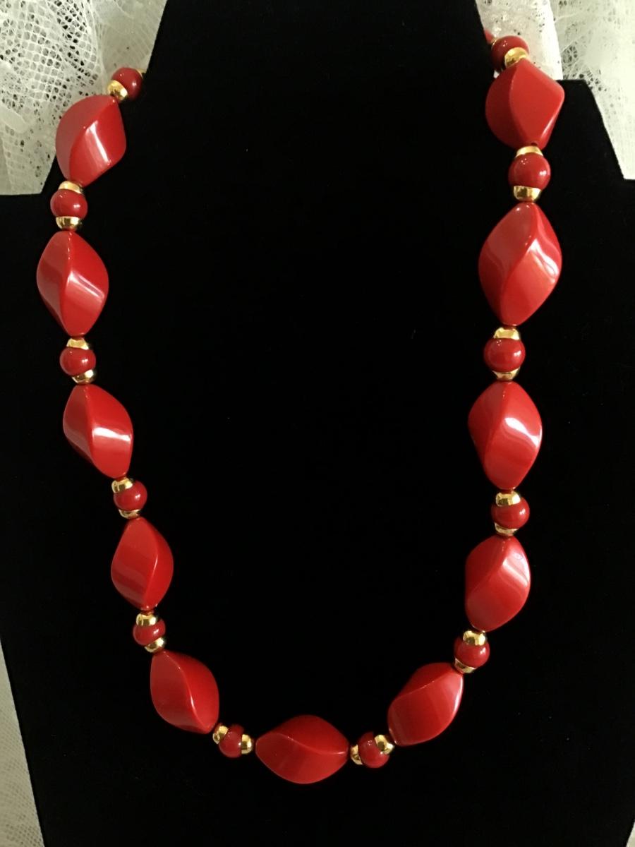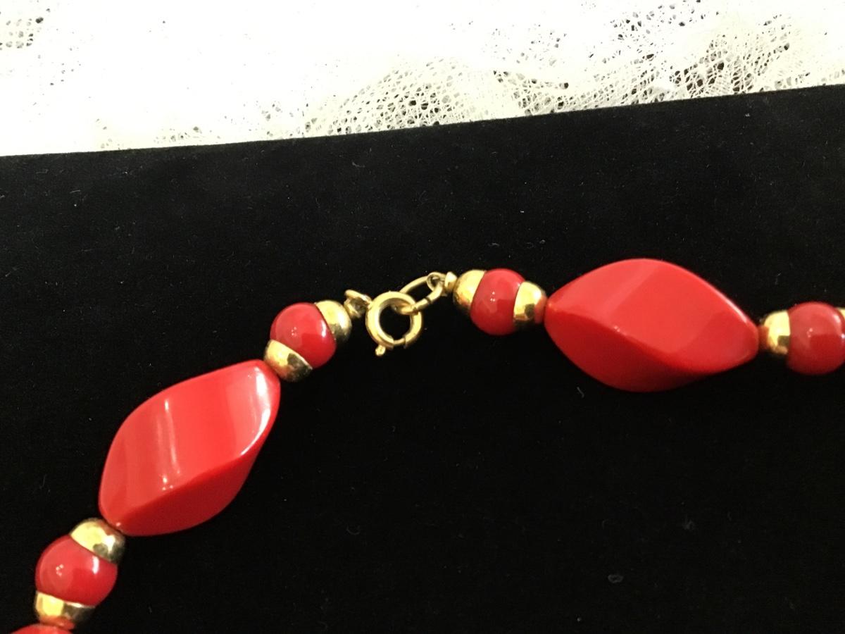 DARK RED AND SMALL BEADED LUCITE PLASTIC NECKLACE GOLD TONE SPACERS VINTAGE