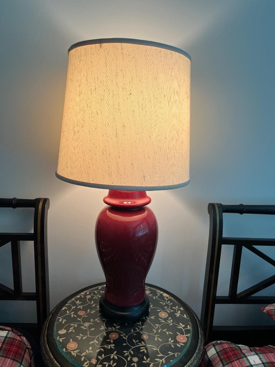 25"h x 11"w--dark red ceramic lamp, good condition.