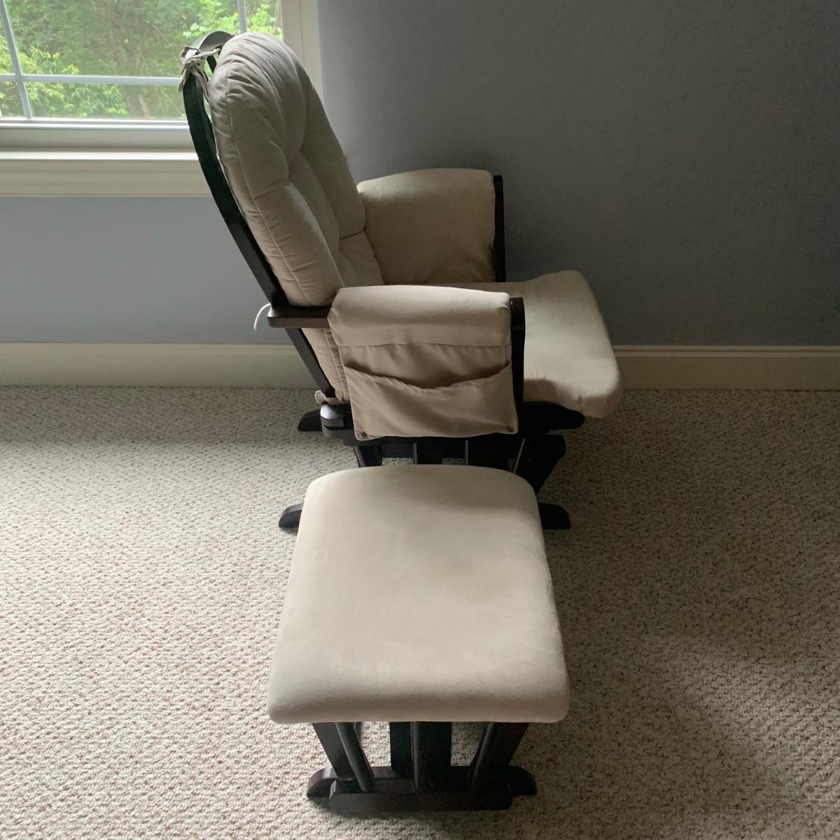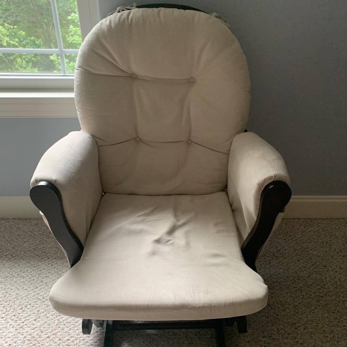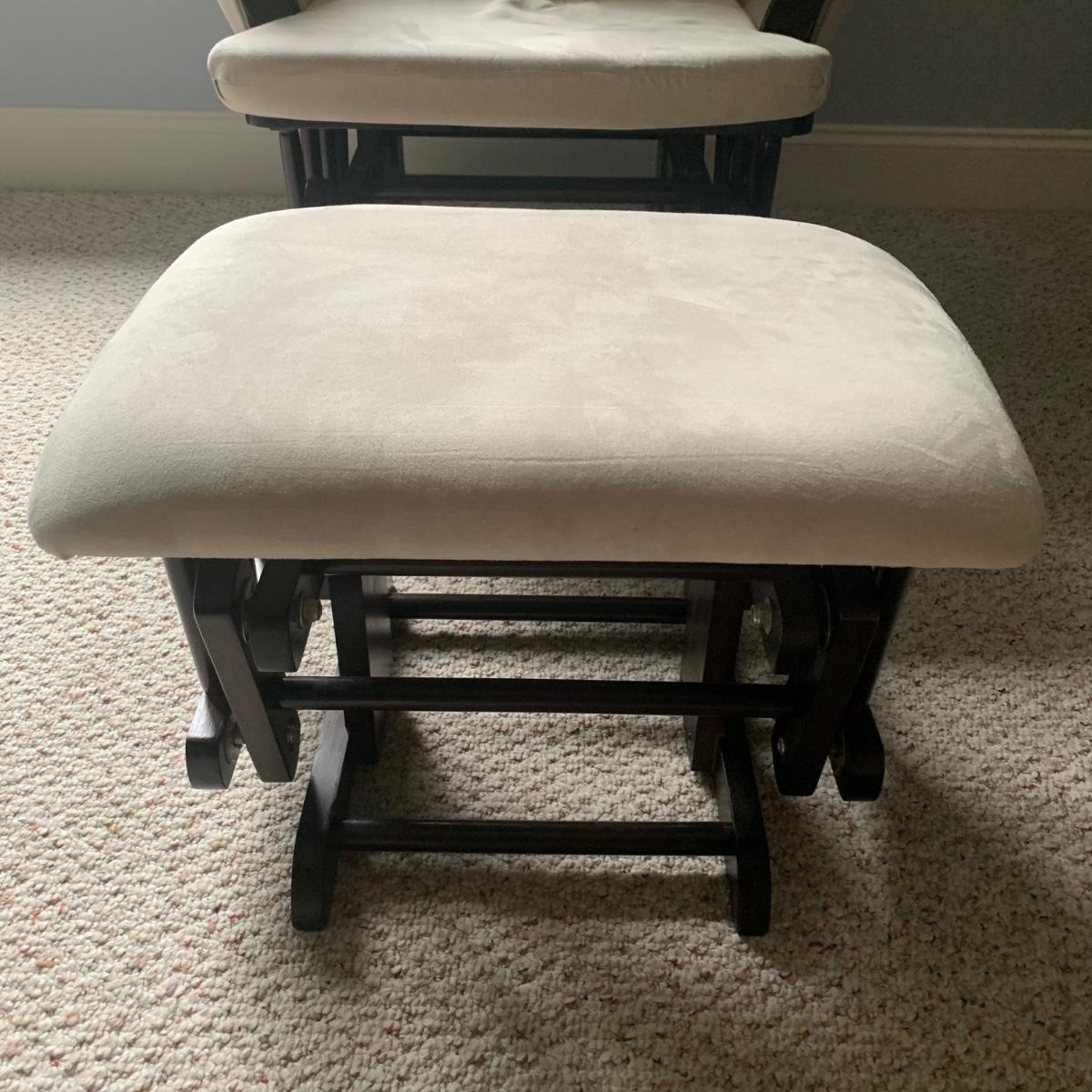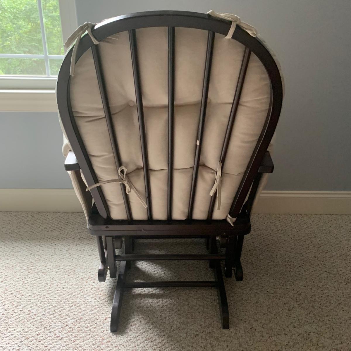 Dark wood glider with beige cushions and foot stool. Cushions are removable for washing. Glider measures, 28.5” x 28” x 39”H with a seat height of 19”. Local pickup only.