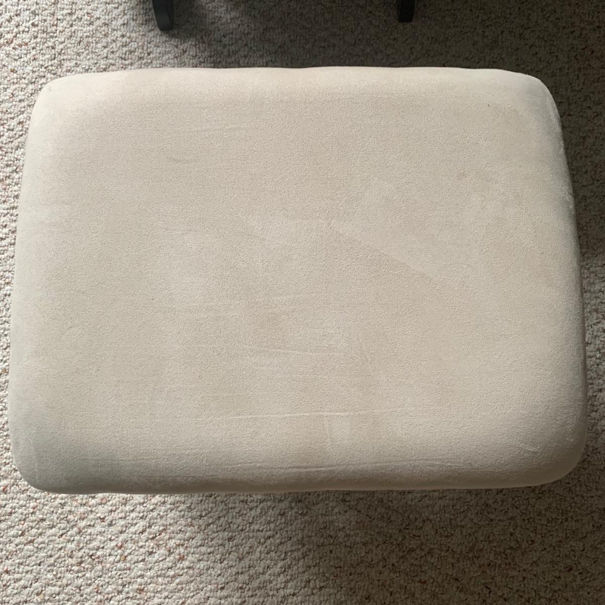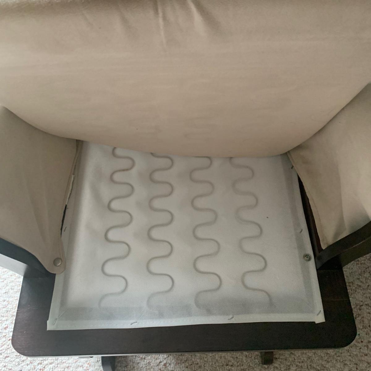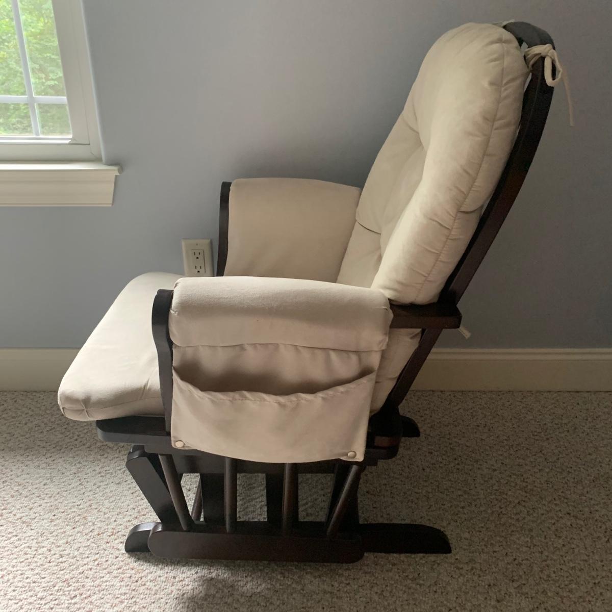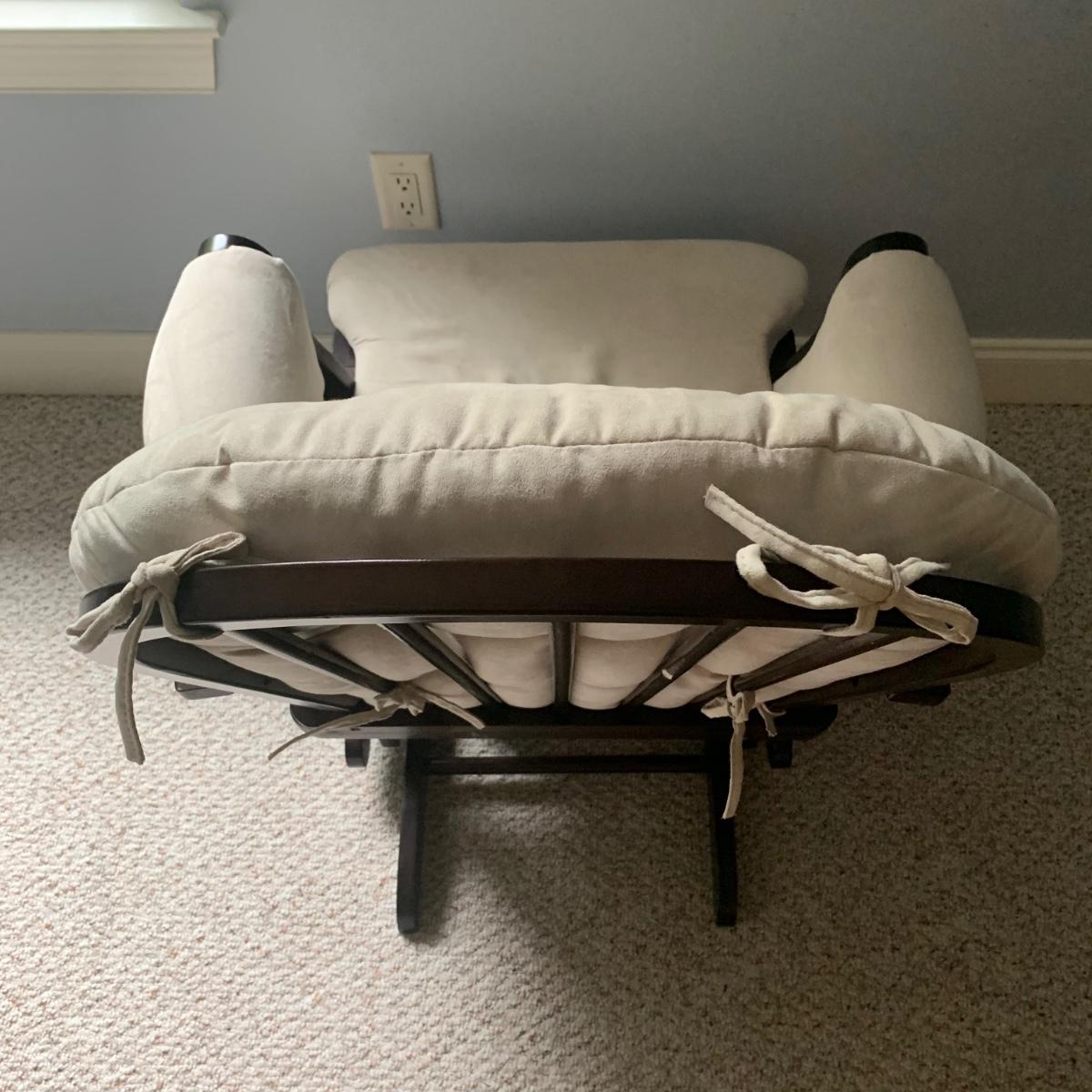 Dark wood glider with beige cushions and foot stool. Cushions are removable for washing. Glider measures, 28.5” x 28” x 39”H with a seat height of 19”. Local pickup only.