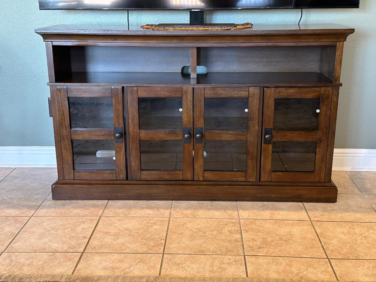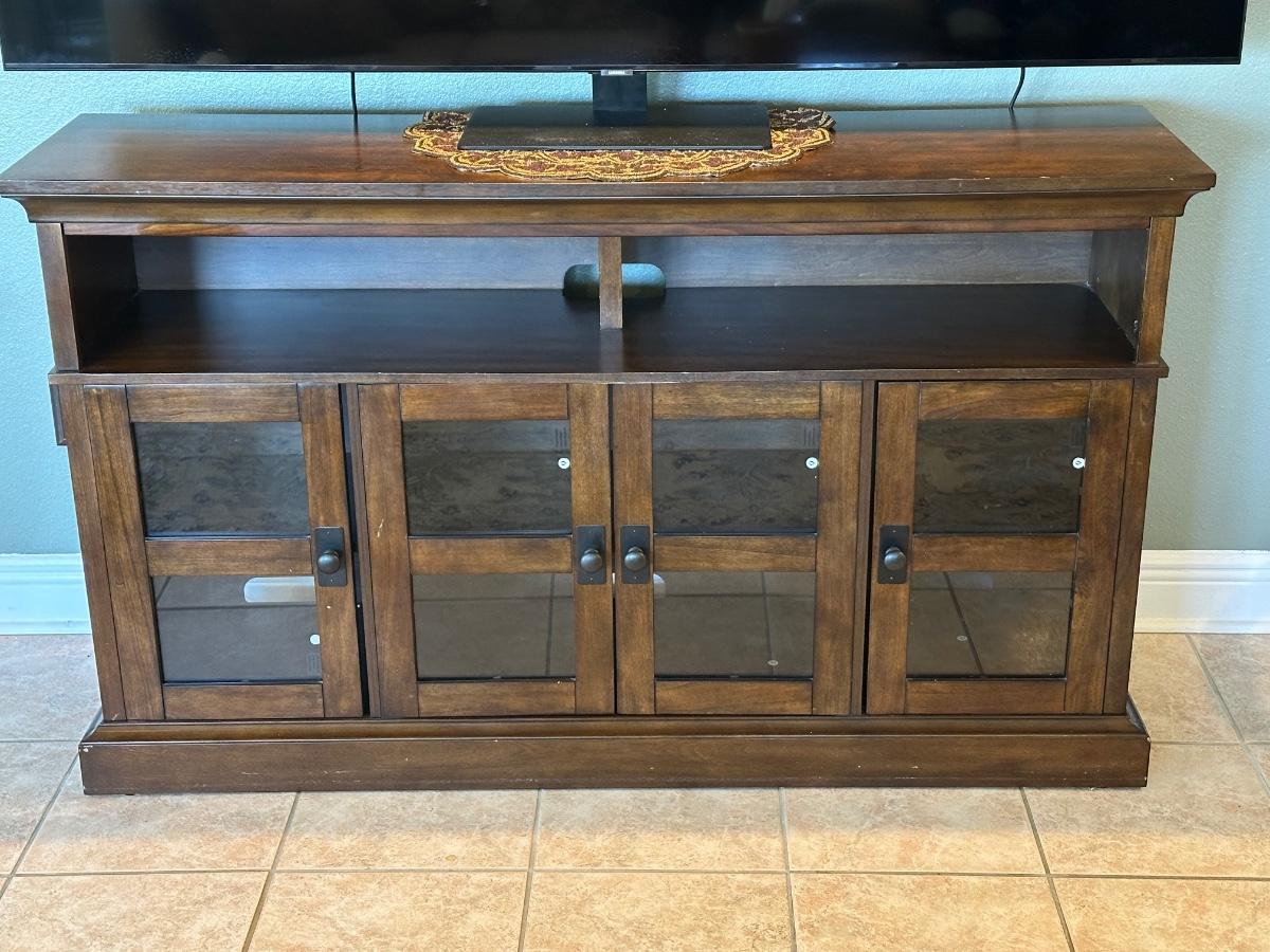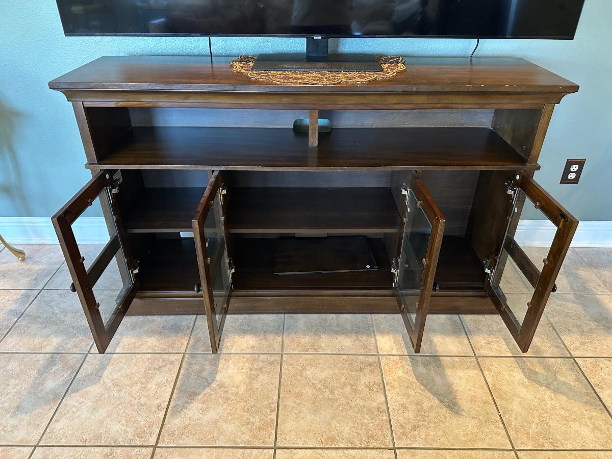 Classic dark wood entertainment console featuring four framed glass doors with black metal knobs and an open upper shelf for electronics or décor. The interior includes adjustable shelving for flexible storage of media components, books, or display items.