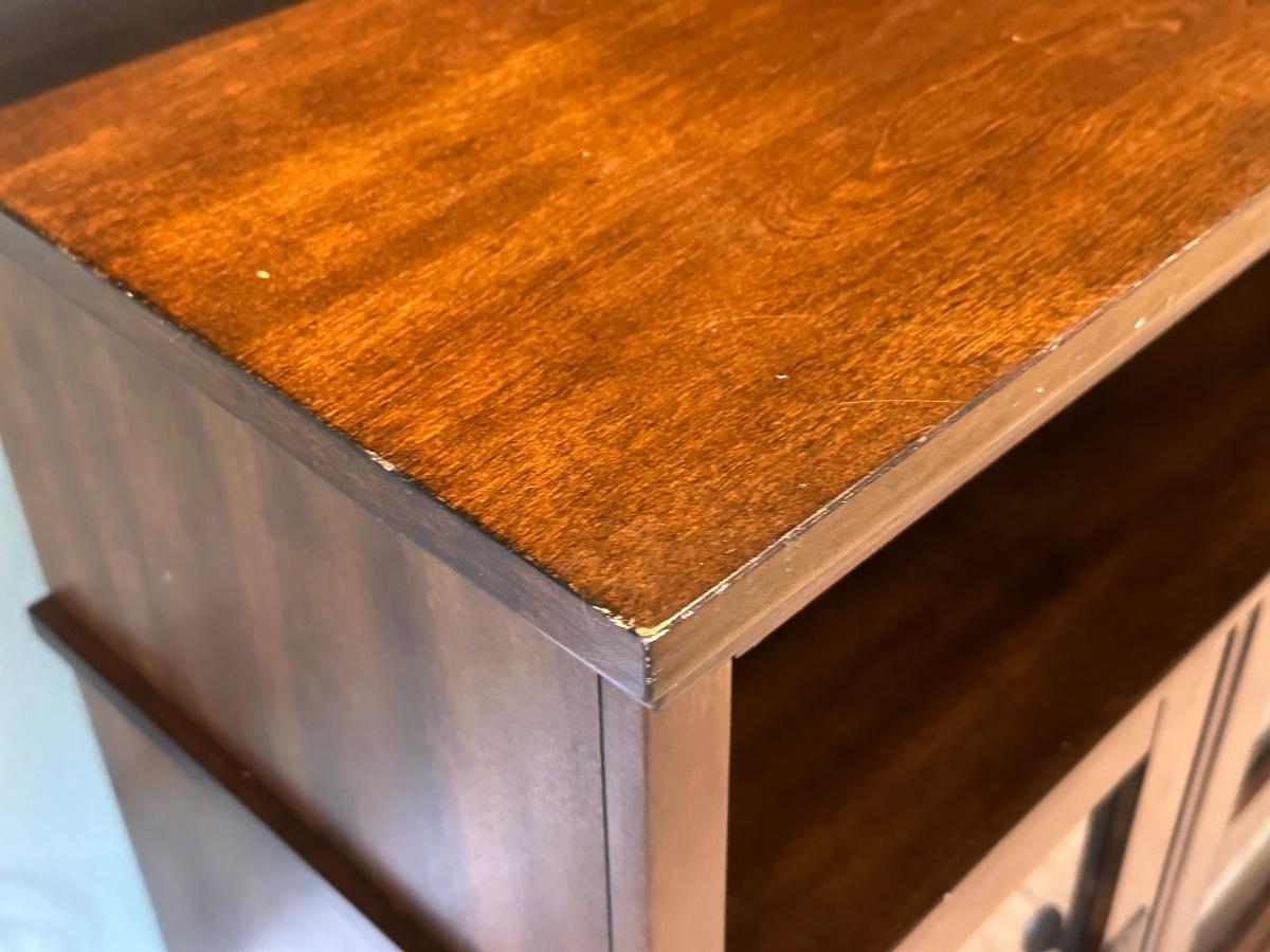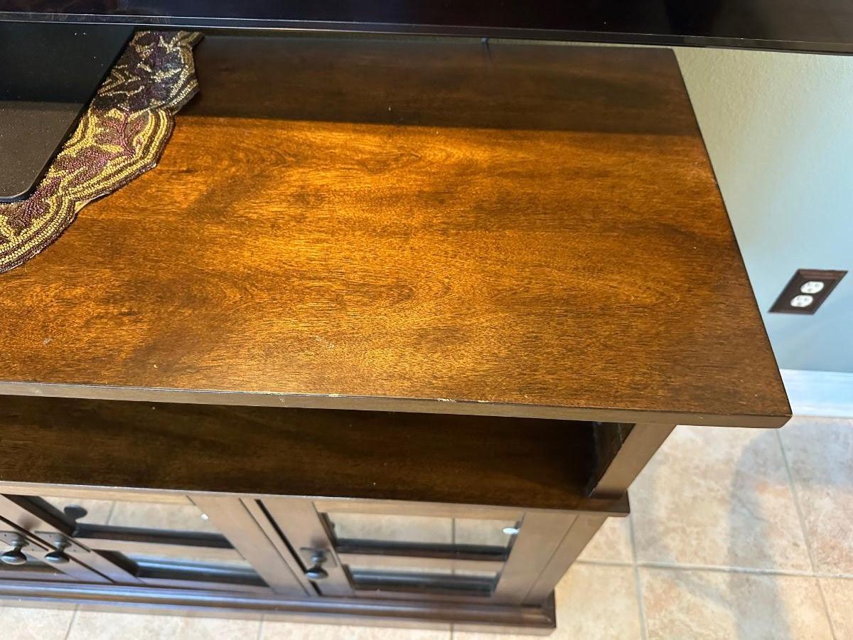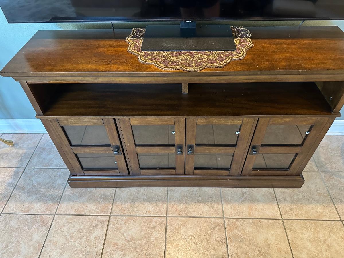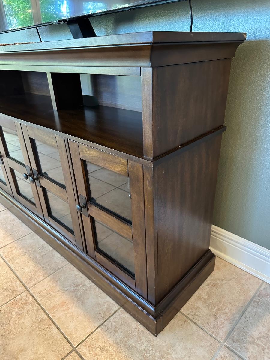 Classic dark wood entertainment console featuring four framed glass doors with black metal knobs and an open upper shelf for electronics or décor. The interior includes adjustable shelving for flexible storage of media components, books, or display items.