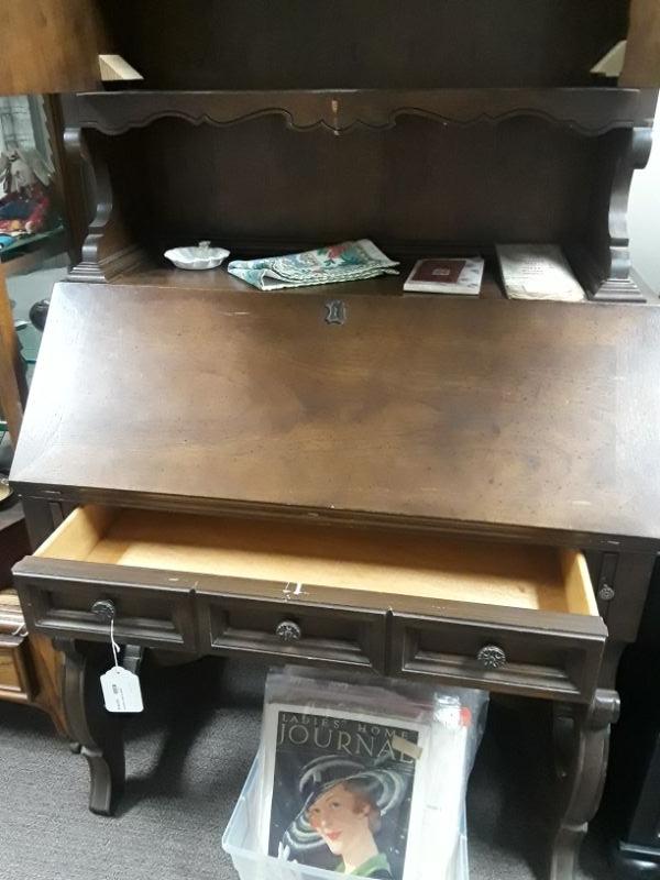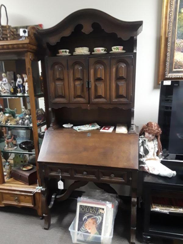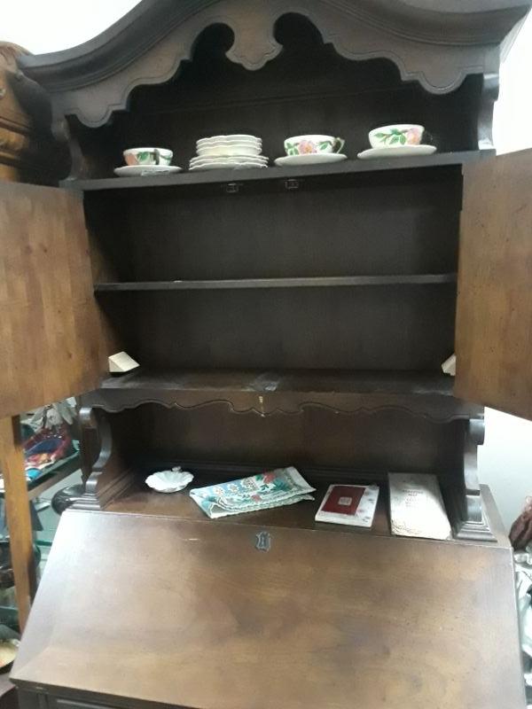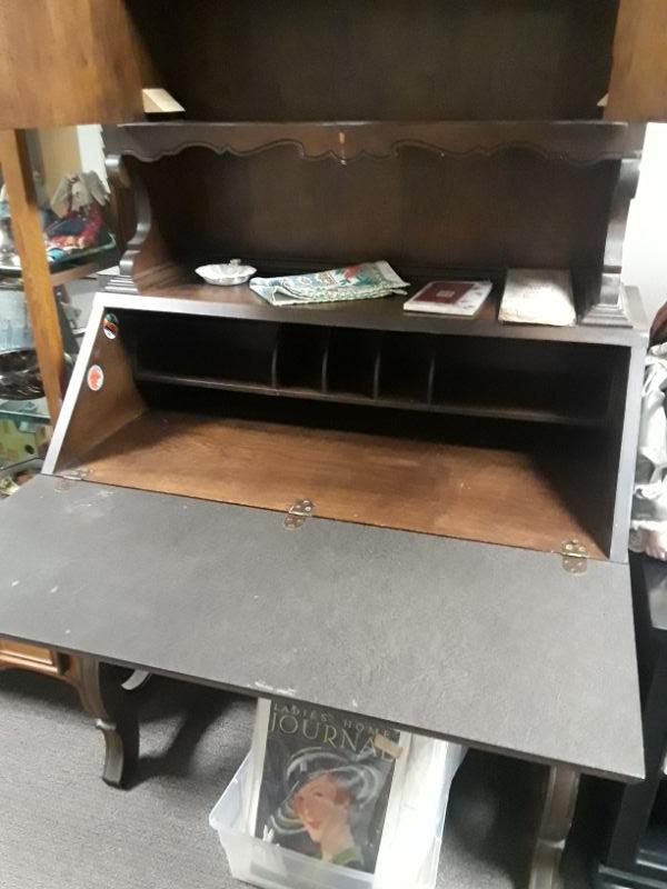 Tall 2 piece secretary hutch desk. Has a cabinet on top with shelves. Bottom has an folding writing place with multi compartments inside and a drawer. Does have a few scratches but no serious damage. Good Condition as is or as a project piece. Over 6' tall.