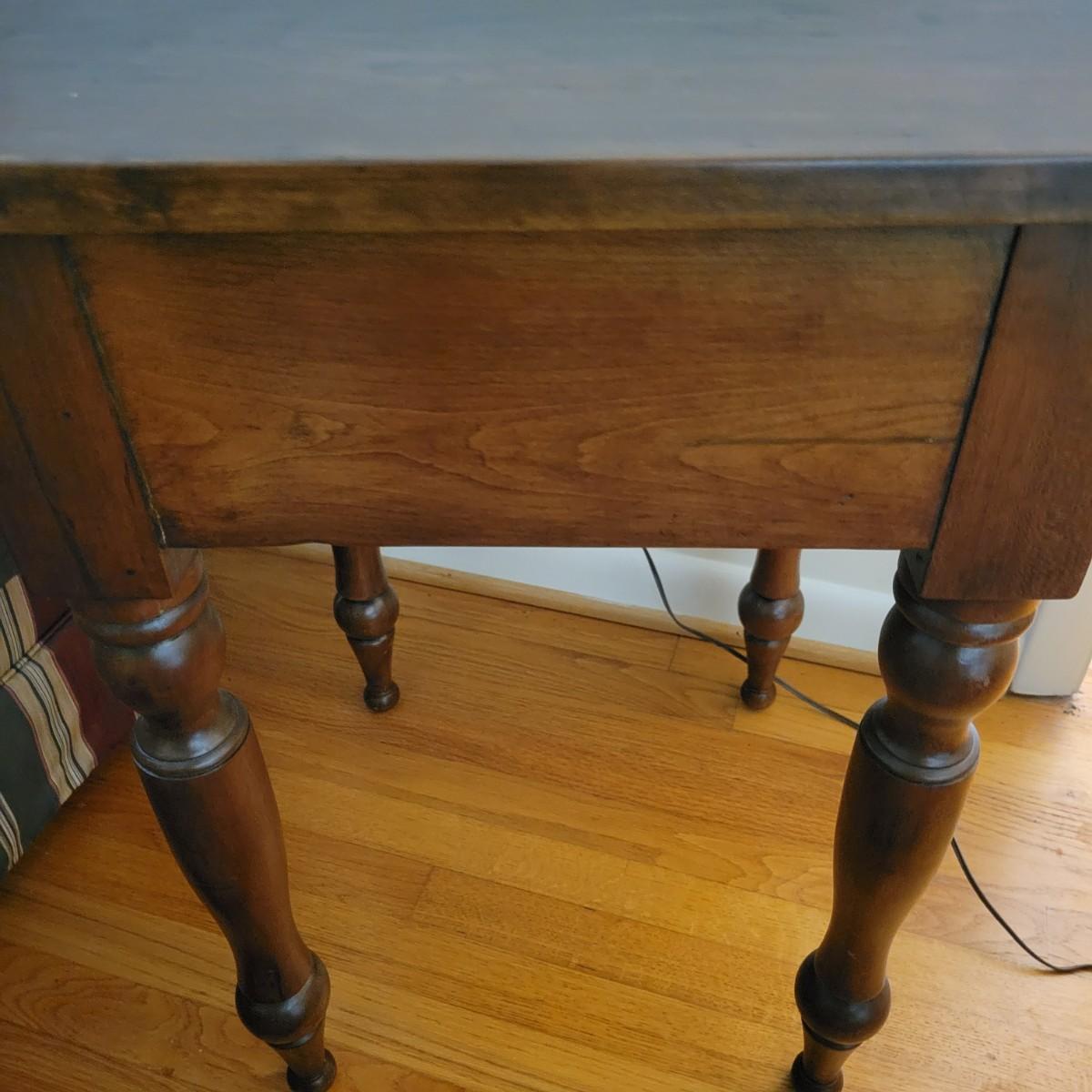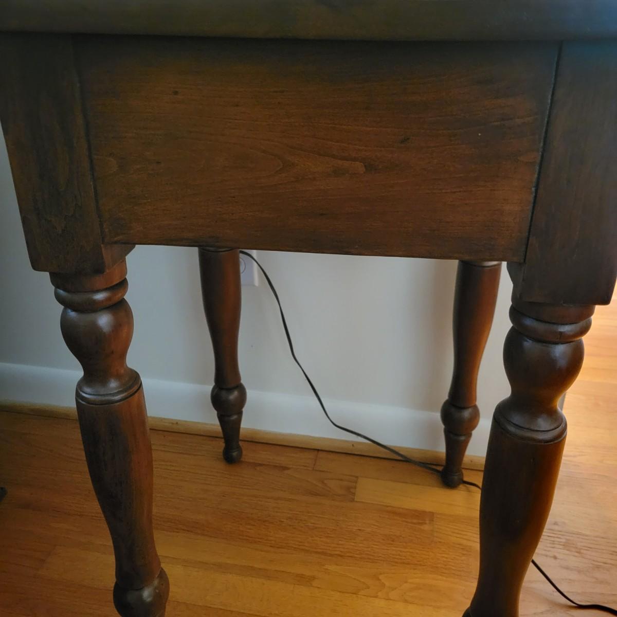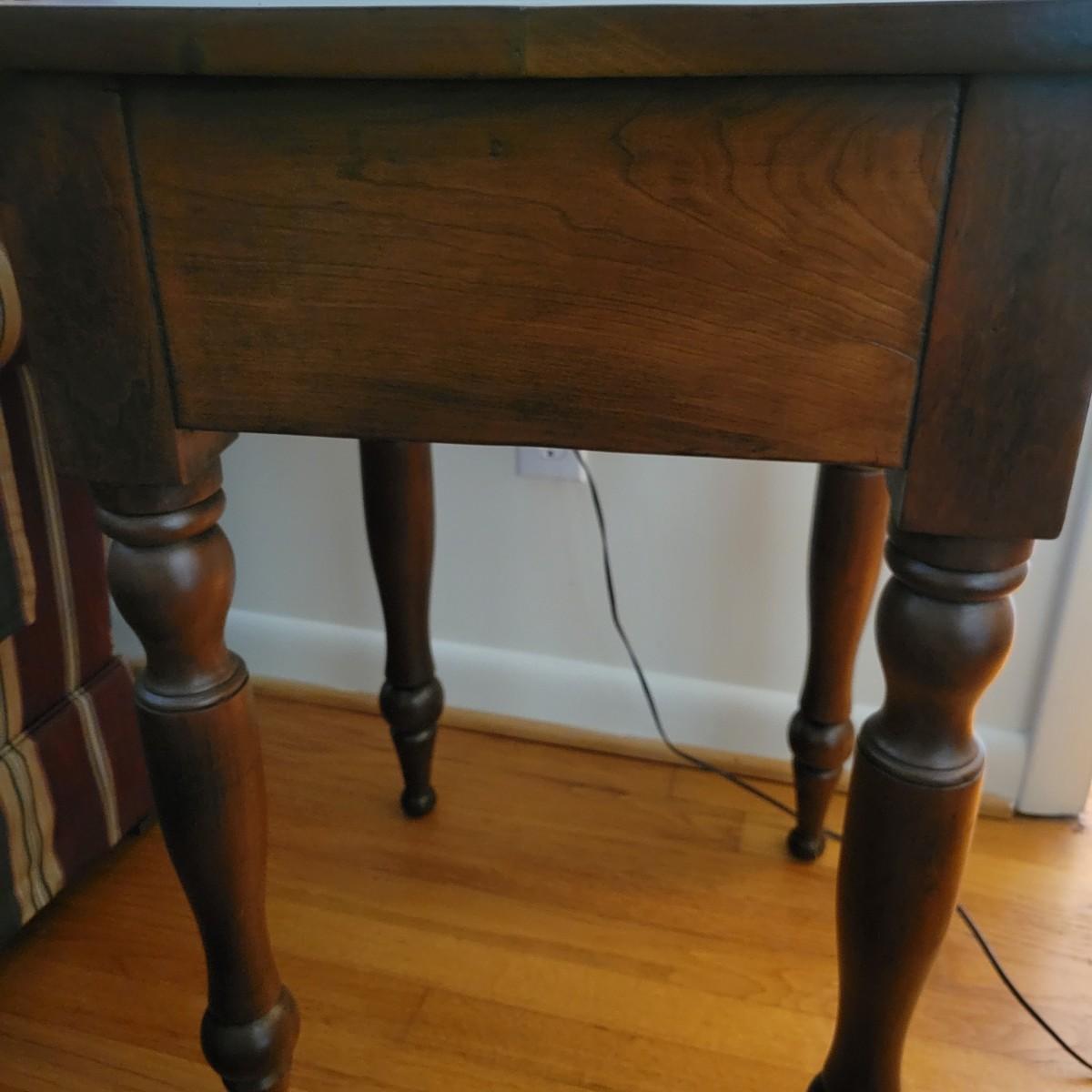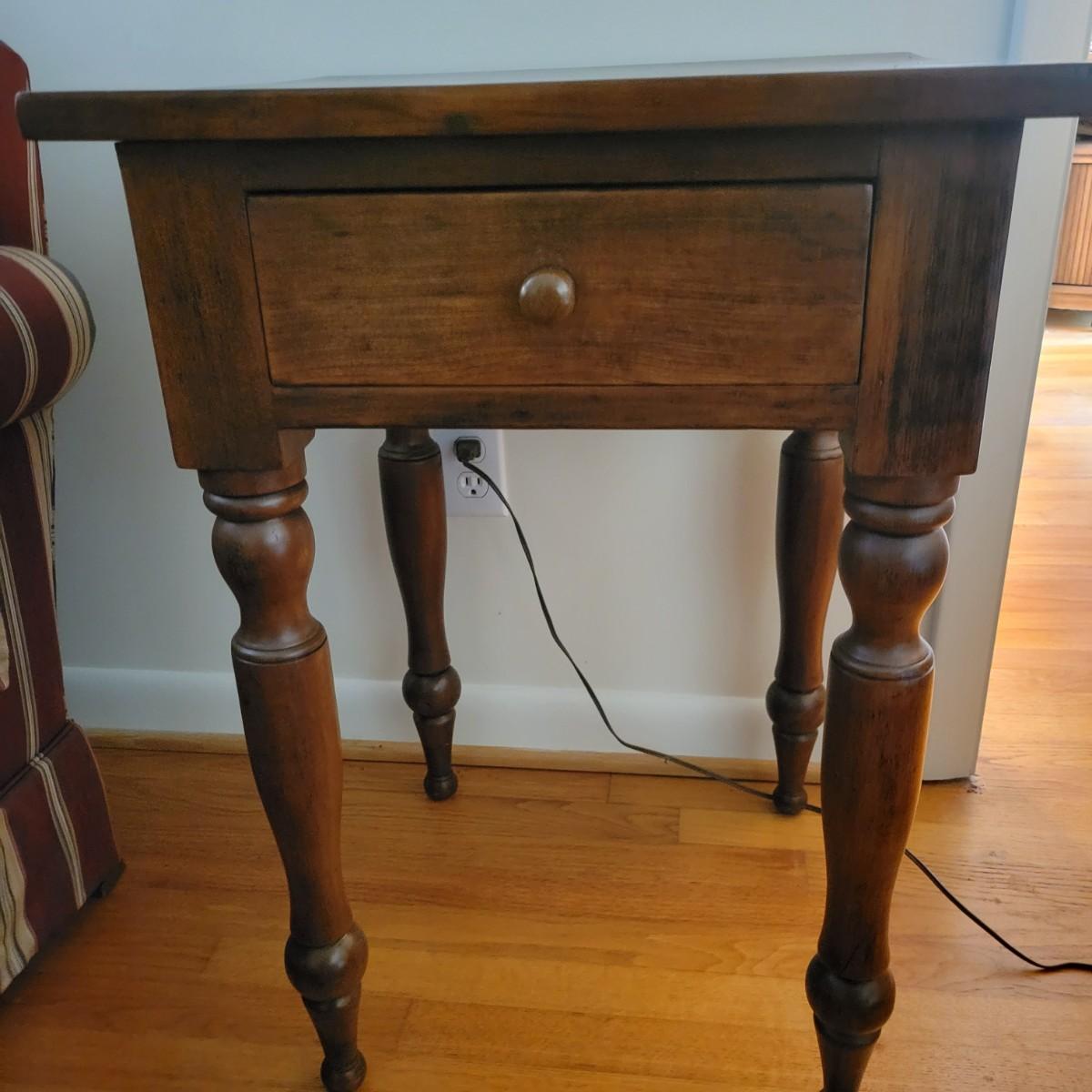 A wooden end table in good condition with no notable damage. This piece features a rich, dark brown stain with a single dovetailed drawer and wooden knob. Measures approximately 20" x 20" x 29". Local pickup only