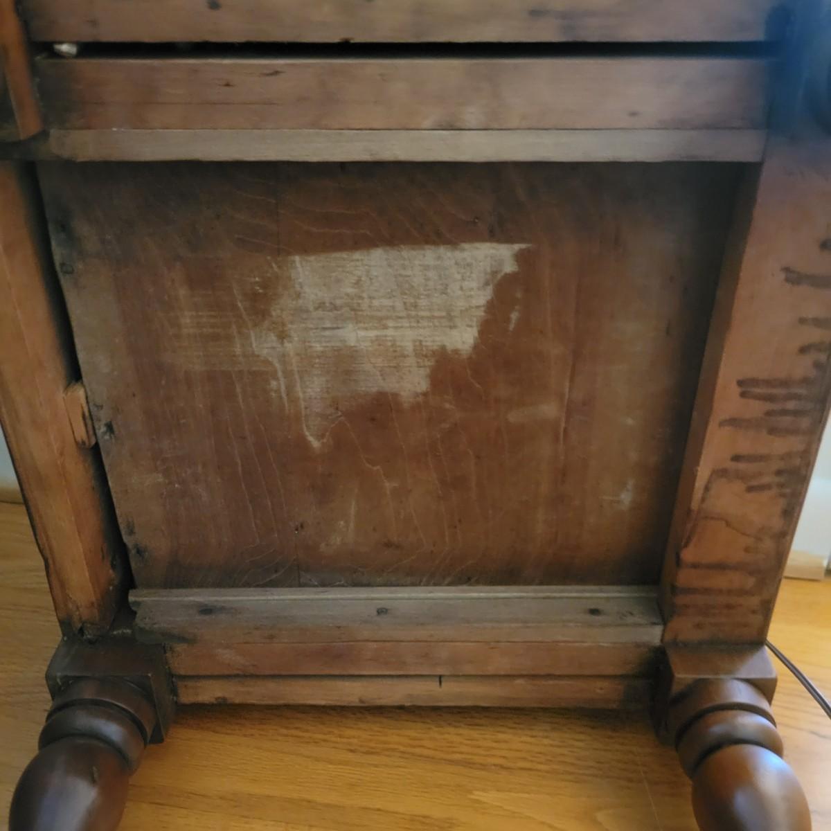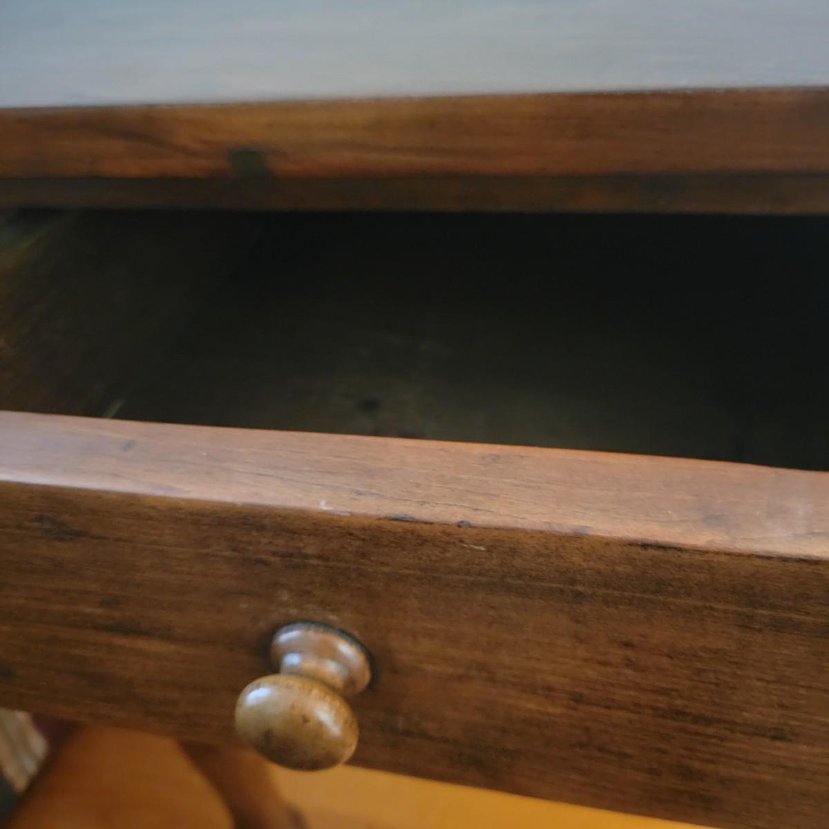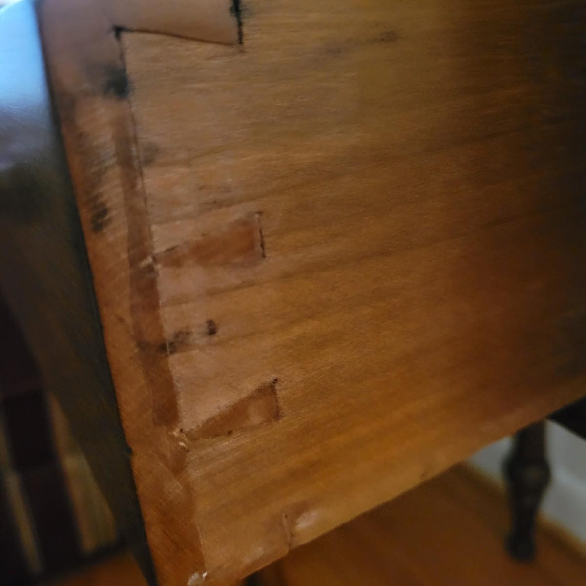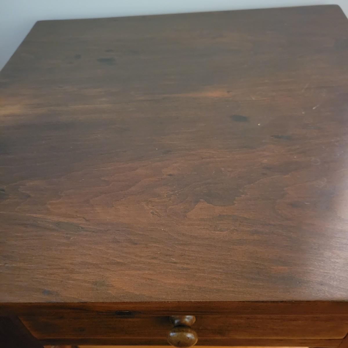 A wooden end table in good condition with no notable damage. This piece features a rich, dark brown stain with a single dovetailed drawer and wooden knob. Measures approximately 20" x 20" x 29". Local pickup only