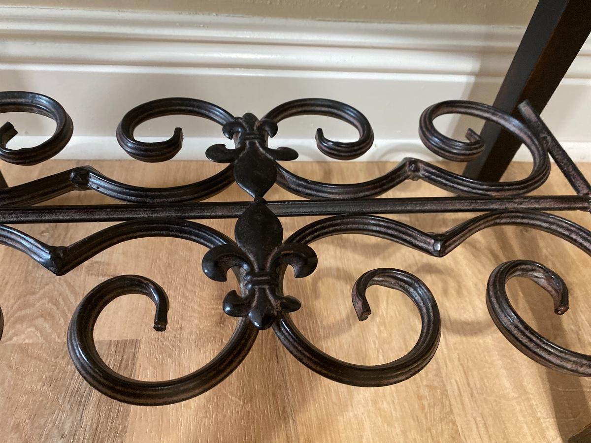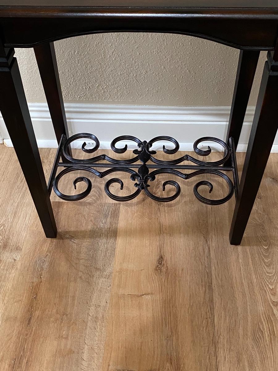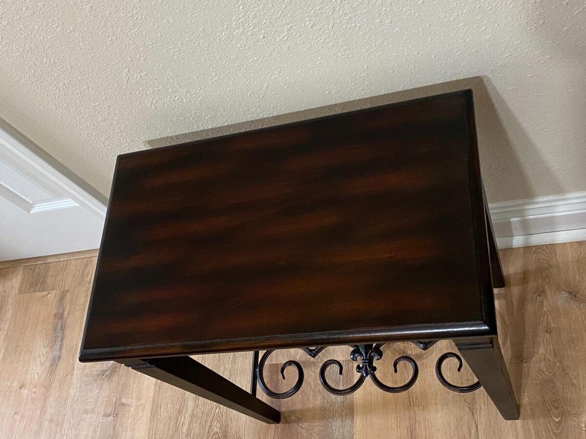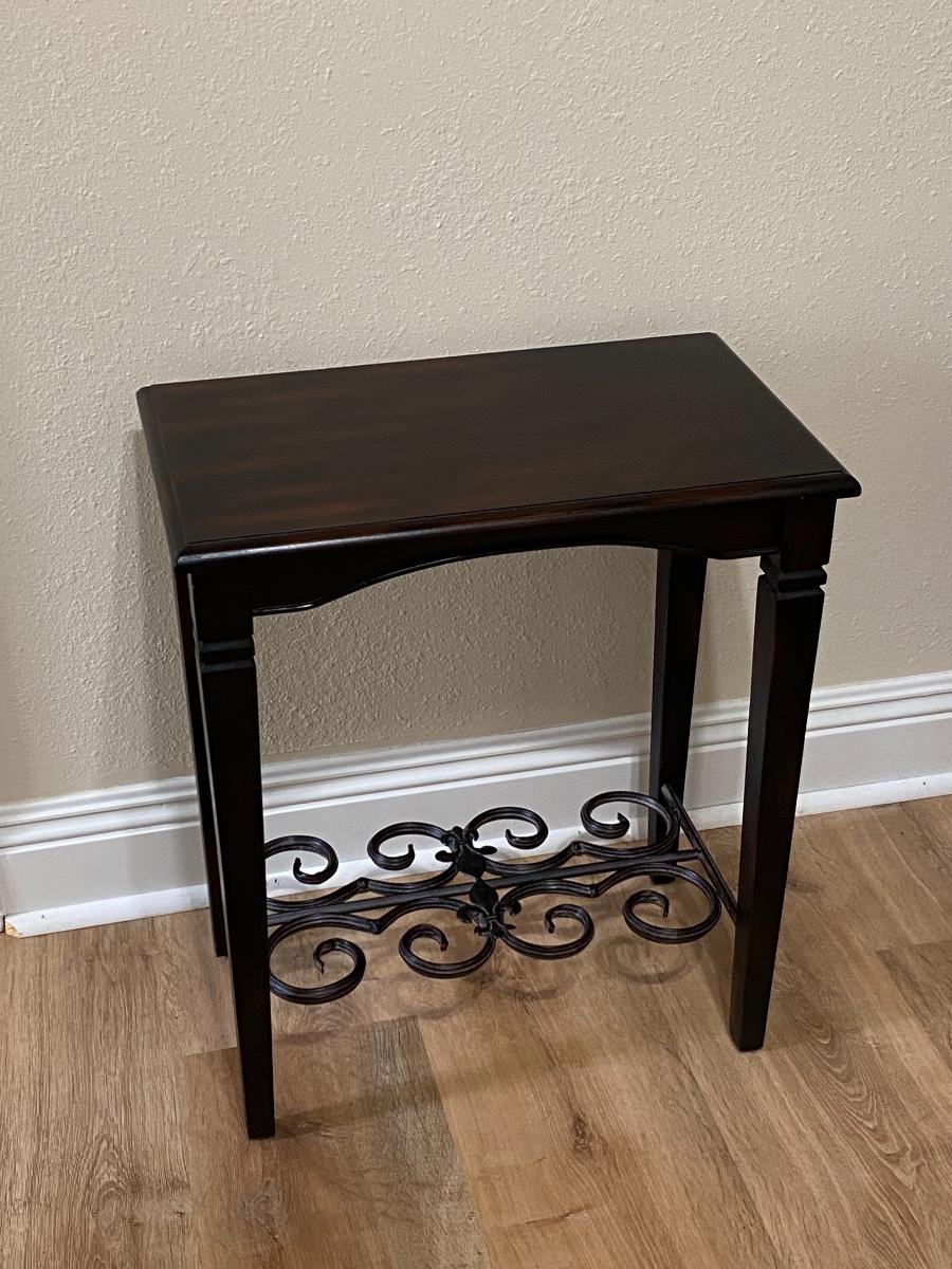 Small Dark Wood End Table with Metal Scroll Bottom Accent