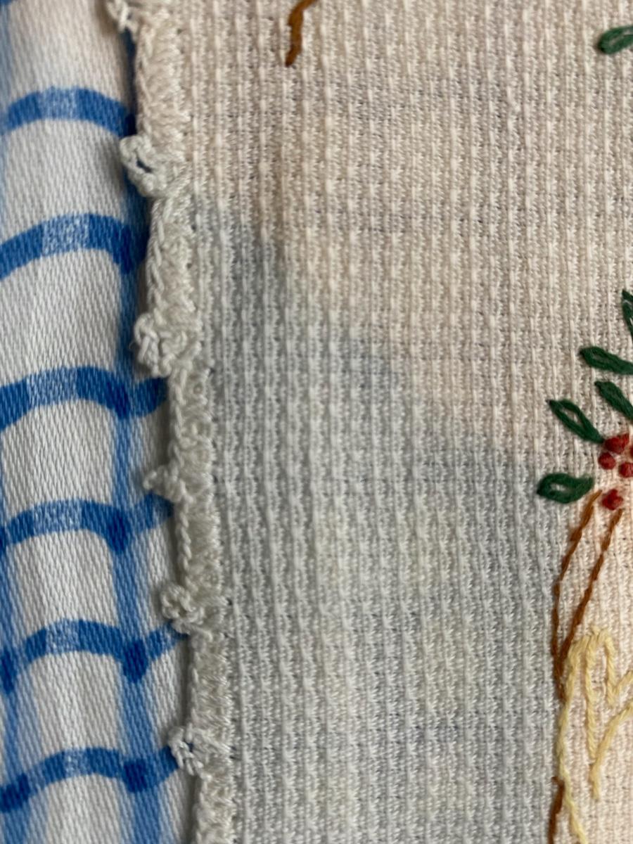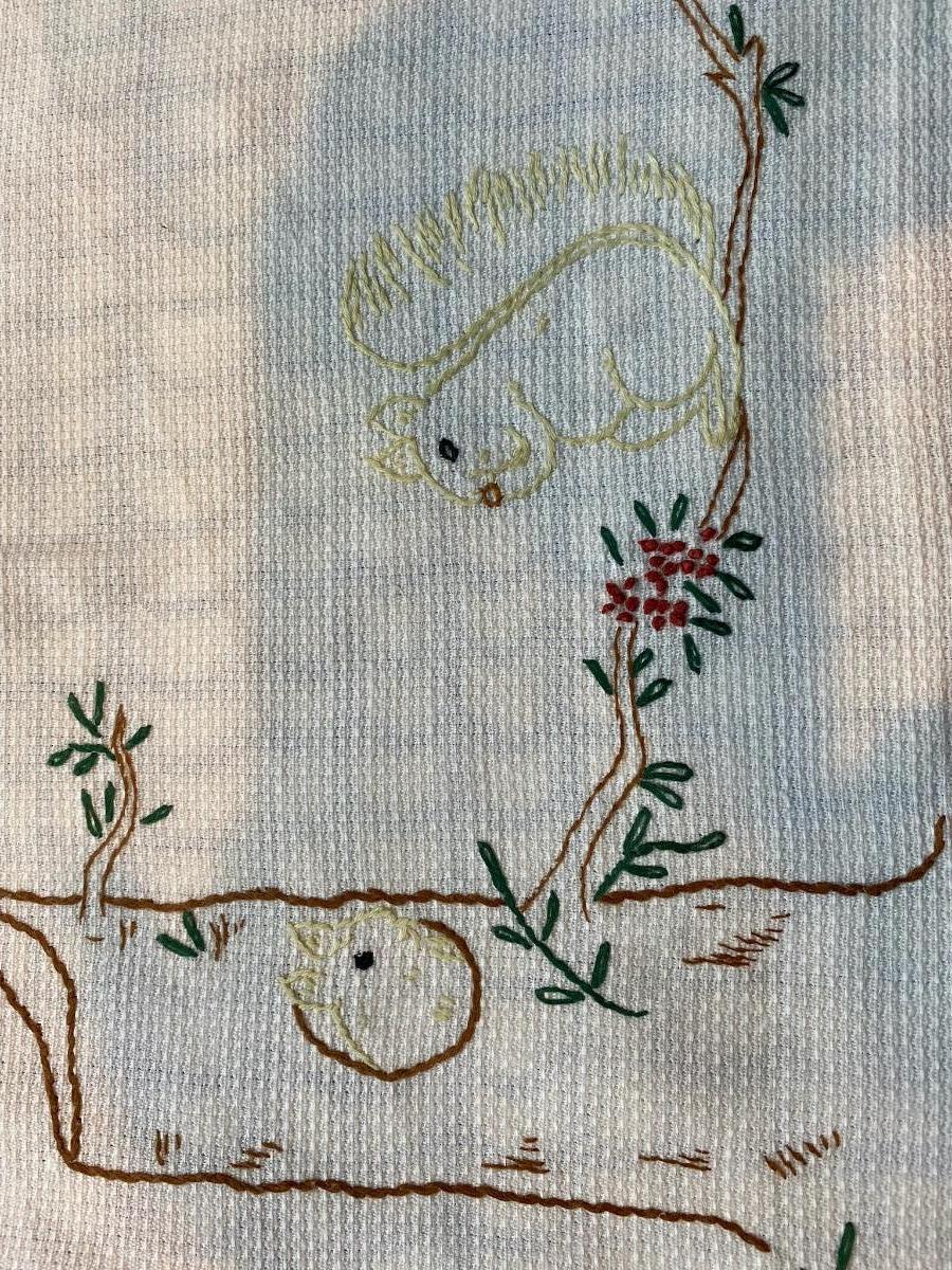 Pleasing squirrels hand stitches on cotton hexagon shape place mat that was gift to new baby about 80 years ago ! Very sweet 15 1/2" X 9 1/2"