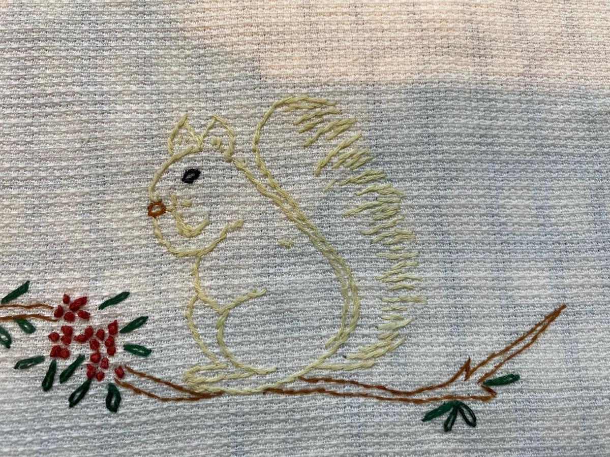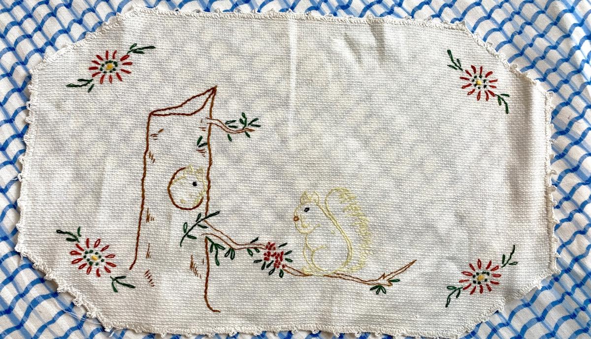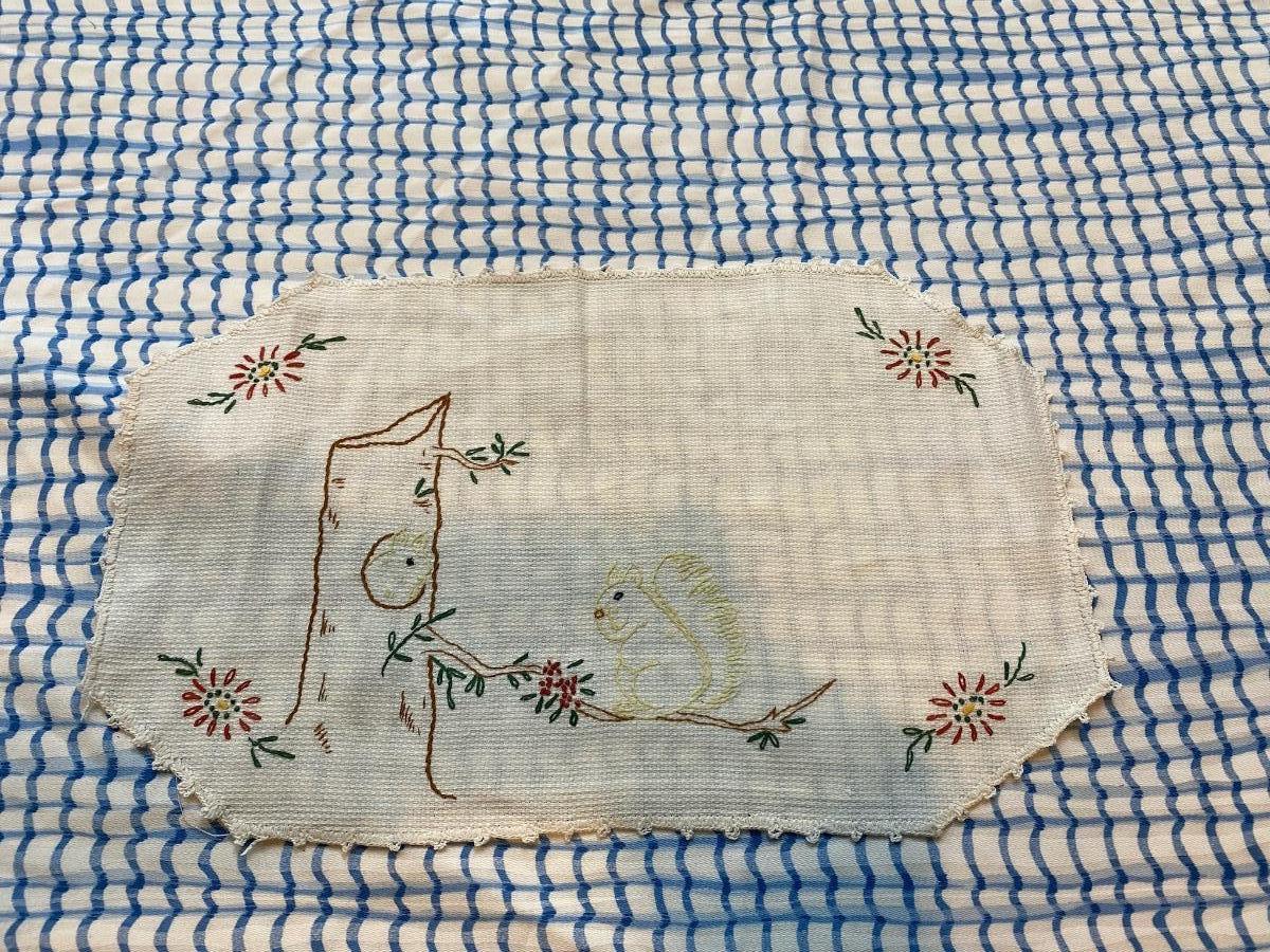 Darling Antique Baby Child Placemat Hand Embroidered Squirrel Vintage Hand Stitched Doily