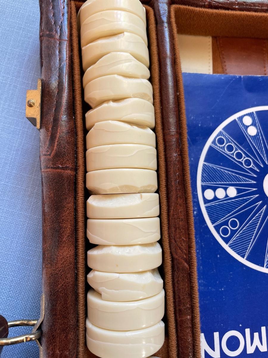 Backgammon game has some damage to the white playing pieces