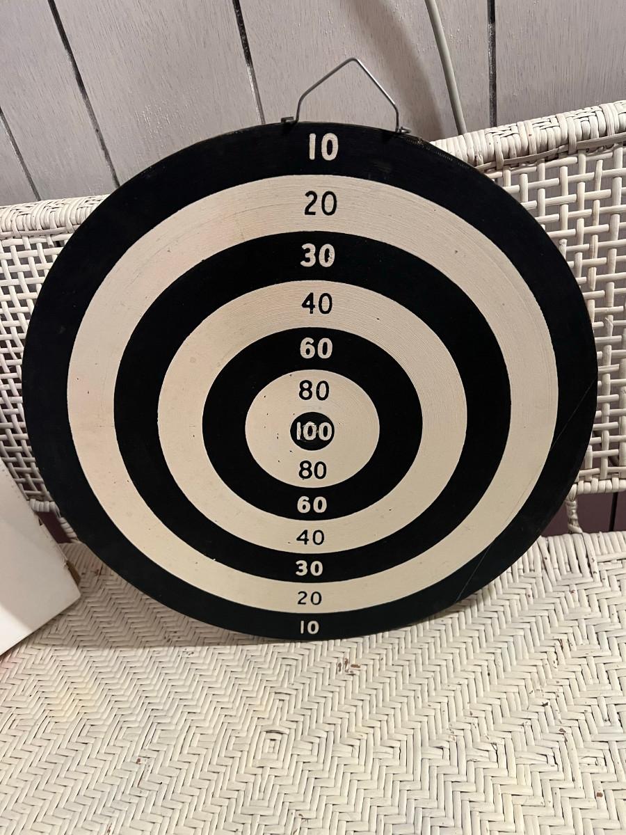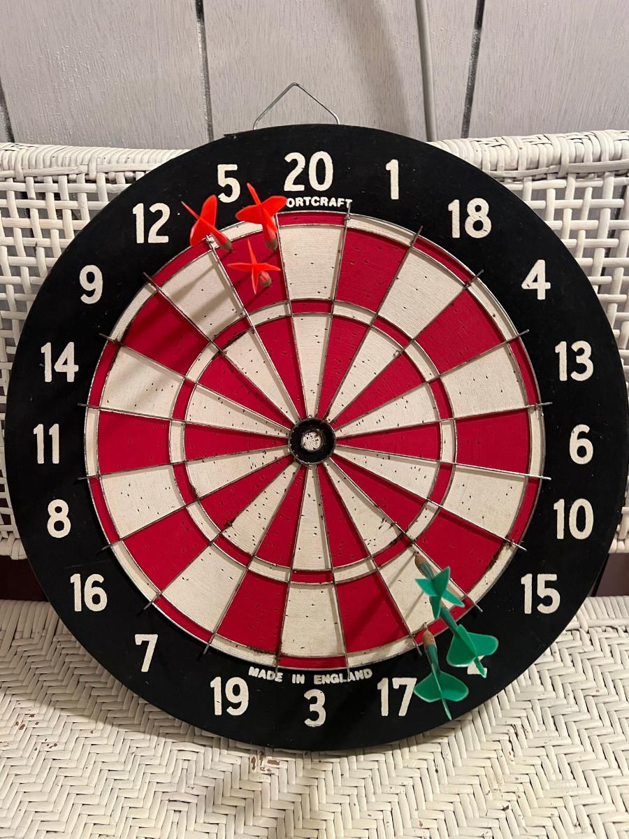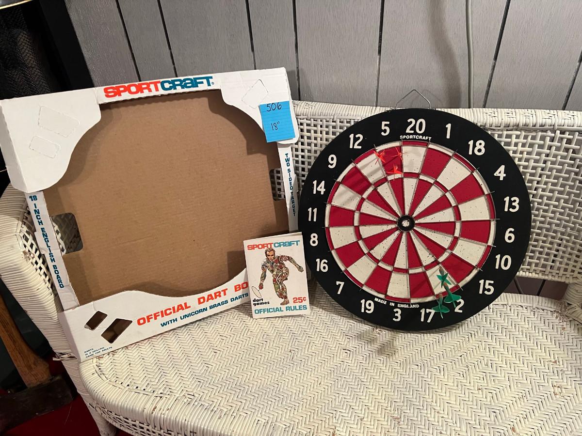 Dartboard Sportcraft 18" English board with 3 red and 3 green darts bit of rust around the edge