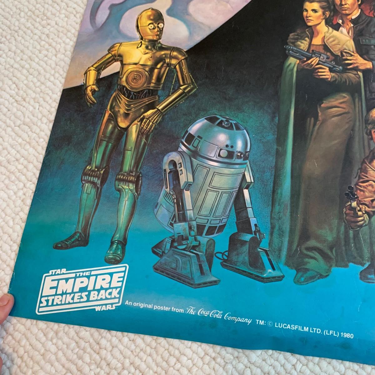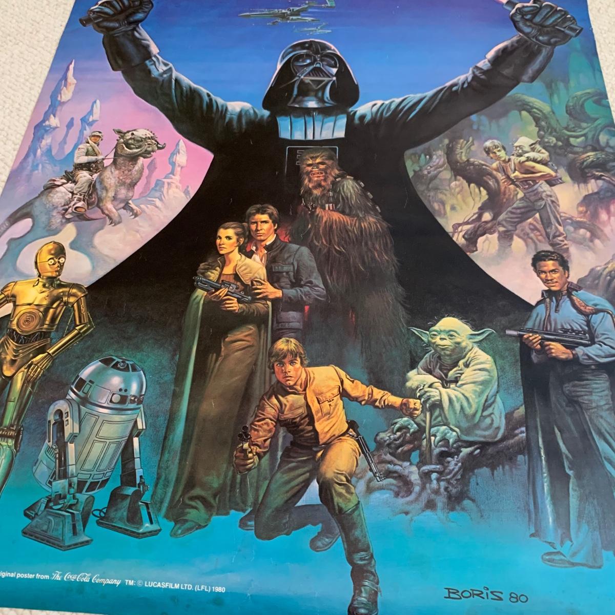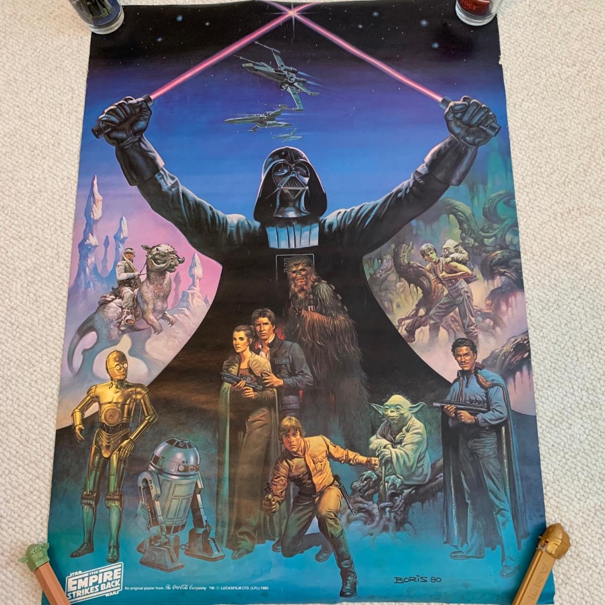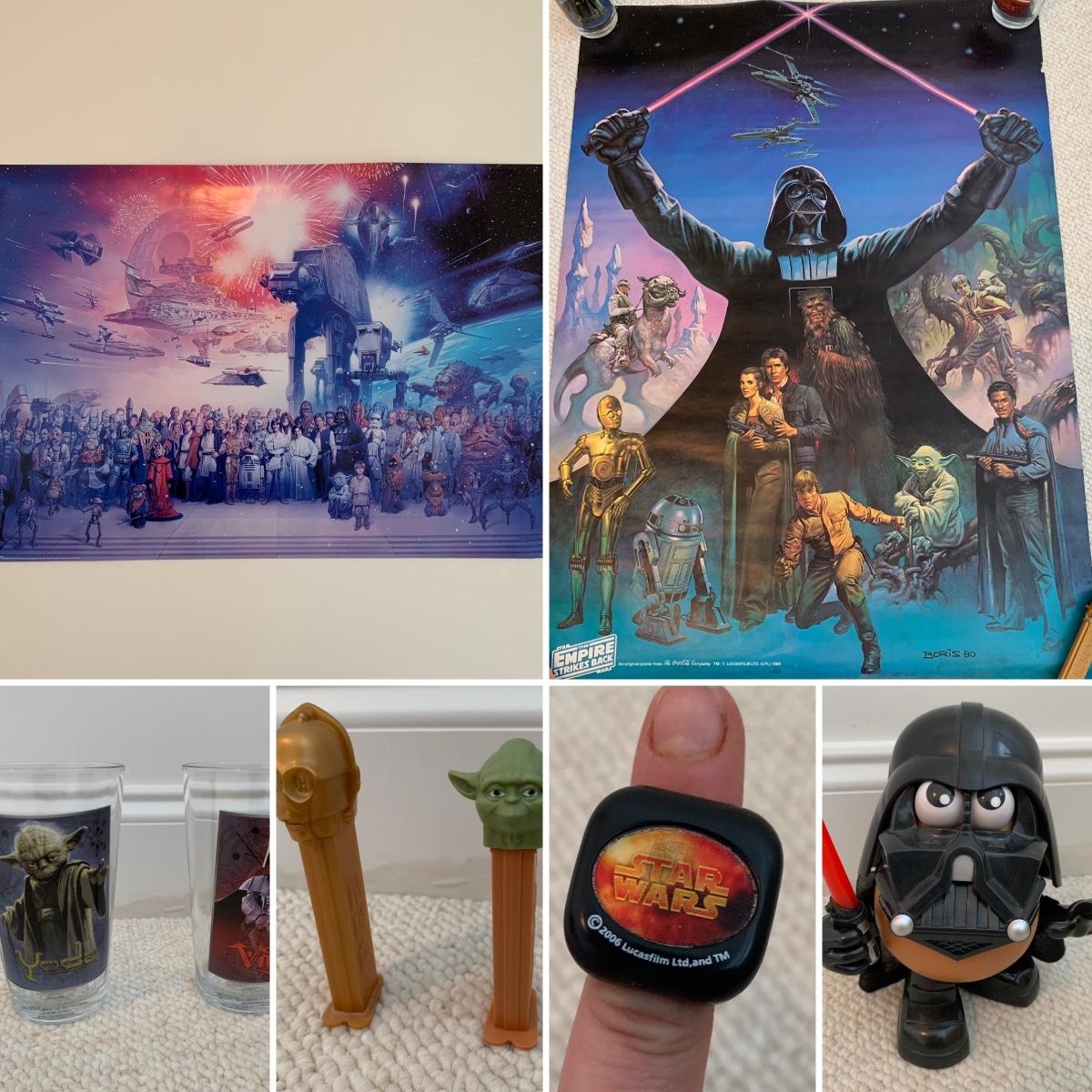 A collection of Star Wars memorabilia. Included are two posters, two glass pint glasses, two Pez dispensers, a Darth Vader Potato Head, and a plastic ring that shows two shifting images. The ‘Trends’ poster is 34” x 22”. It has been on a wall and has holes in all four corners. The ‘Coca-Cola’ poster is rolled and shows some damage around the edge.