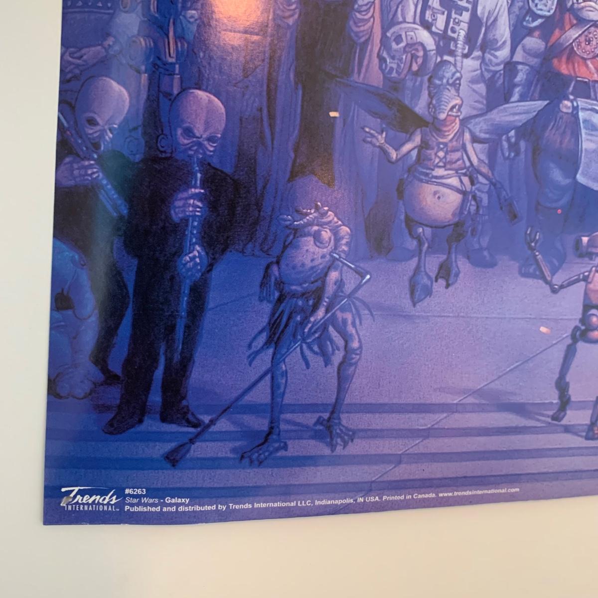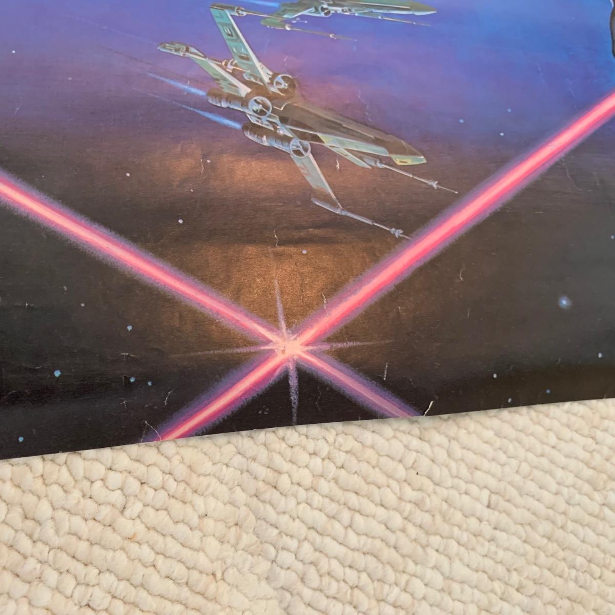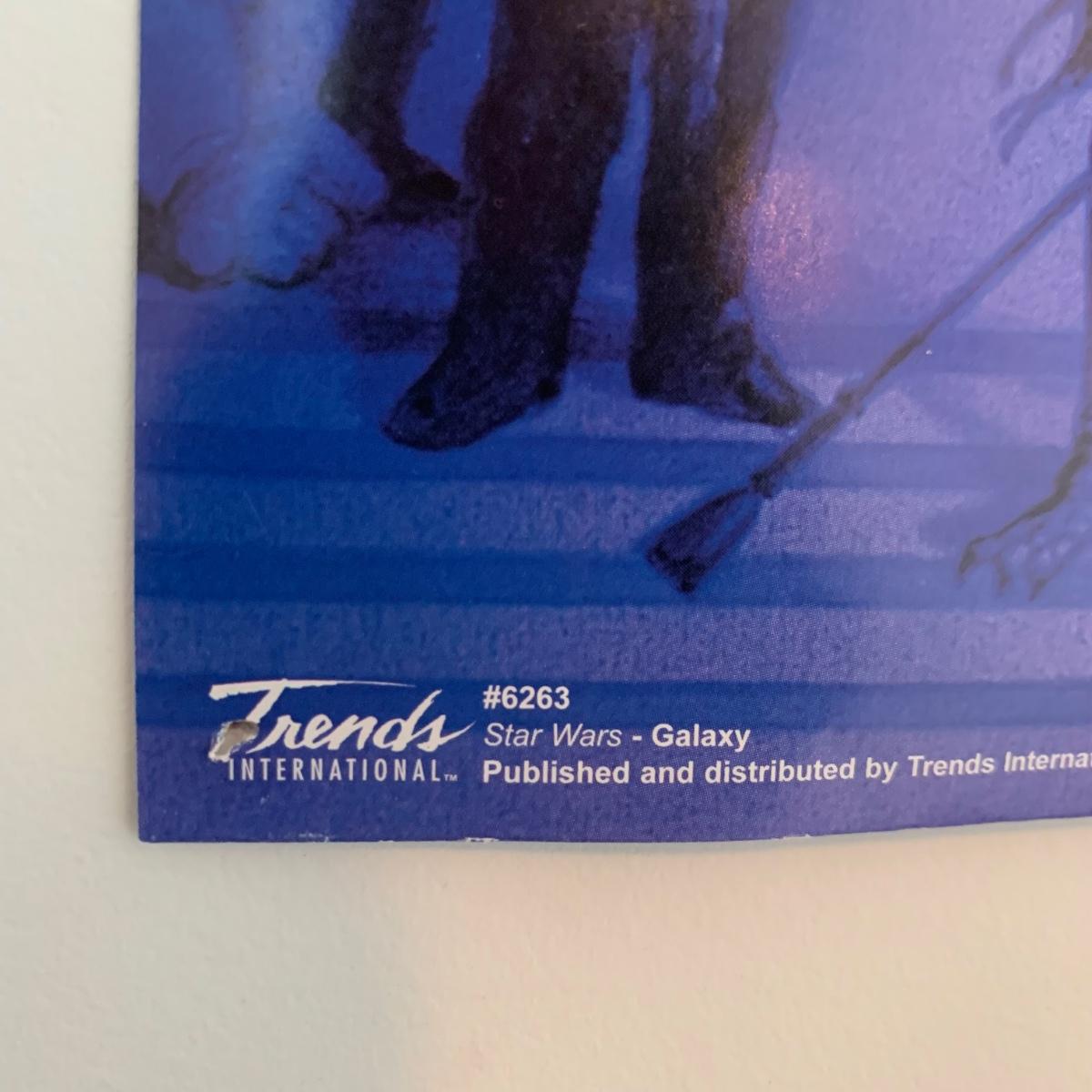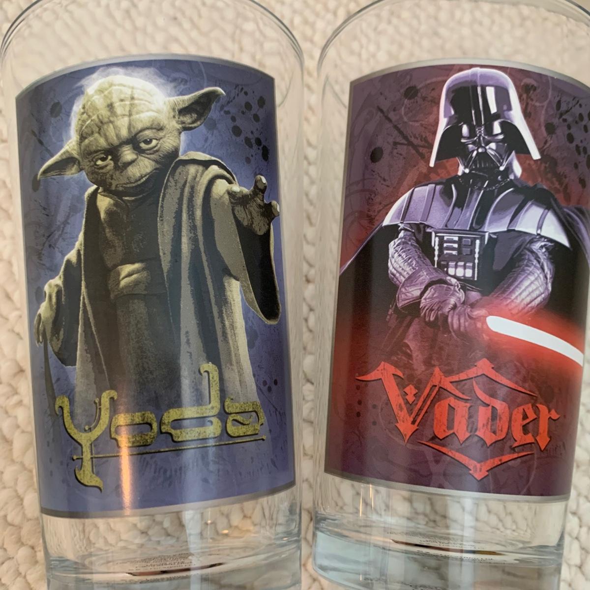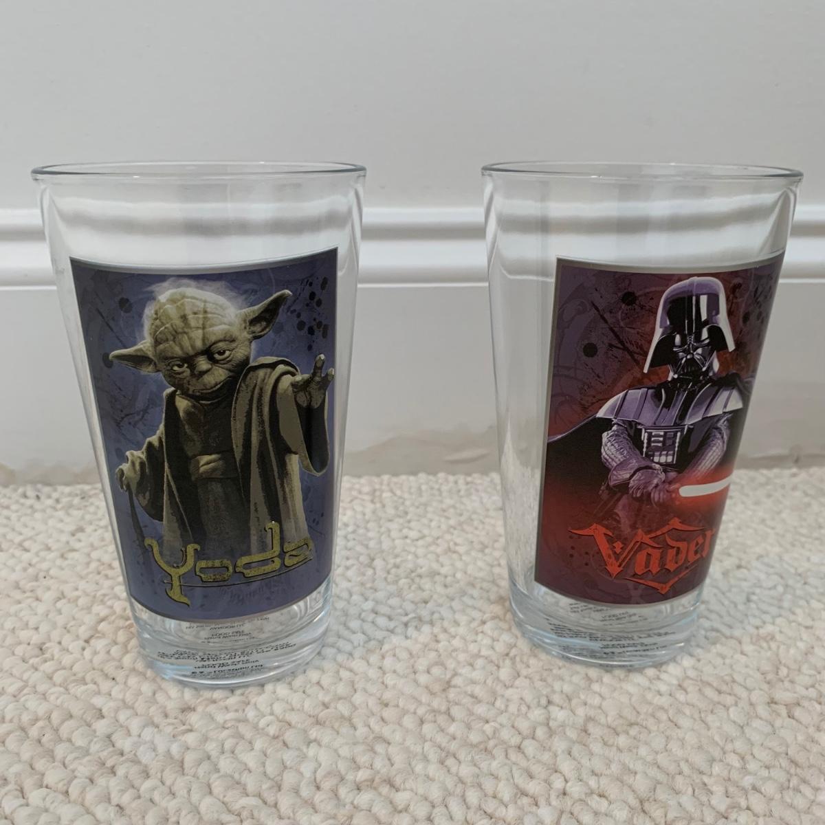 A collection of Star Wars memorabilia. Included are two posters, two glass pint glasses, two Pez dispensers, a Darth Vader Potato Head, and a plastic ring that shows two shifting images. The ‘Trends’ poster is 34” x 22”. It has been on a wall and has holes in all four corners. The ‘Coca-Cola’ poster is rolled and shows some damage around the edge.