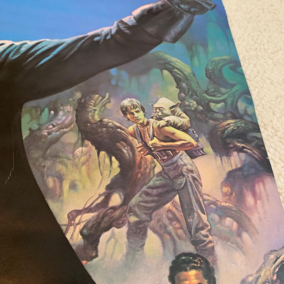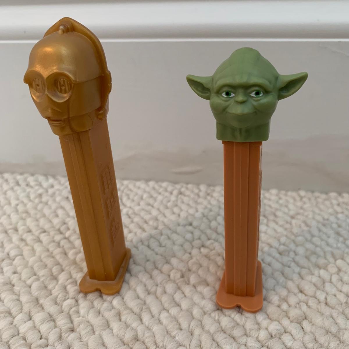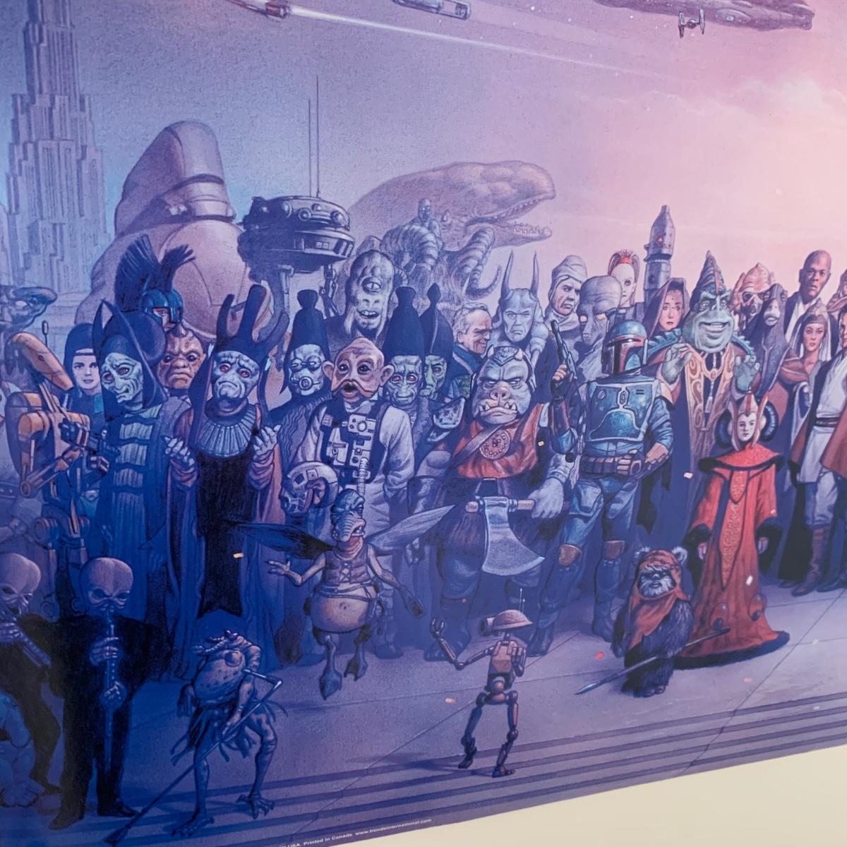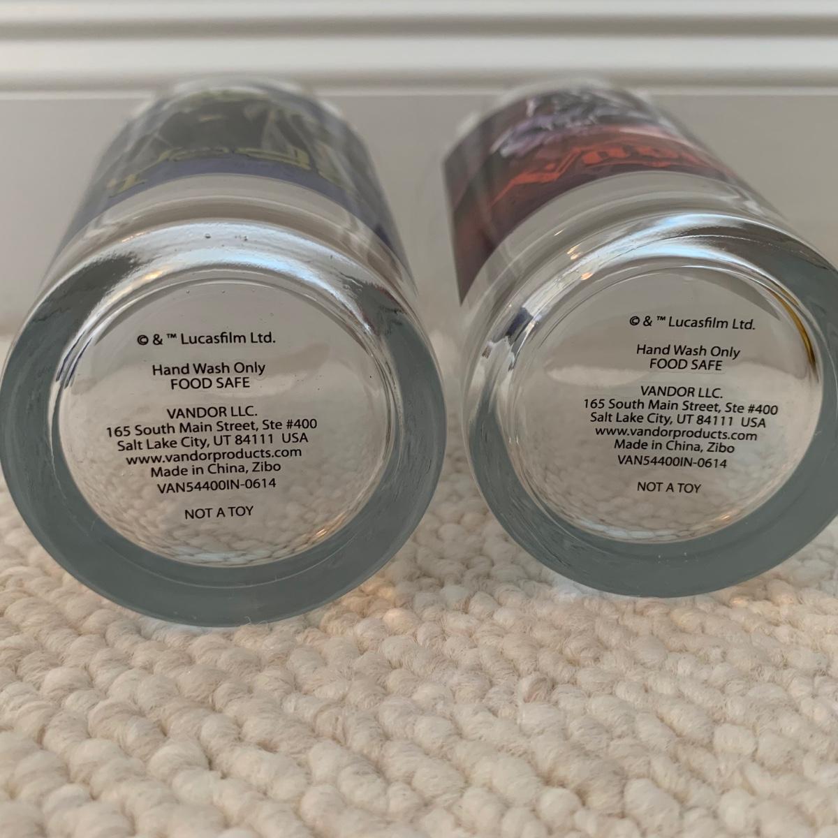 A collection of Star Wars memorabilia. Included are two posters, two glass pint glasses, two Pez dispensers, a Darth Vader Potato Head, and a plastic ring that shows two shifting images. The ‘Trends’ poster is 34” x 22”. It has been on a wall and has holes in all four corners. The ‘Coca-Cola’ poster is rolled and shows some damage around the edge.