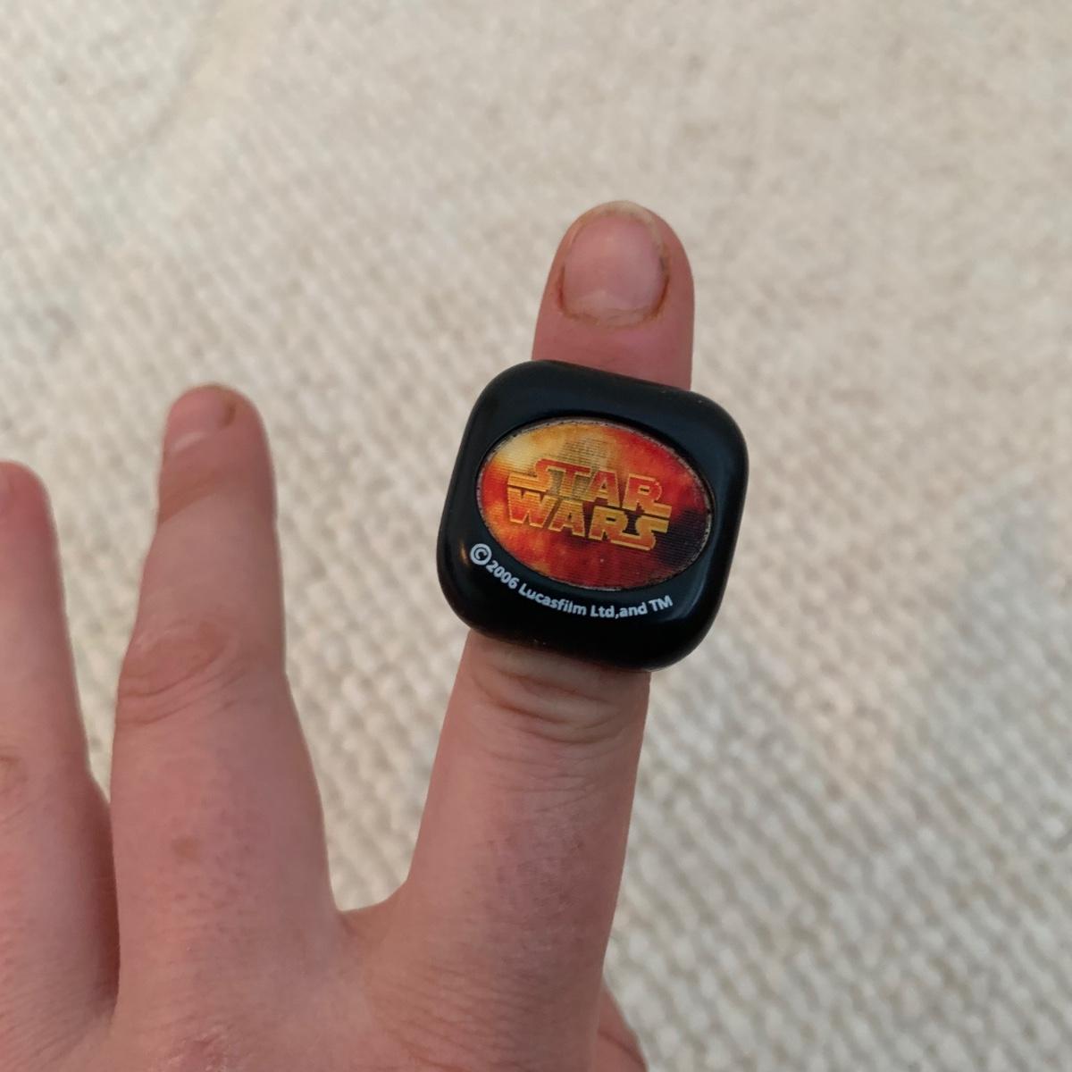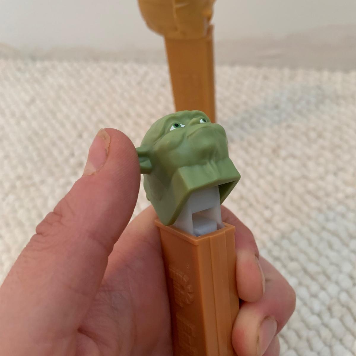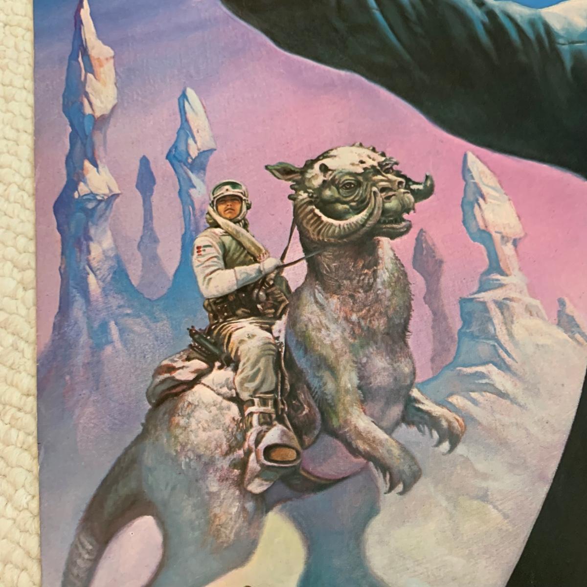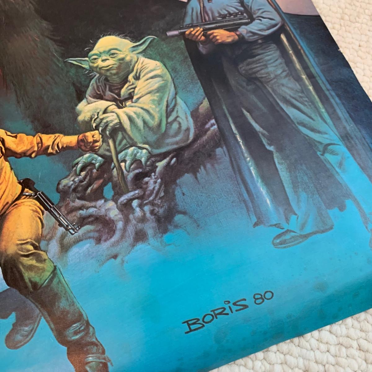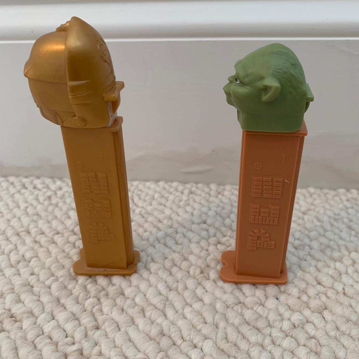 A collection of Star Wars memorabilia. Included are two posters, two glass pint glasses, two Pez dispensers, a Darth Vader Potato Head, and a plastic ring that shows two shifting images. The ‘Trends’ poster is 34” x 22”. It has been on a wall and has holes in all four corners. The ‘Coca-Cola’ poster is rolled and shows some damage around the edge.