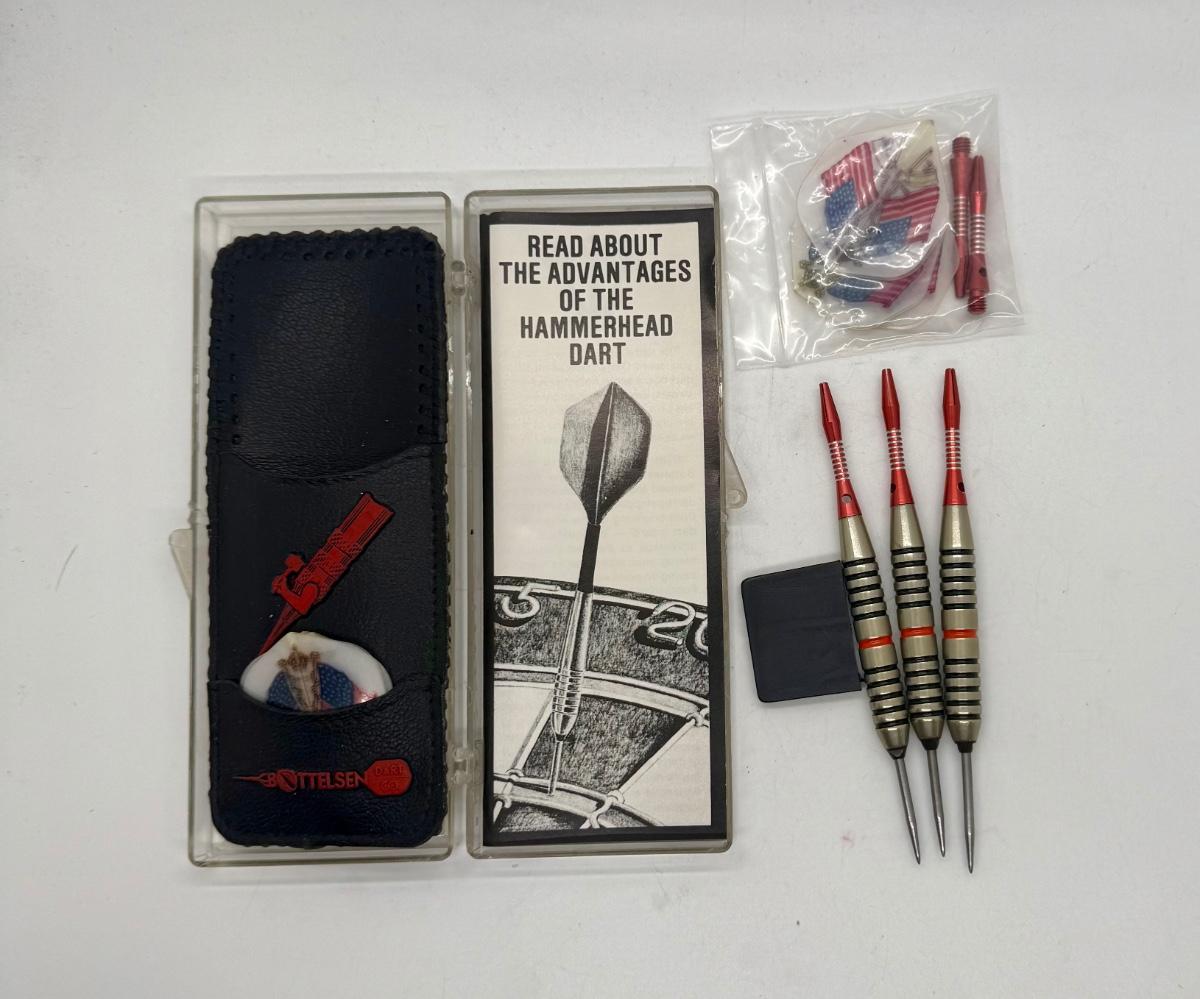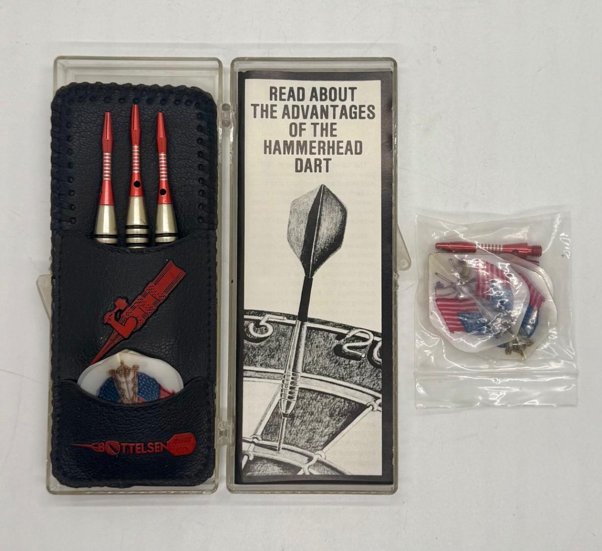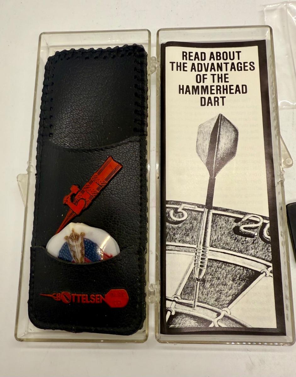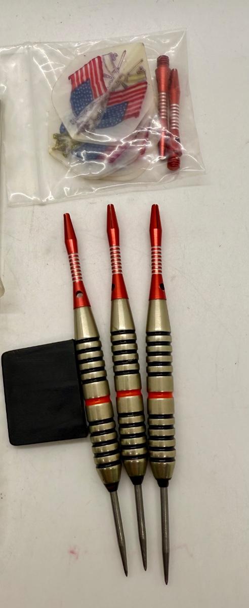 Set of 3 darts, with pocket carry case and extra set of tail fletch fins. Look to be in unused condition. With product booklet and plastic storage case.