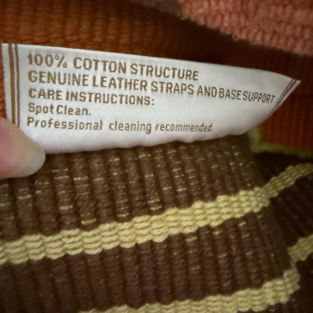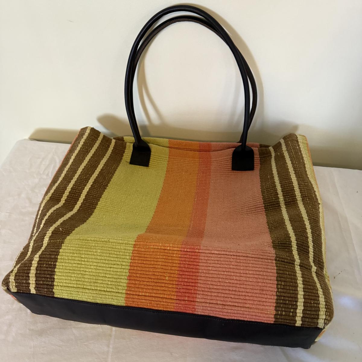This lot contains a stunning handwoven tote bag by Dash & Albert Rug Co. this bag is 100% cotton with leather straps. It measures 17.5” x 6” x 24”H. Shipping available.