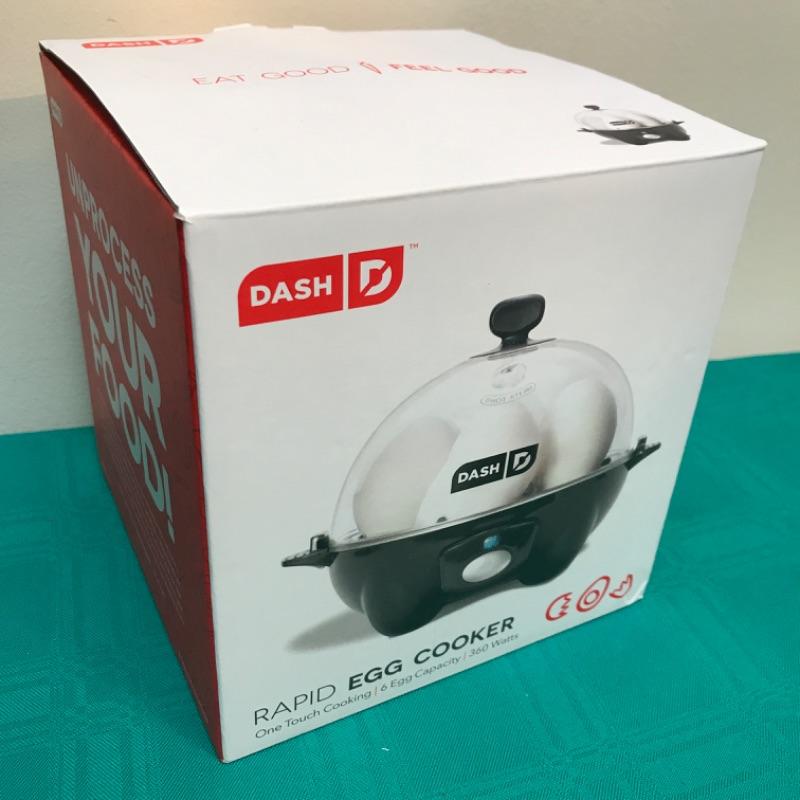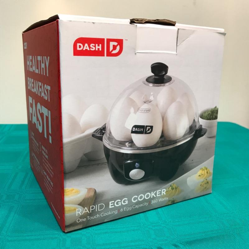 Dash rapid egg cooker. This has a six egg capacity, and is brand new in the box. The box measures approximately 6.25“ x 6.25“x 6.25“.