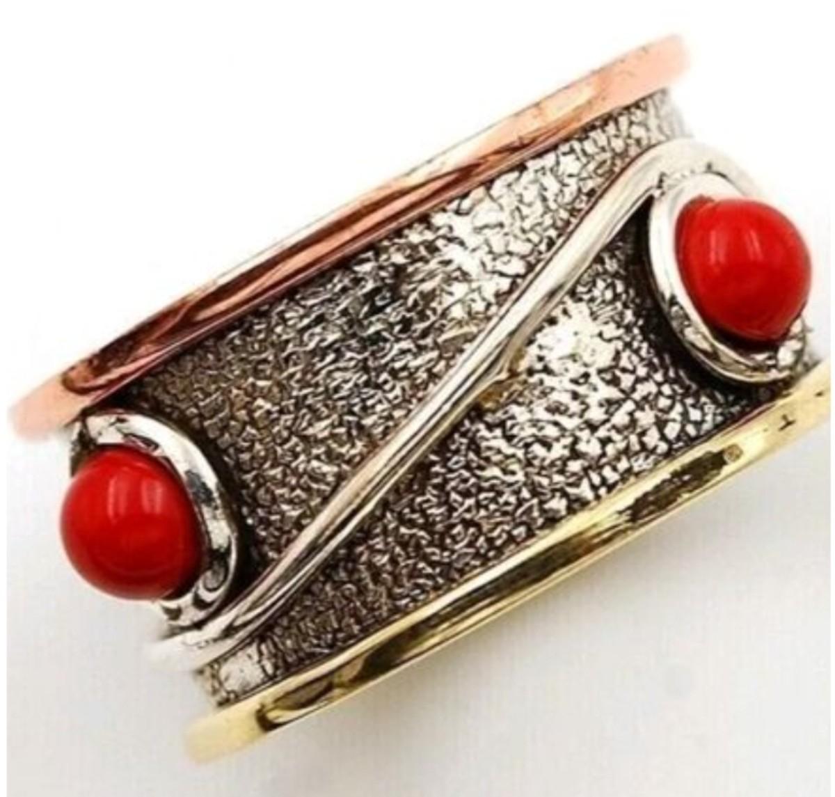 DAT - Three Tone Natural Red Coral 925 Sterling Silver Ring Sz 7.5