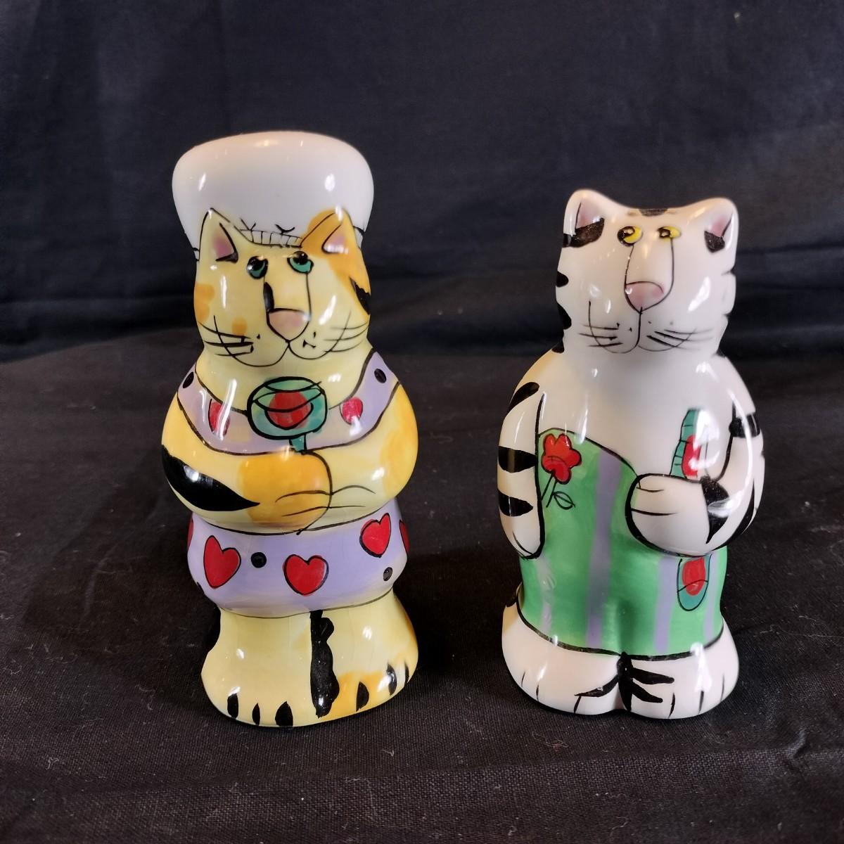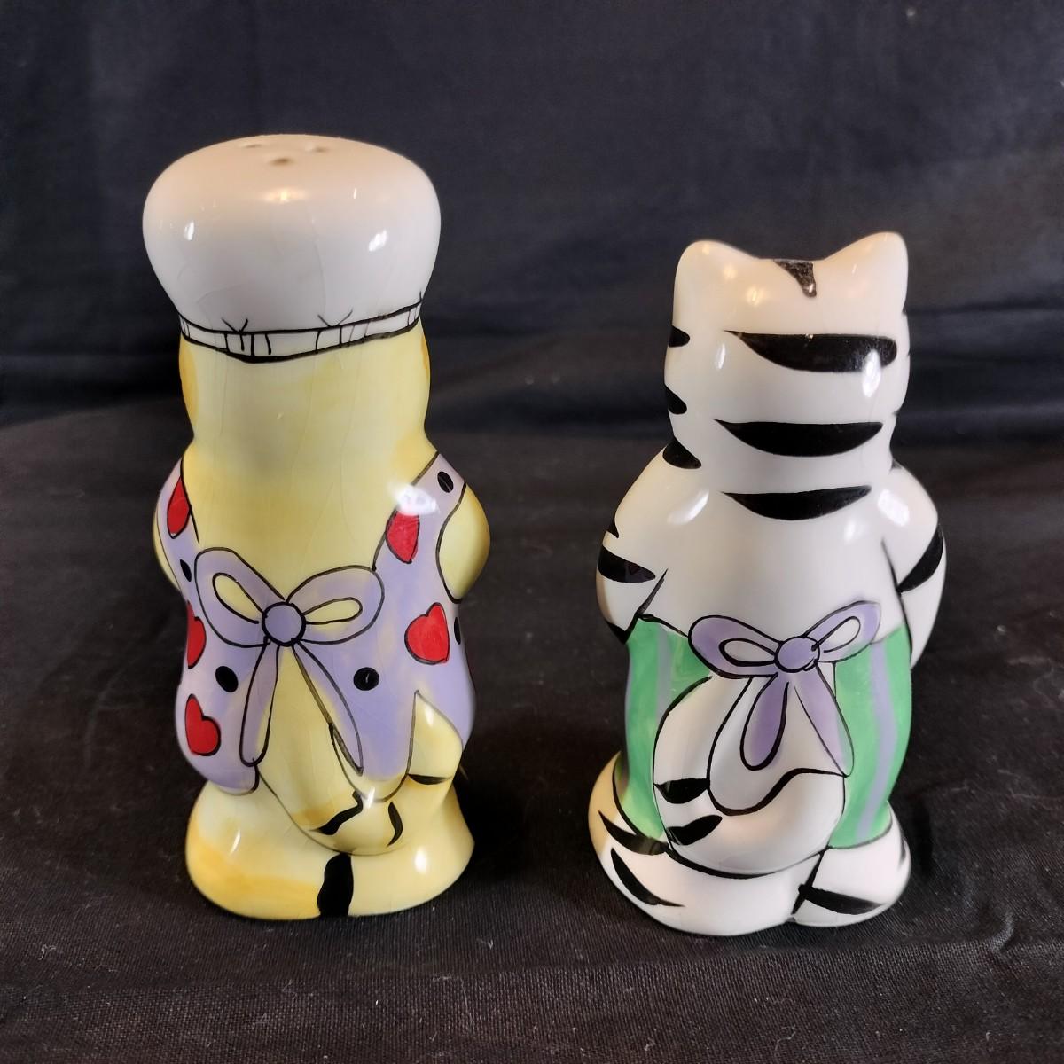 This auction lot is for a Dating Cat Salt and Pepper Shakers. This pair of kitties are whimsically romancing each other with hearts and flowers. They are ceramic and measure about 4 and 4.5-inches tall. Great set for a cat lover - just in time for Valentines Day! They are in like new condition.