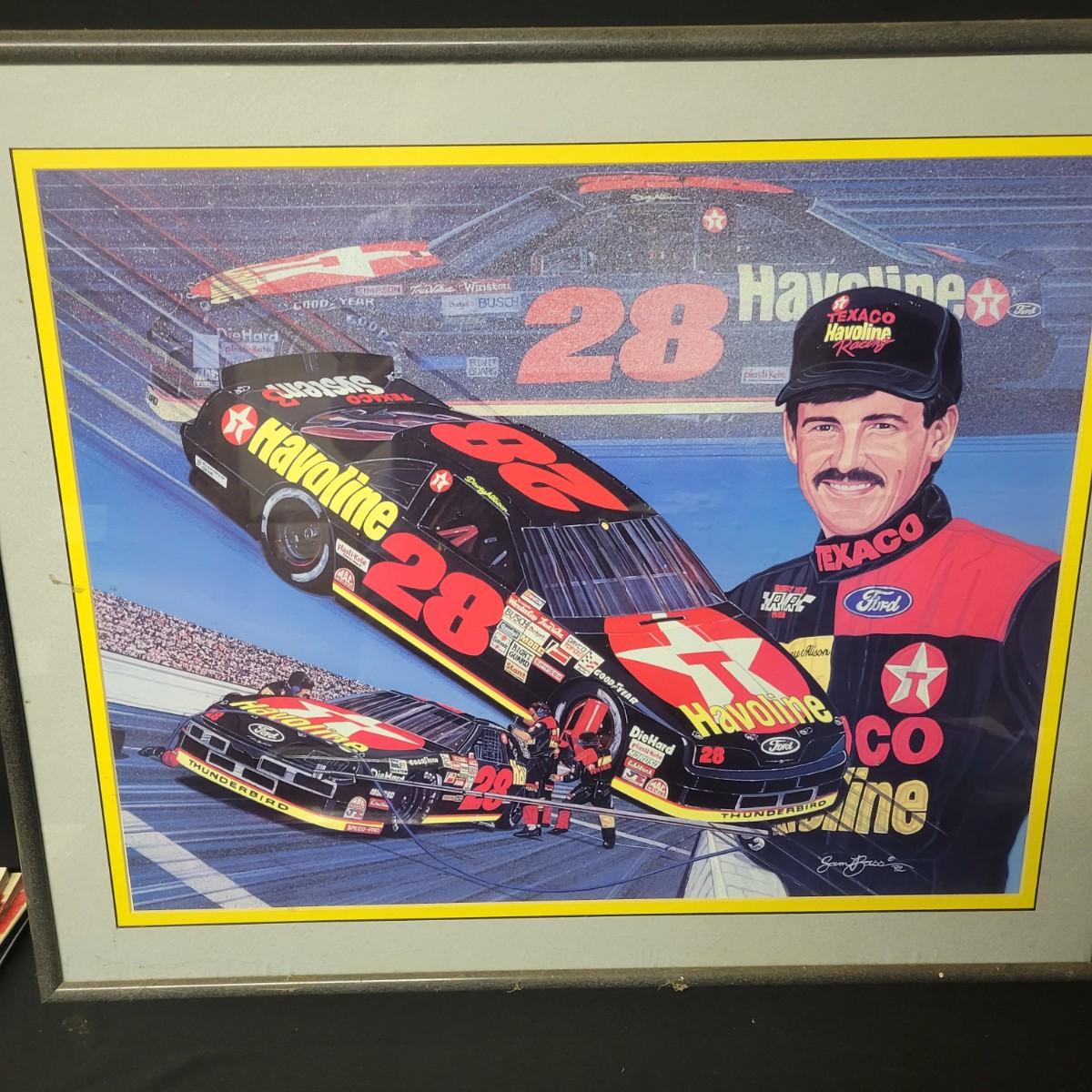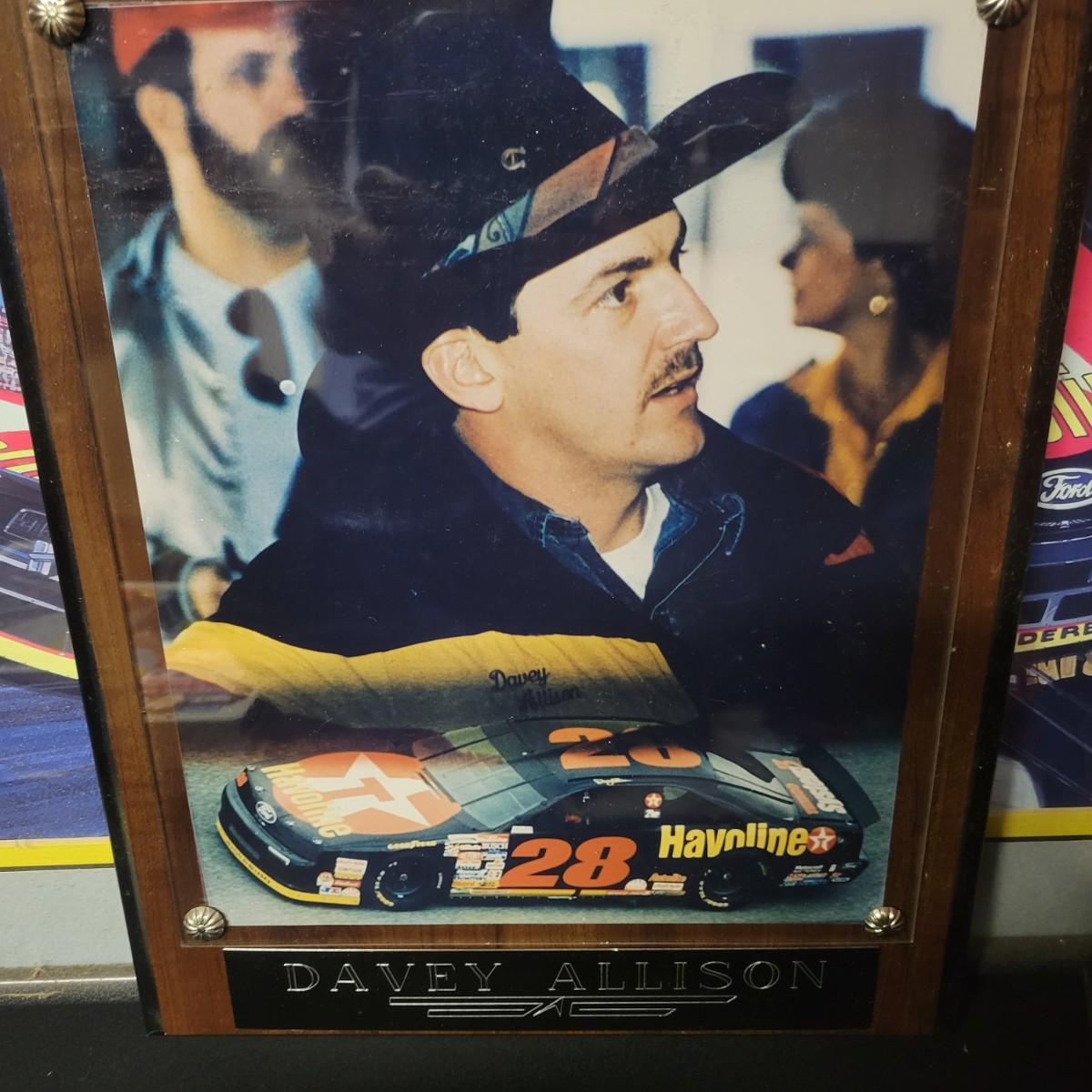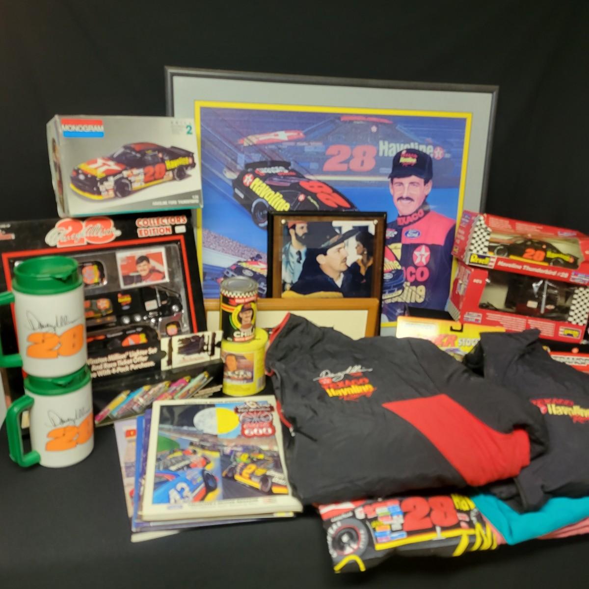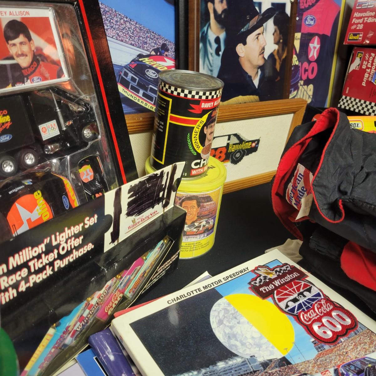 A huge assortment of Nascar Davey Allison memorabilia. This lot includes 1:24 scale die cast models in good condition, but damaged packaging. Unboxed trailer has a broken wheel. Model, books, race memorabilia, 2 jackets, 3 polo shirts and 4 t-shirts. An assortment of cards included a dollar bill signed by Kyle Petty. Framed print of Davey Allison in a black metal frame measuring approximately 24" x 28" x 1". Food items are expired and are only for collectable value. Clothing items are L or XL.