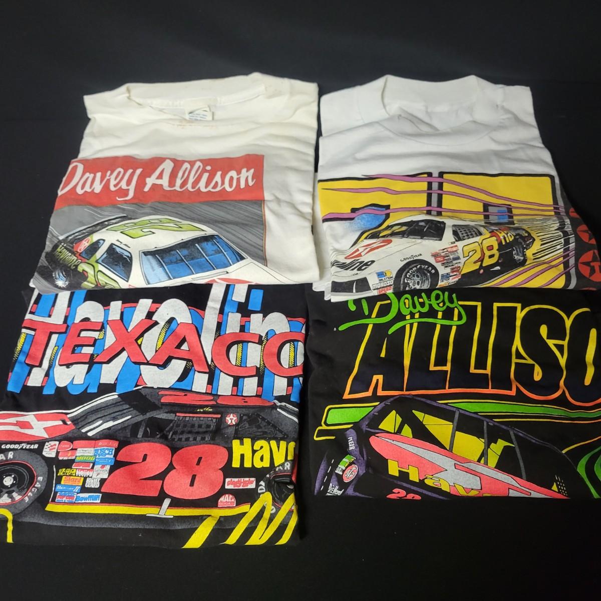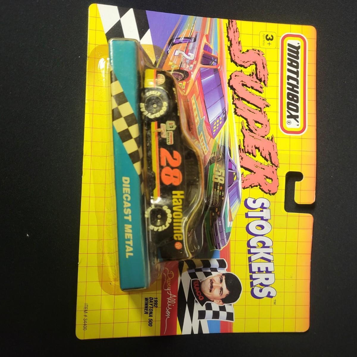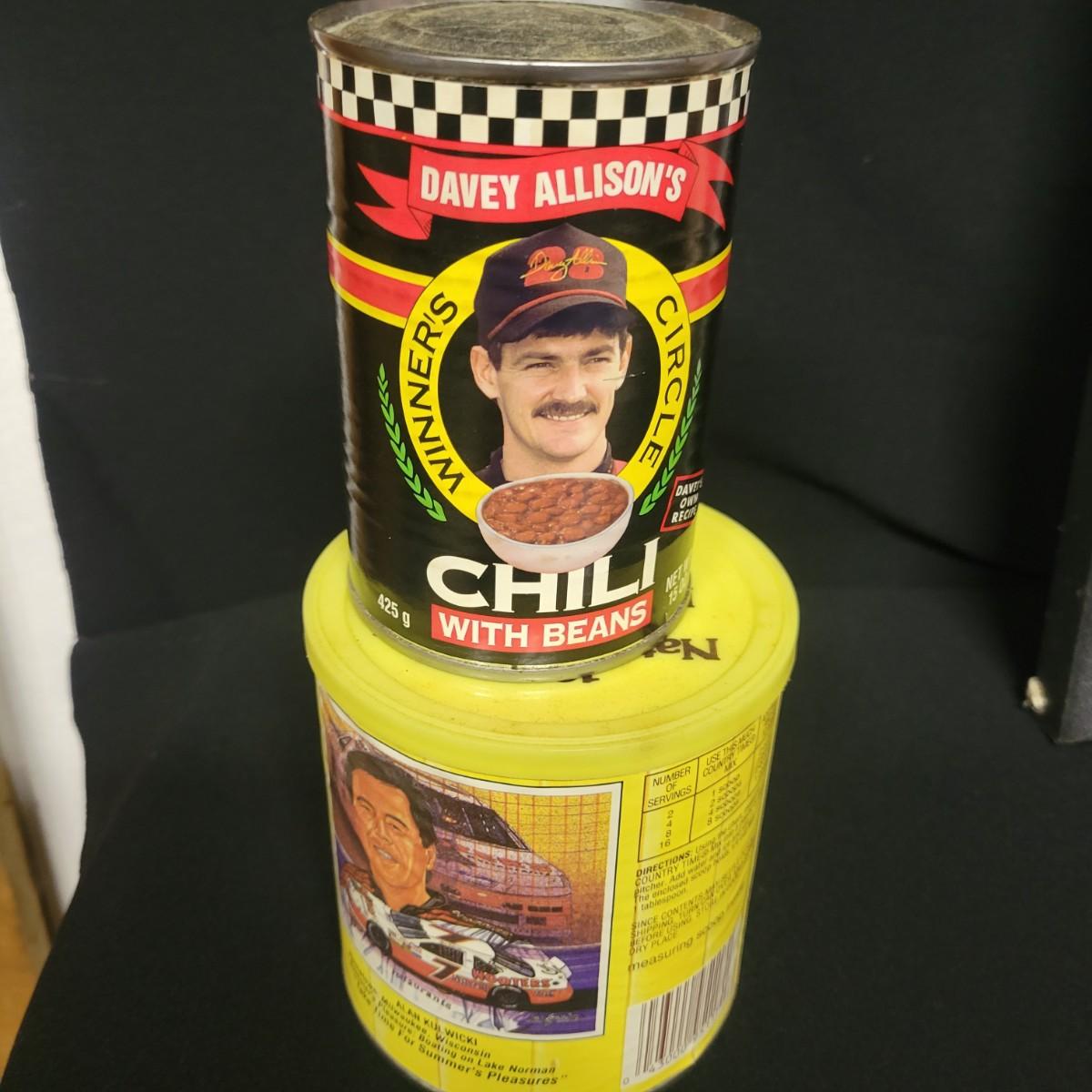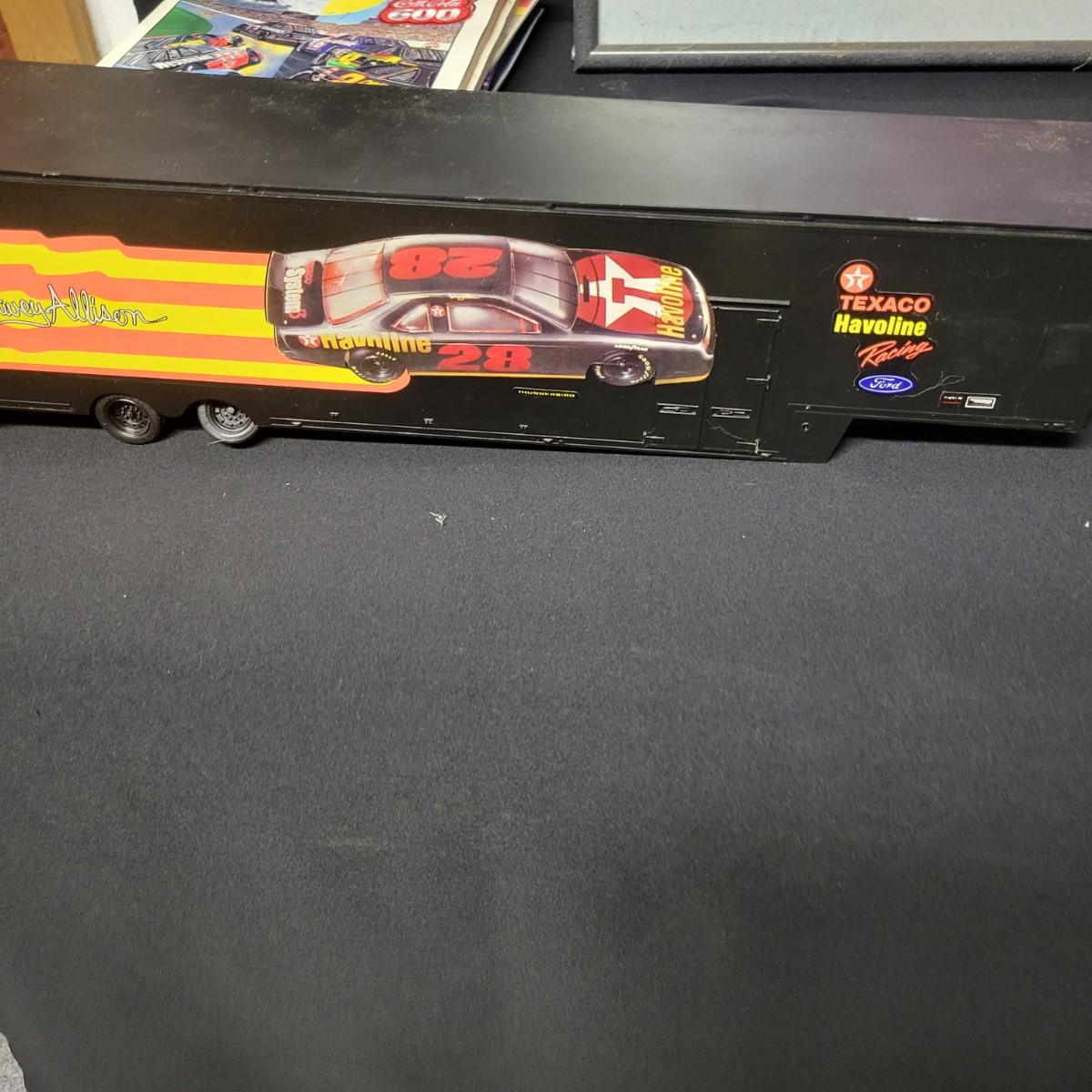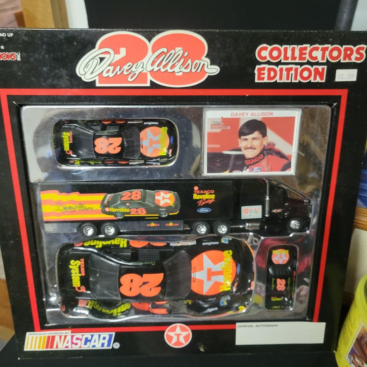 A huge assortment of Nascar Davey Allison memorabilia. This lot includes 1:24 scale die cast models in good condition, but damaged packaging. Unboxed trailer has a broken wheel. Model, books, race memorabilia, 2 jackets, 3 polo shirts and 4 t-shirts. An assortment of cards included a dollar bill signed by Kyle Petty. Framed print of Davey Allison in a black metal frame measuring approximately 24" x 28" x 1". Food items are expired and are only for collectable value. Clothing items are L or XL.
