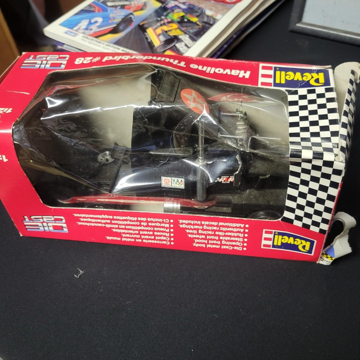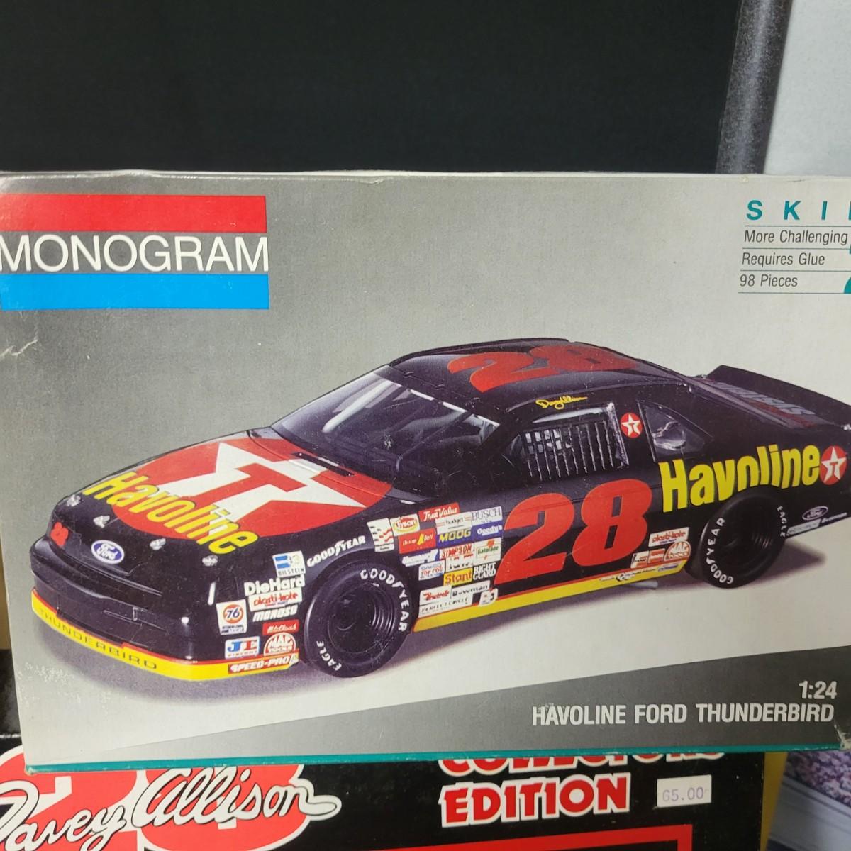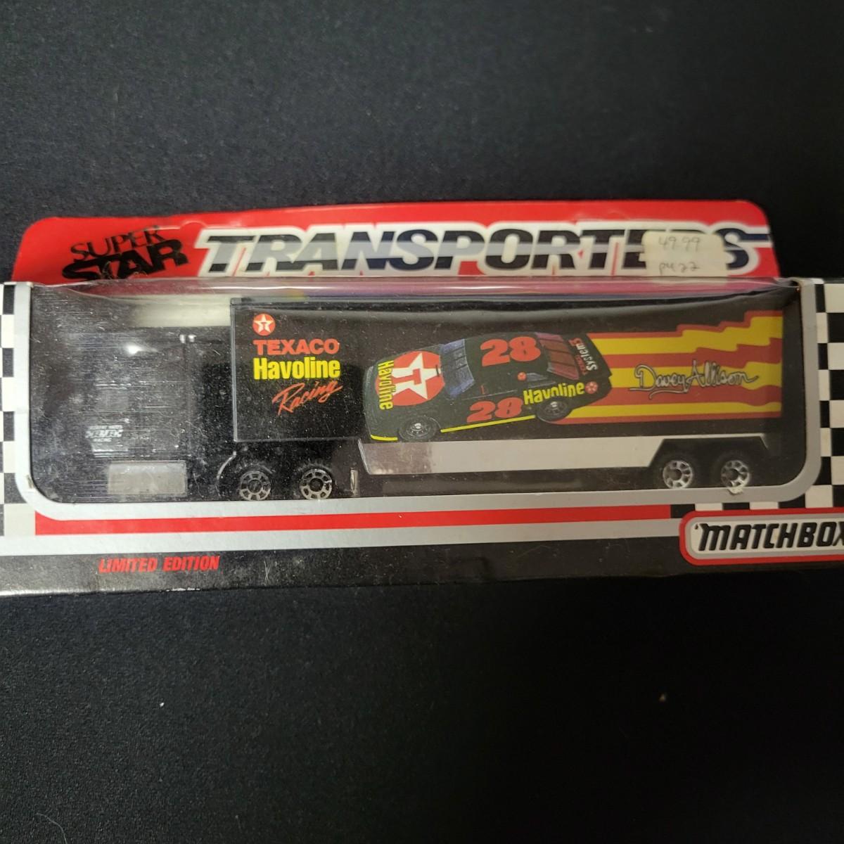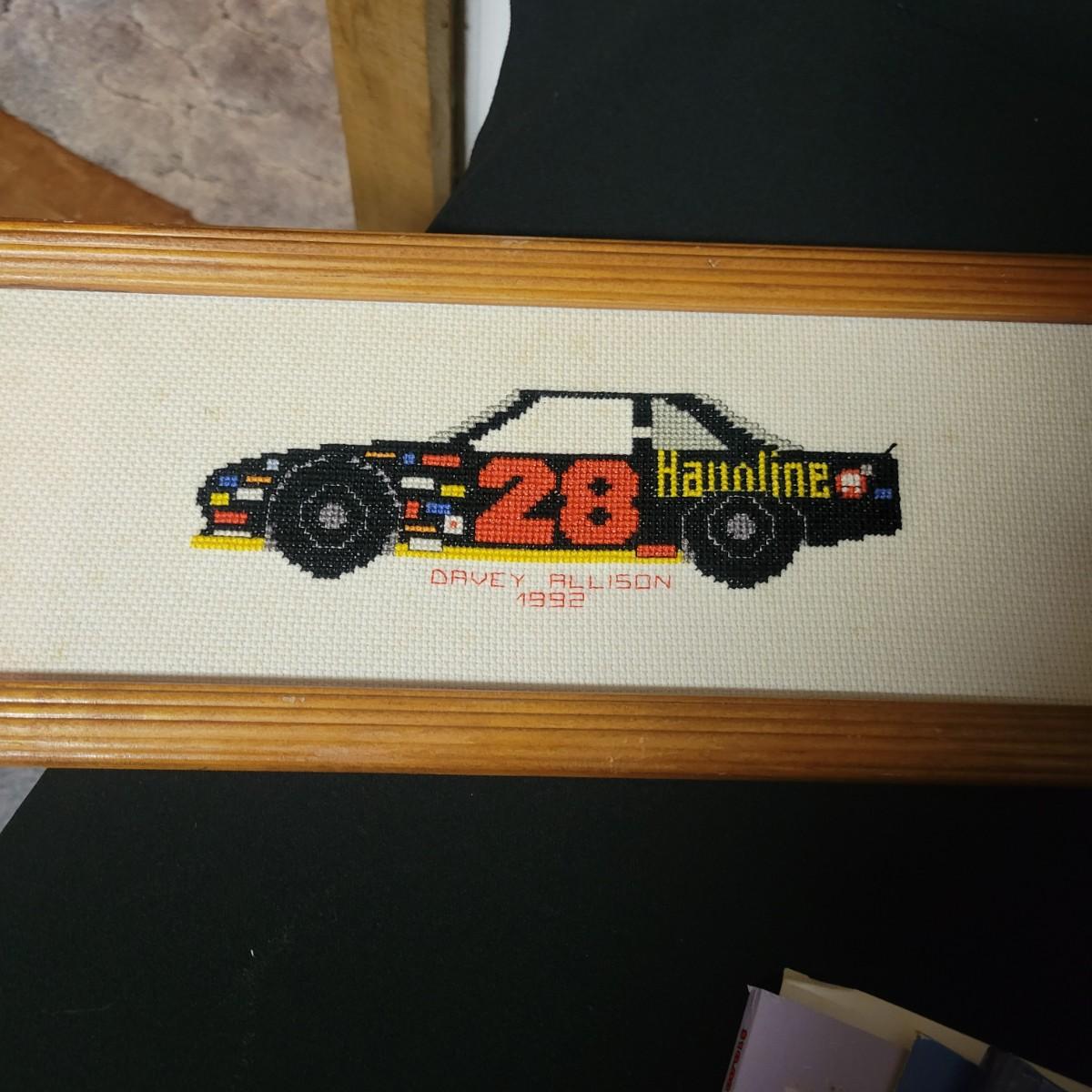 A huge assortment of Nascar Davey Allison memorabilia. This lot includes 1:24 scale die cast models in good condition, but damaged packaging. Unboxed trailer has a broken wheel. Model, books, race memorabilia, 2 jackets, 3 polo shirts and 4 t-shirts. An assortment of cards included a dollar bill signed by Kyle Petty. Framed print of Davey Allison in a black metal frame measuring approximately 24" x 28" x 1". Food items are expired and are only for collectable value. Clothing items are L or XL.
