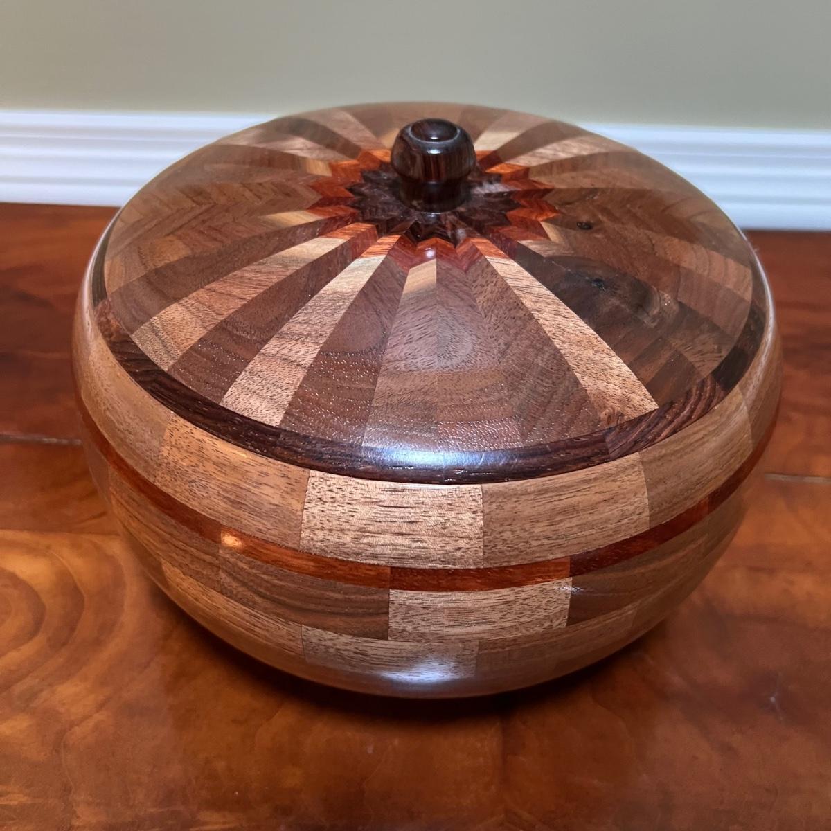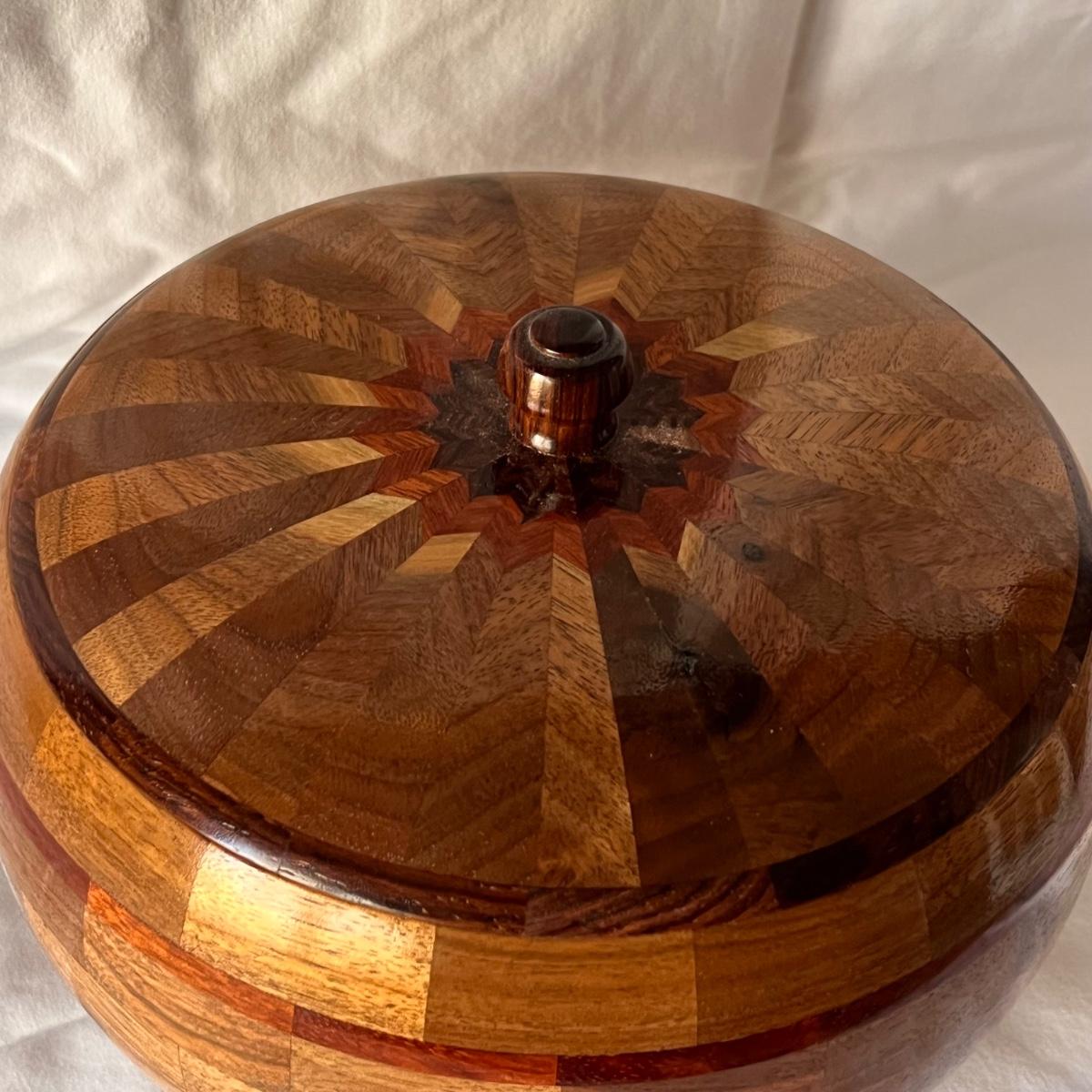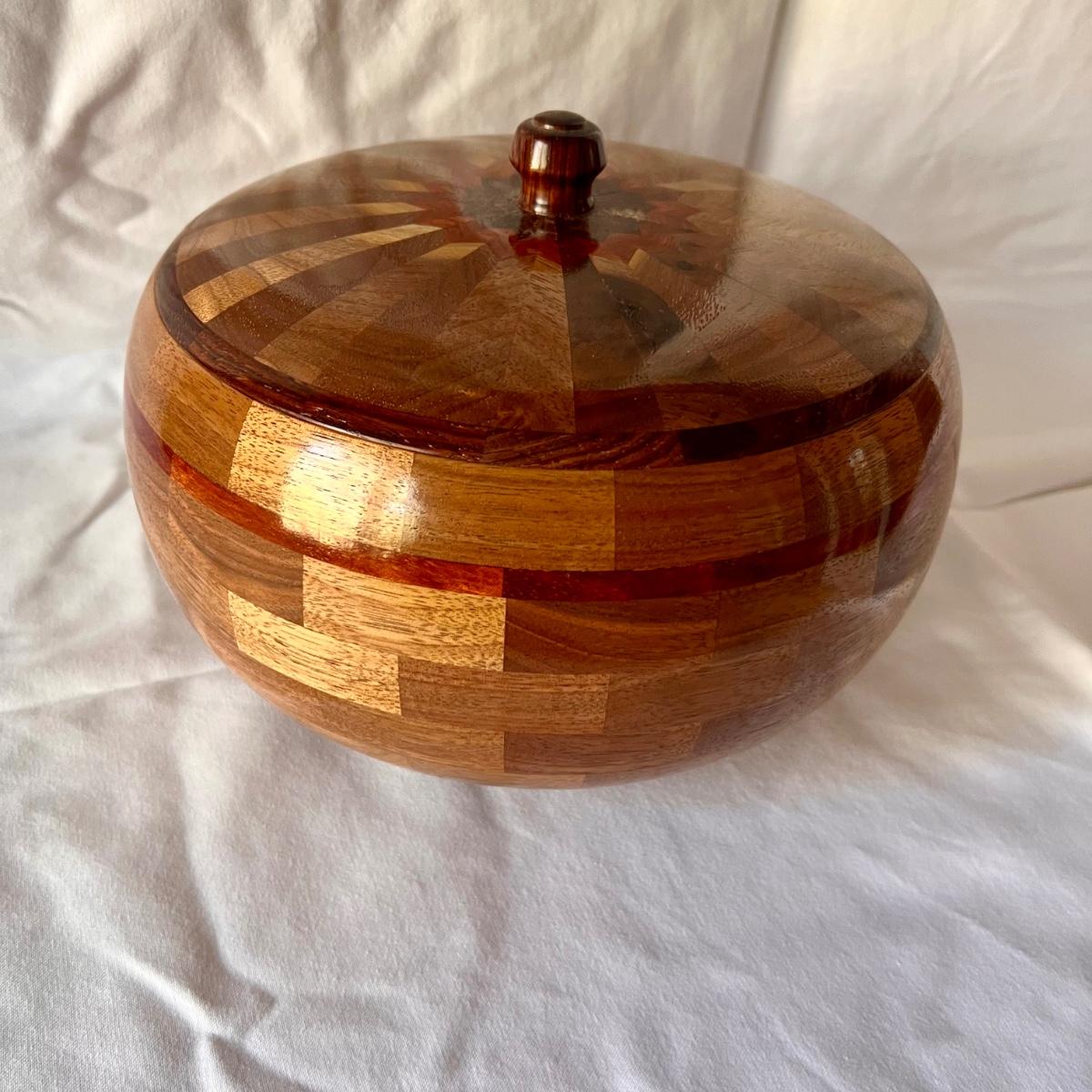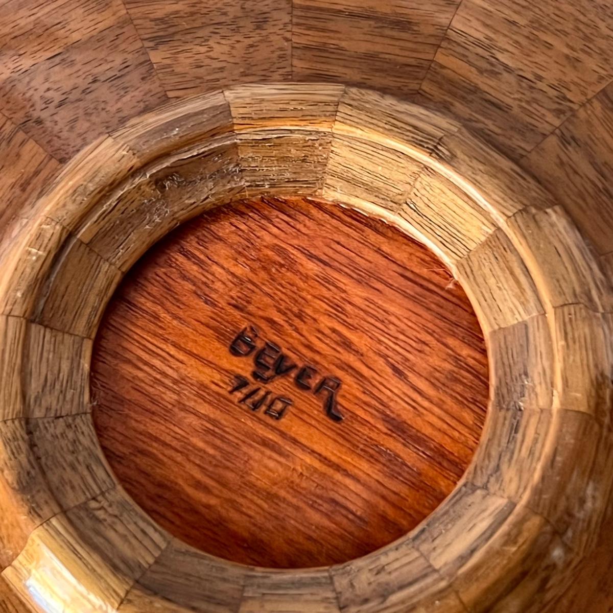 This exquisite lidded wood bowl was made by Dave Beyer. Accompanying paperwork states it is comprised of 210 pieces of walnut, bloodwood and cocobola. Signed on the base.