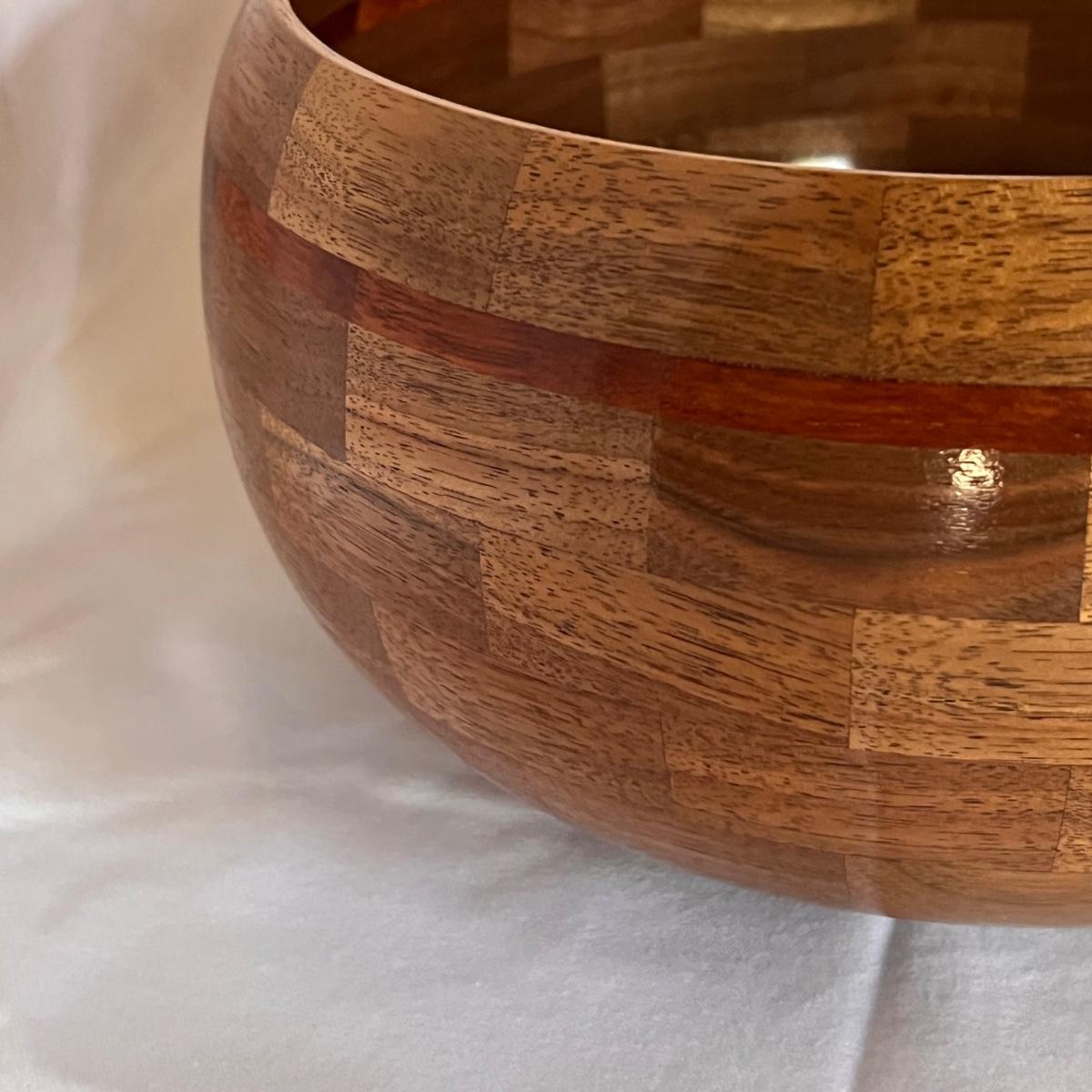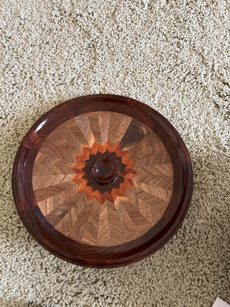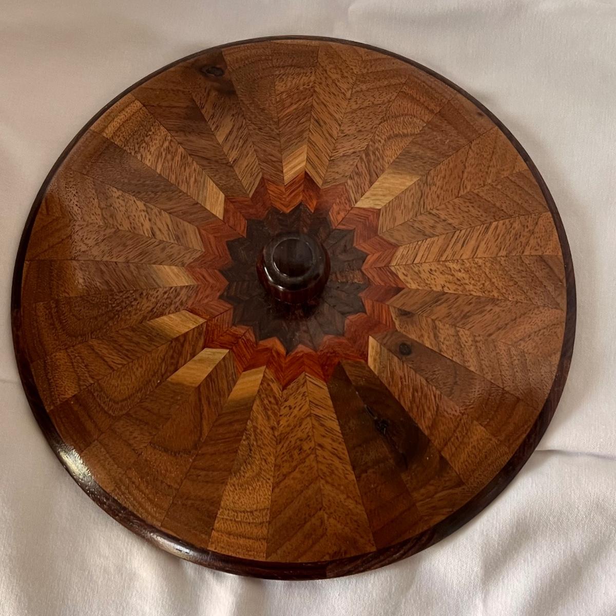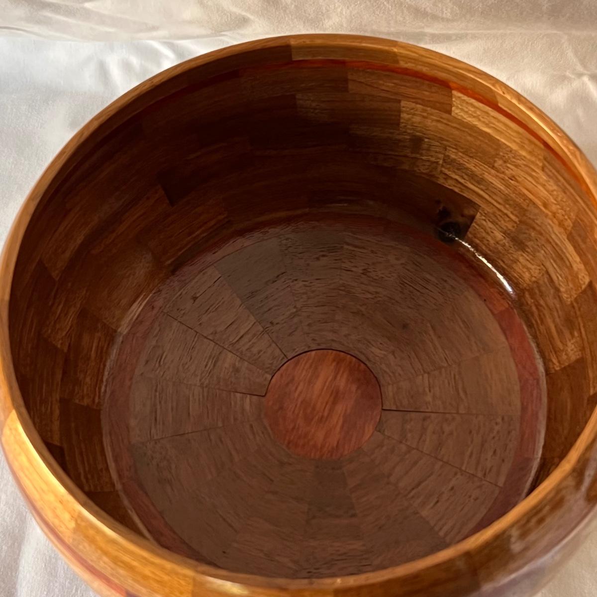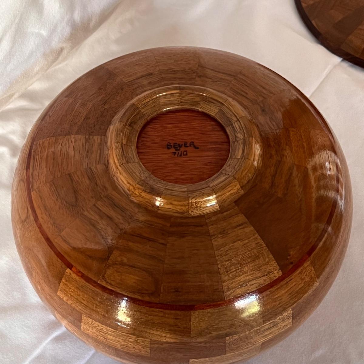 This exquisite lidded wood bowl was made by Dave Beyer. Accompanying paperwork states it is comprised of 210 pieces of walnut, bloodwood and cocobola. Signed on the base.