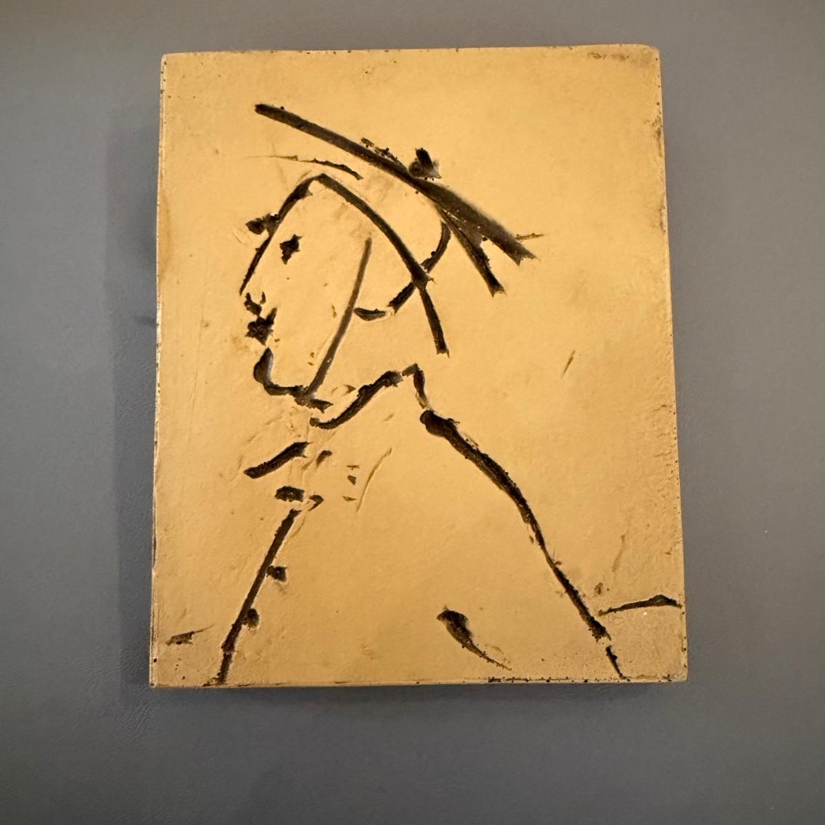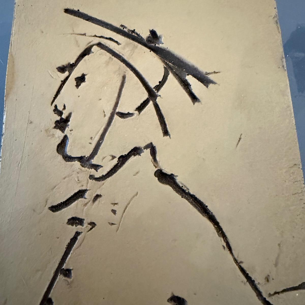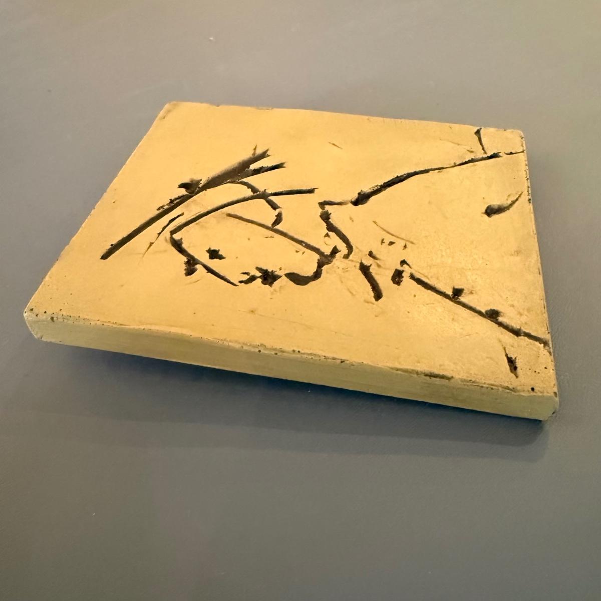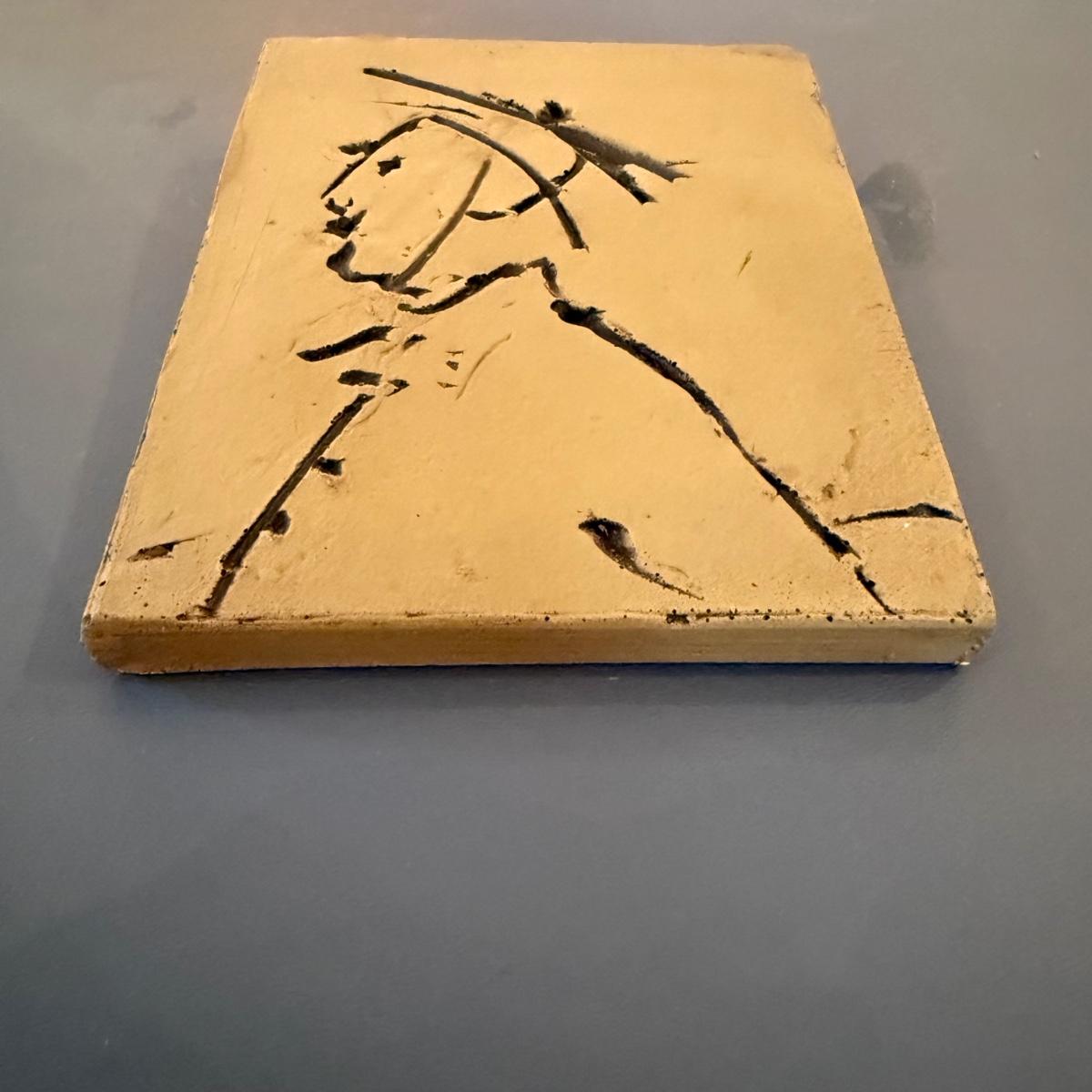 This appears to be an incised drawing on clay by David Bryce. It measures 4.25” x 5.25”H and it is approximately 1/2 inch thick.