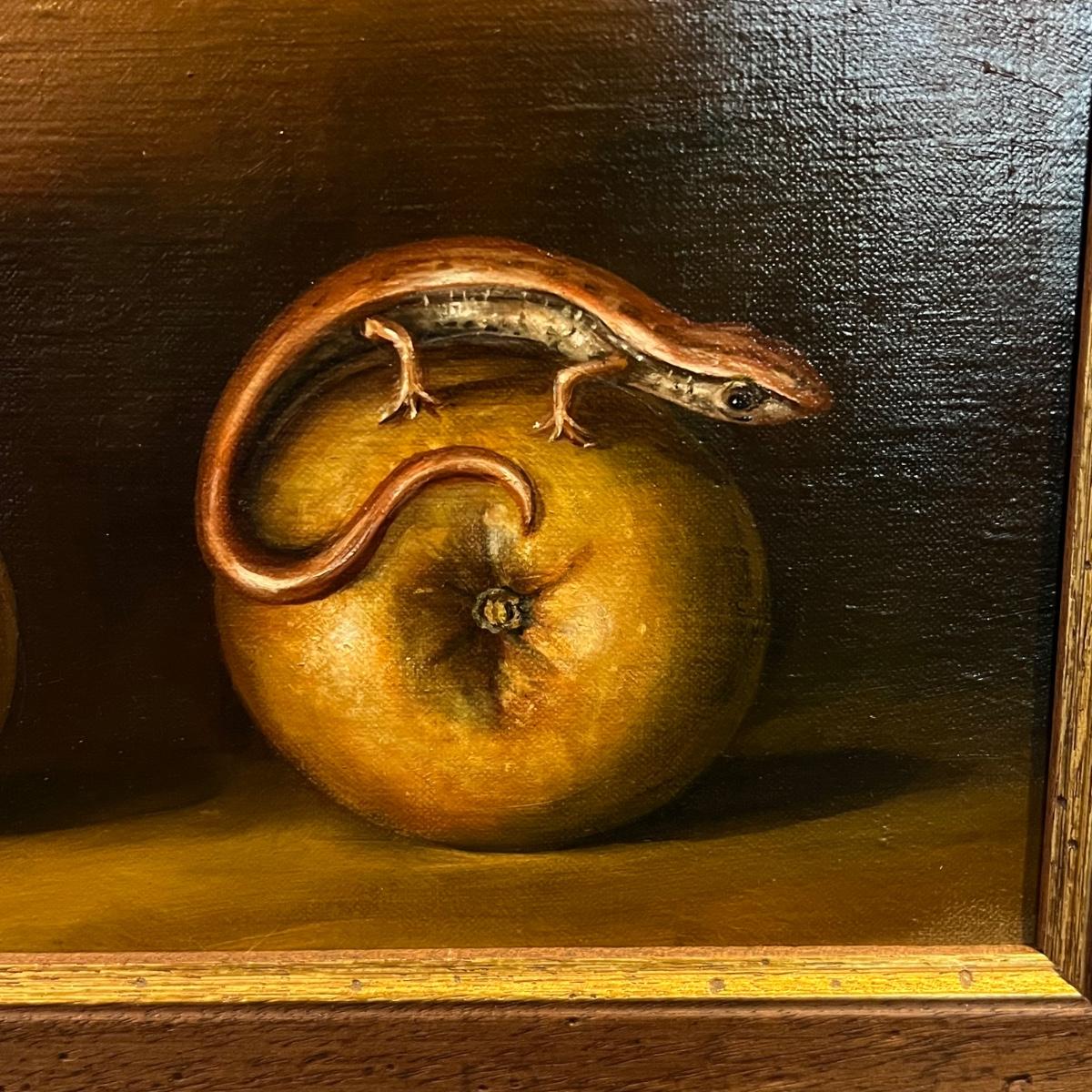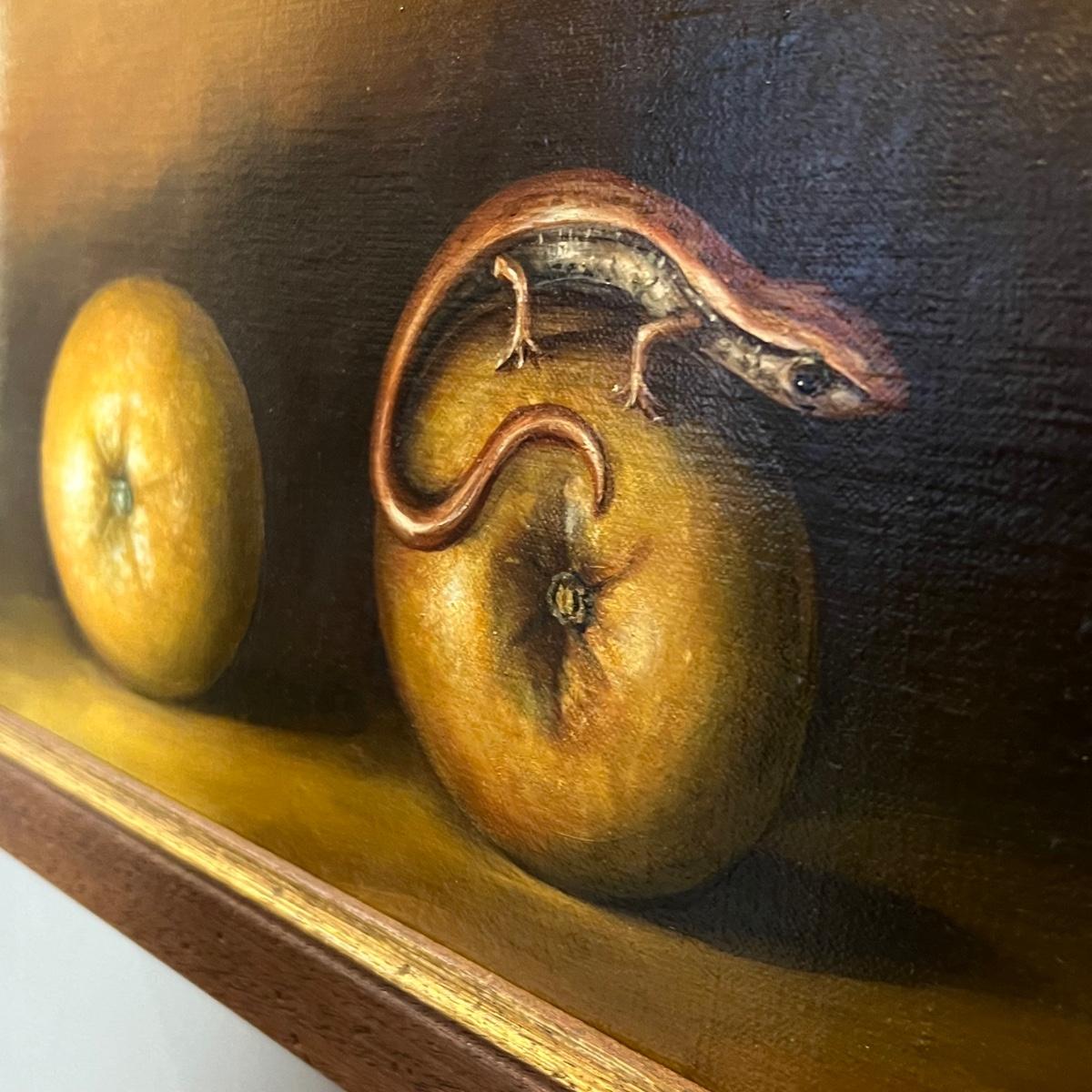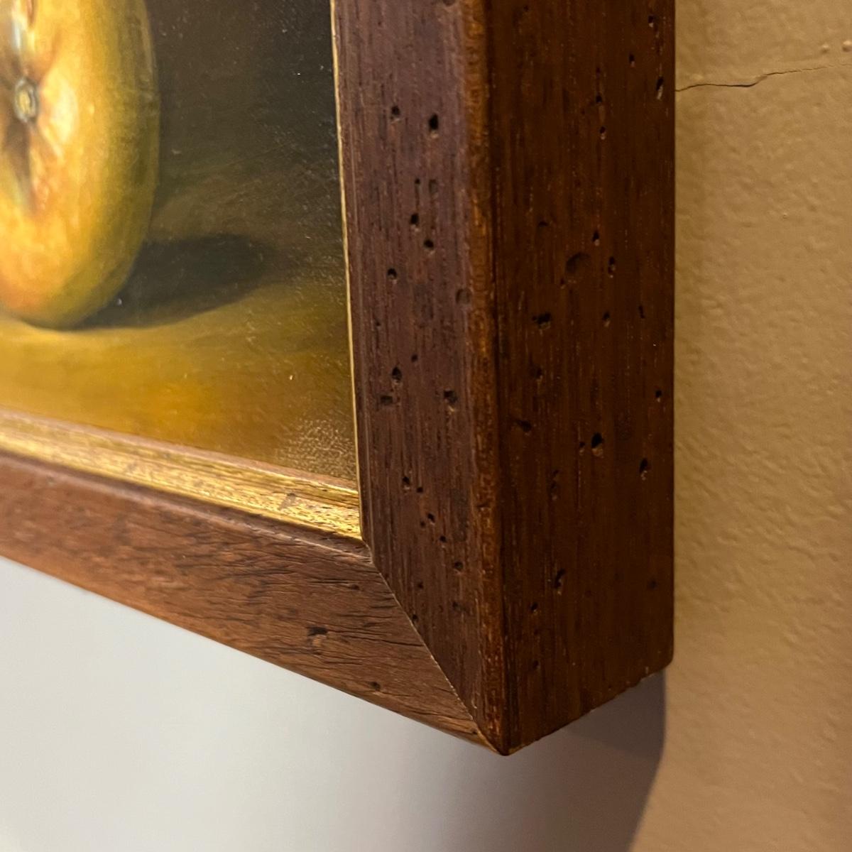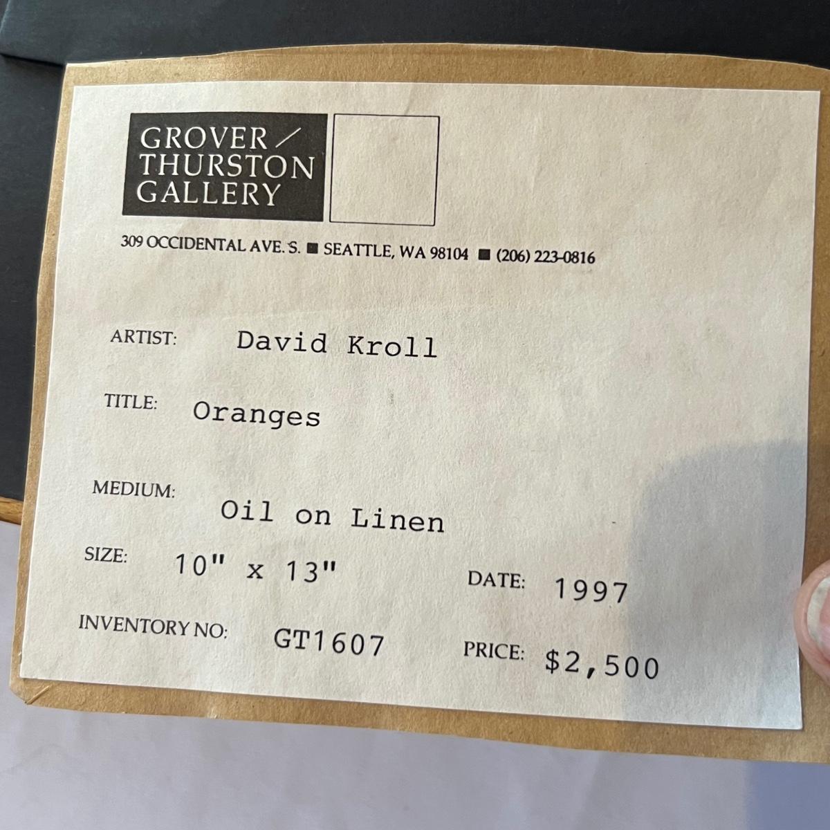 Striking original oil painting. Information found with art lists David Kroll as the artist and the title of the art as "Oranges". Mounted (no glass) in a lovely deep wood frame which measures 15” x 2” x 12”H.