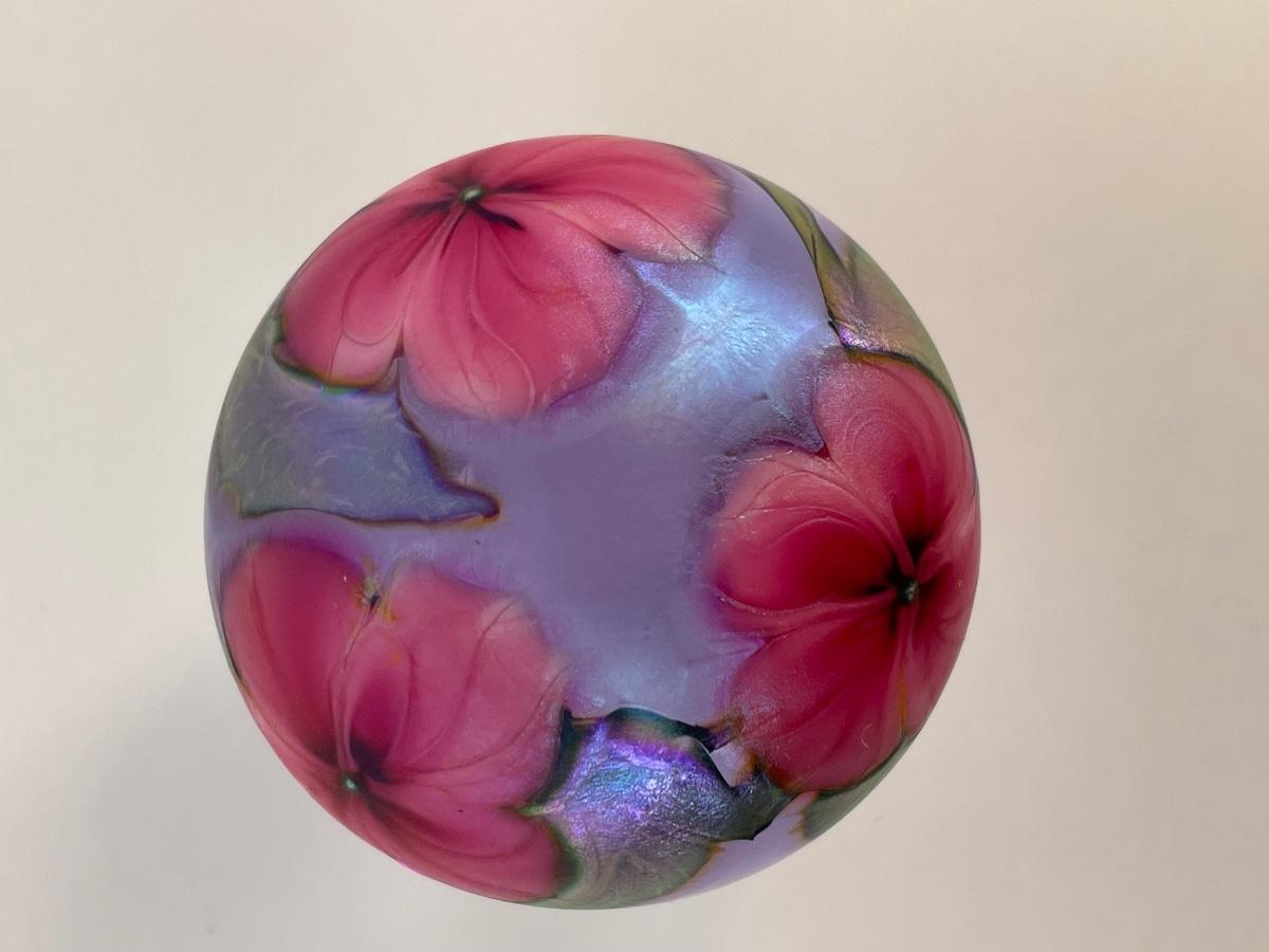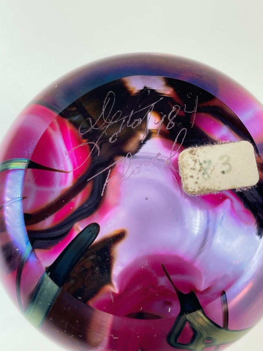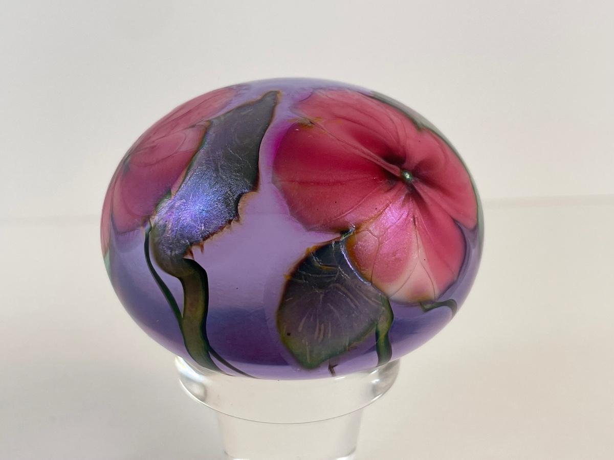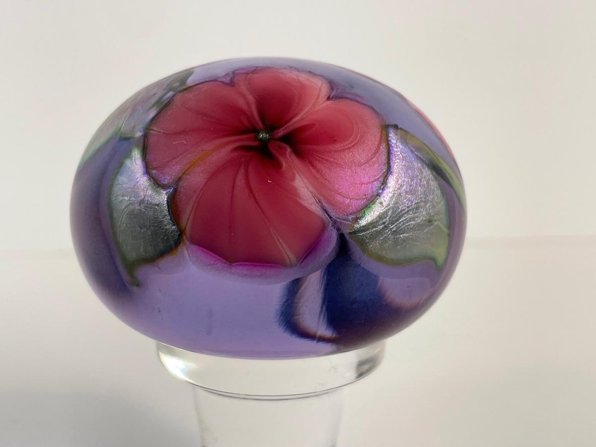 1984 David Lotton pink flowers on translucent amethyst paperweight. Etched on bottom "D Lotton 1984 Floral" 2 1/4" x 2 3/4"