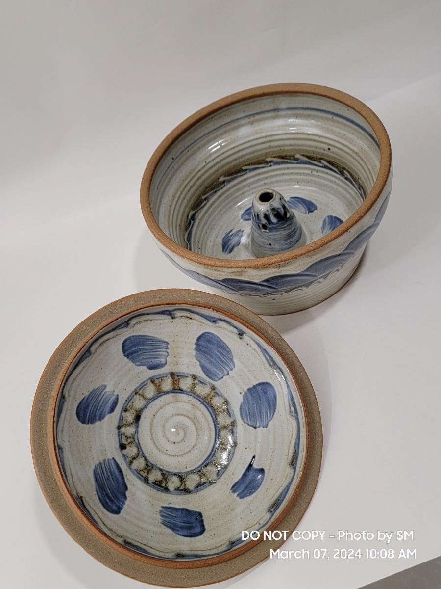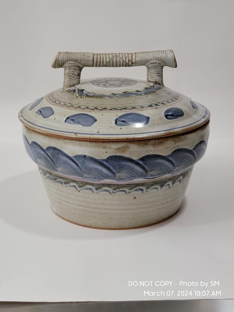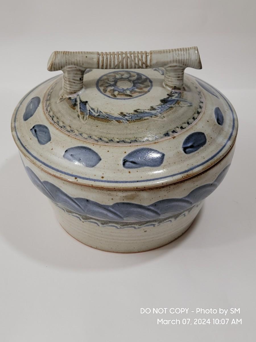 Fabulous David Norton Hand Thrown Steamer Pot Stoneware Pottery Blue and white or tann-ish. No chips no cracks.