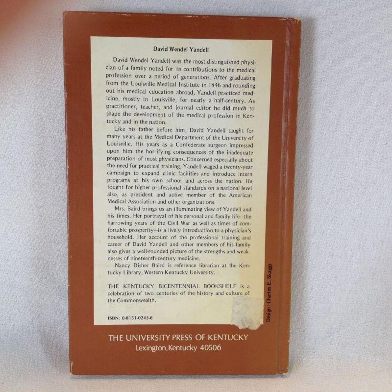 "David Wendel Yandell Physcian of Old Louisville" by Nancy Disher Baird. 1978. University of Kentucky Press. 155 pages. Hardcover, dust jacket shows some shelf and reading wear. Part of the Bicentennial collection.